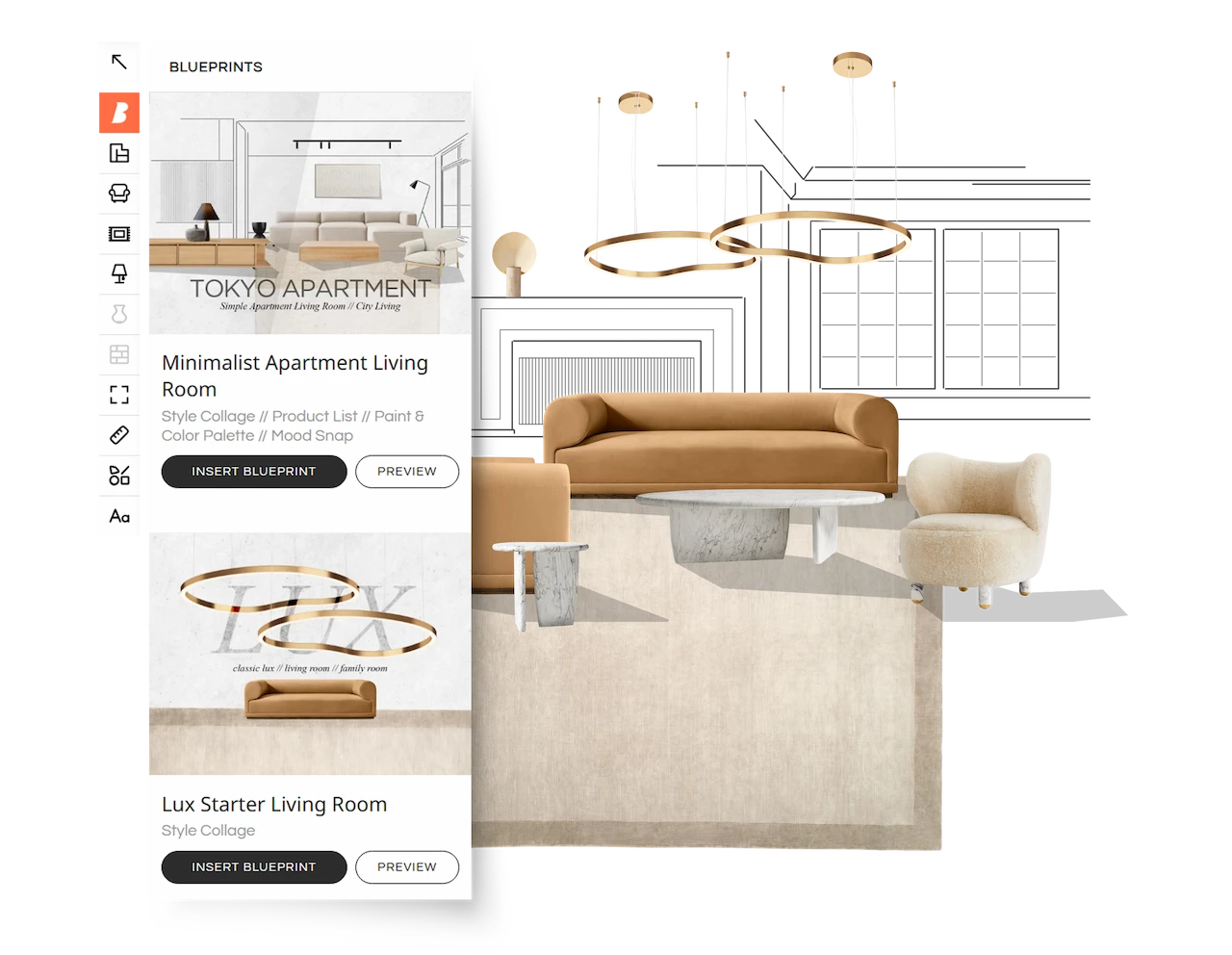 Blueprints are ready-designed templates you can start from if you’re not sure where to begin. They can include a style collage, a room plan, color and material palettes, and a product list. If you like a Blueprint, open it in Styleboard and swap a piece or two for products you prefer. It’s an easy way to get started and build from there.