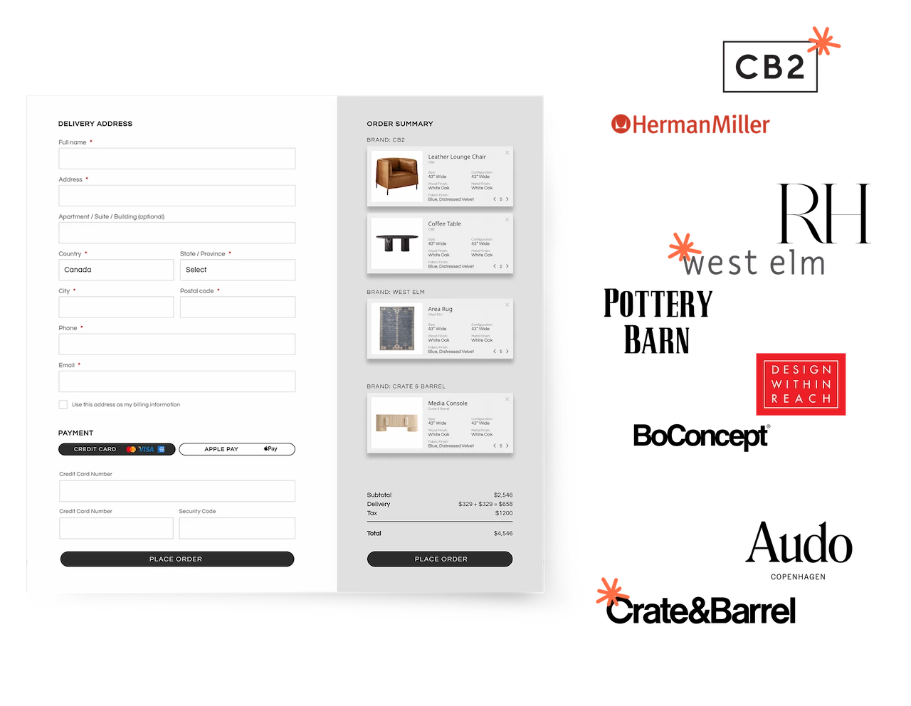 You can also compare key details like measurements, finishes, and delivery timelines before you commit, and if a brand doesn’t match your preferences, you can swap in another option. When you’re ready, you checkout once, even if your quote includes items from multiple brands.