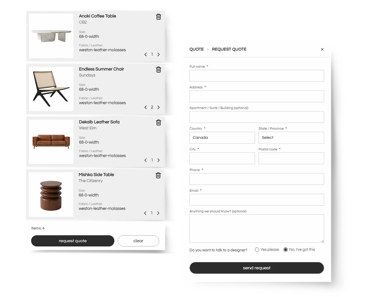 Add the products you have your eye on to your list and request a verified quote. We’ll confirm key details with each brand, including availability, lead times, shipping fees (standard or white glove), and any important notes. If something is unavailable or doesn’t fit your timeline, we’ll suggest close alternatives.