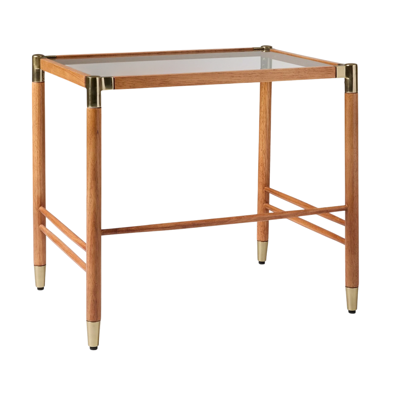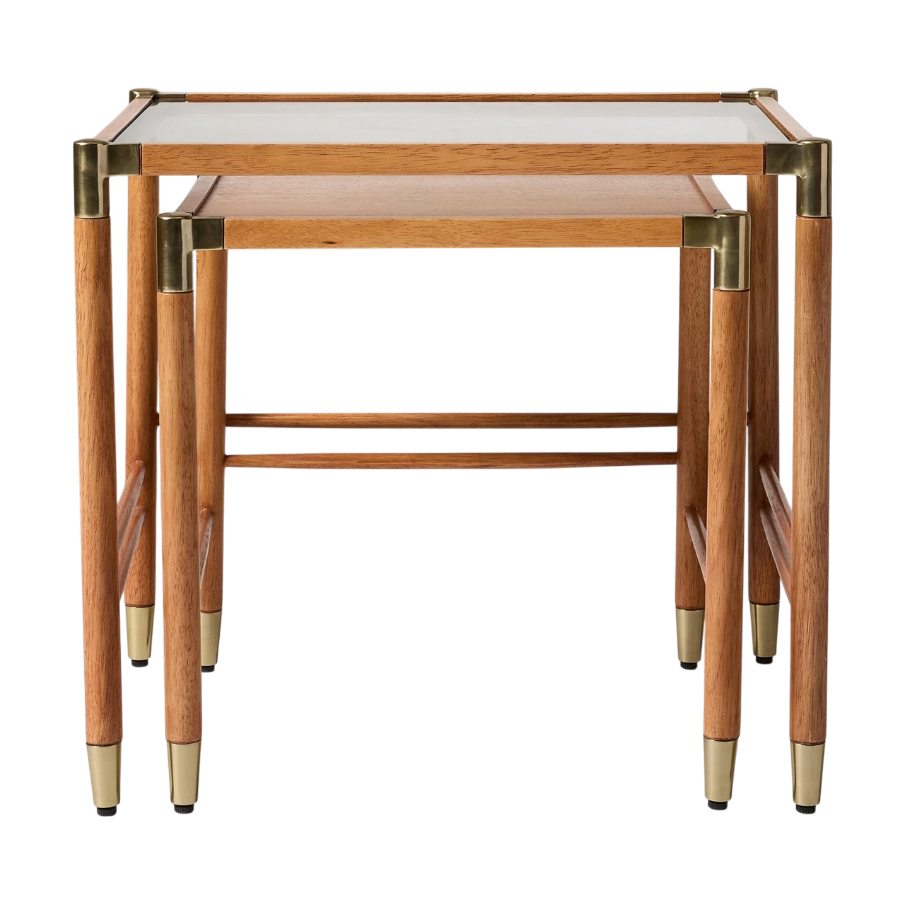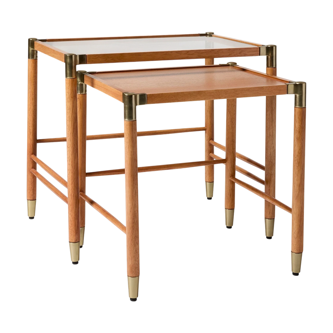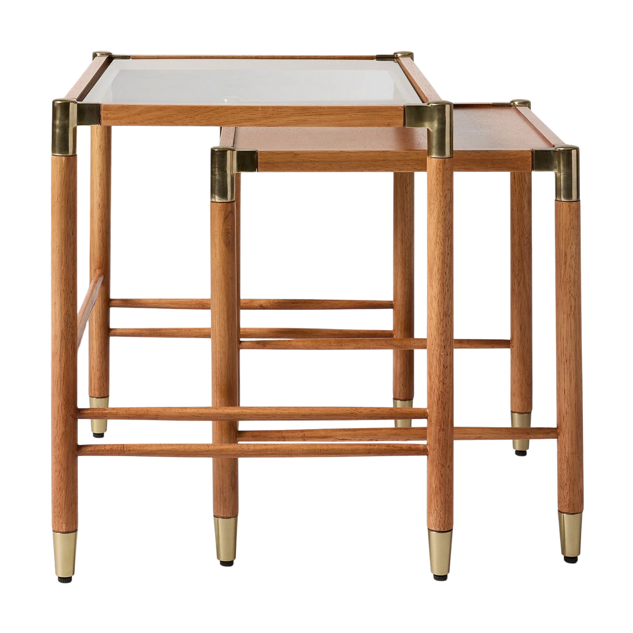 The Arnet Nesting Side Tables combine warm wood with sleek details in a versatile design. Each table has a solid rubberwood frame with brass-toned metal accents that add subtle contrast. The smaller table is topped with mango veneer, while the larger features tempered glass, allowing the two to layer visually when nested together.