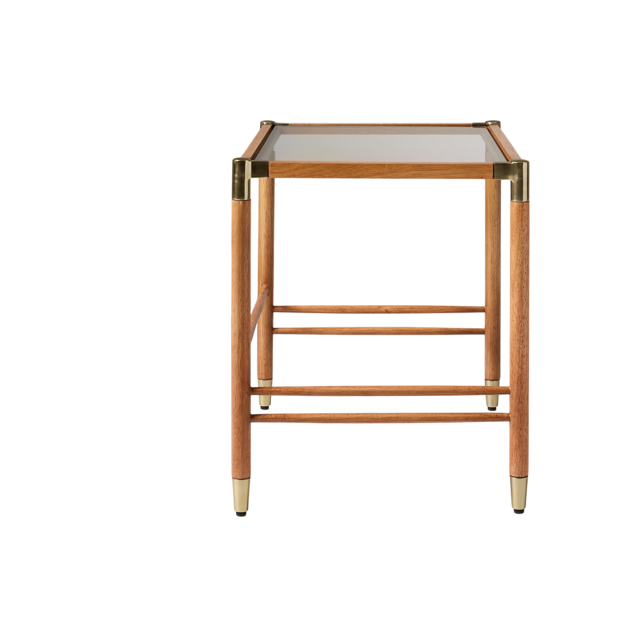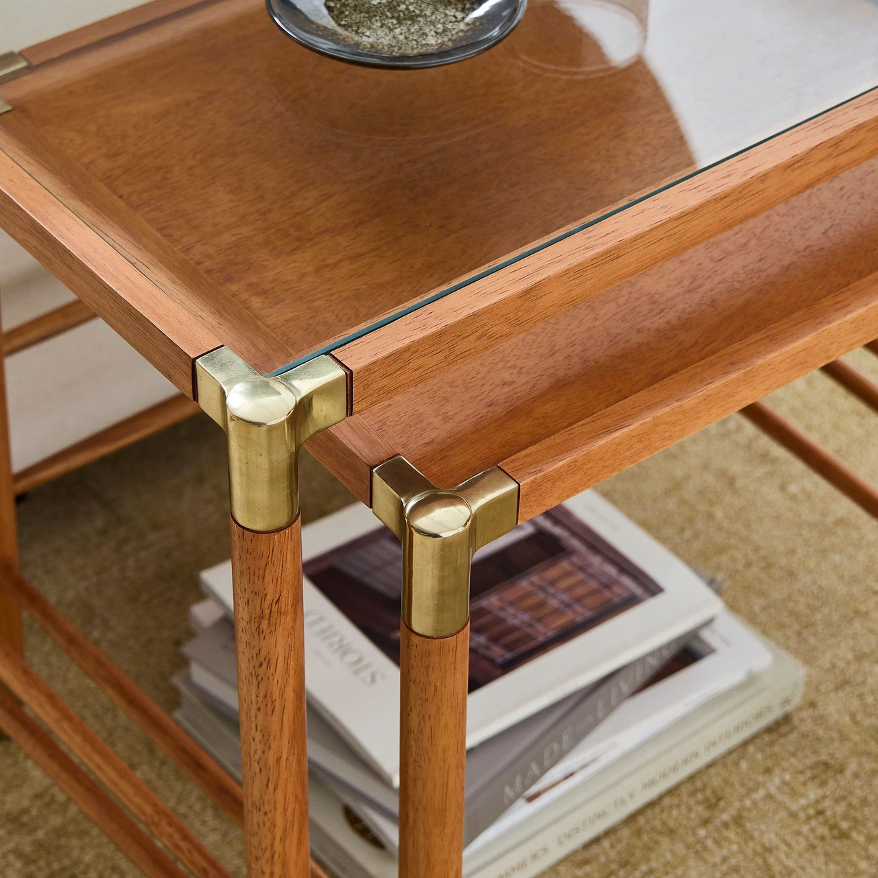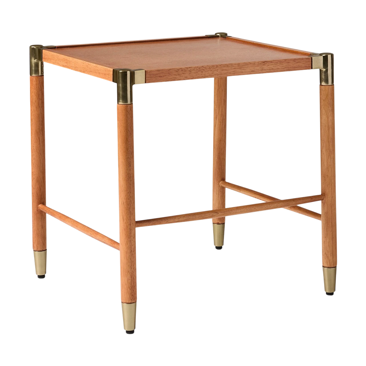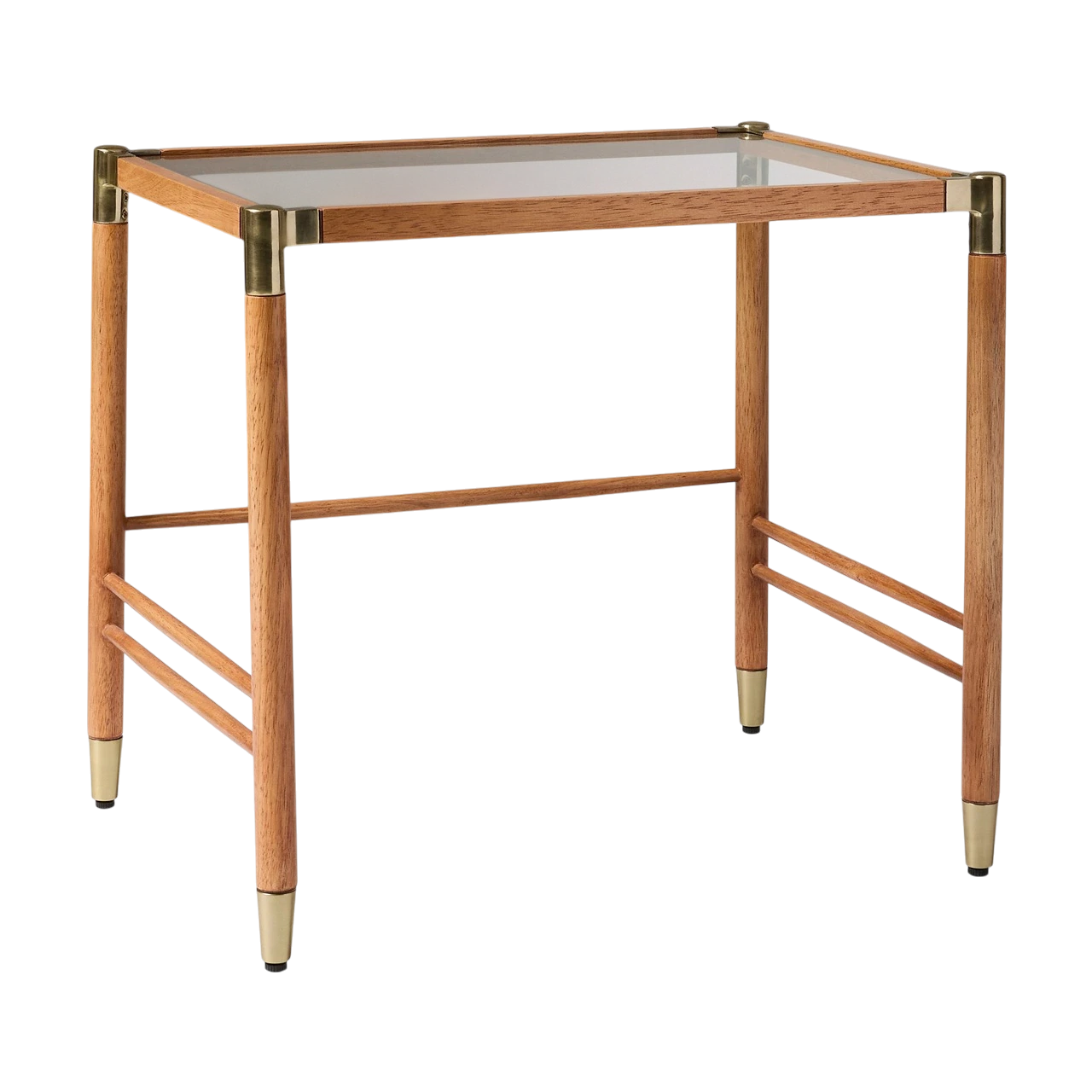 The Arnet Nesting Side Tables combine warm wood with sleek details in a versatile design. Each table has a solid rubberwood frame with brass-toned metal accents that add subtle contrast. The smaller table is topped with mango veneer, while the larger features tempered glass, allowing the two to layer visually when nested together.