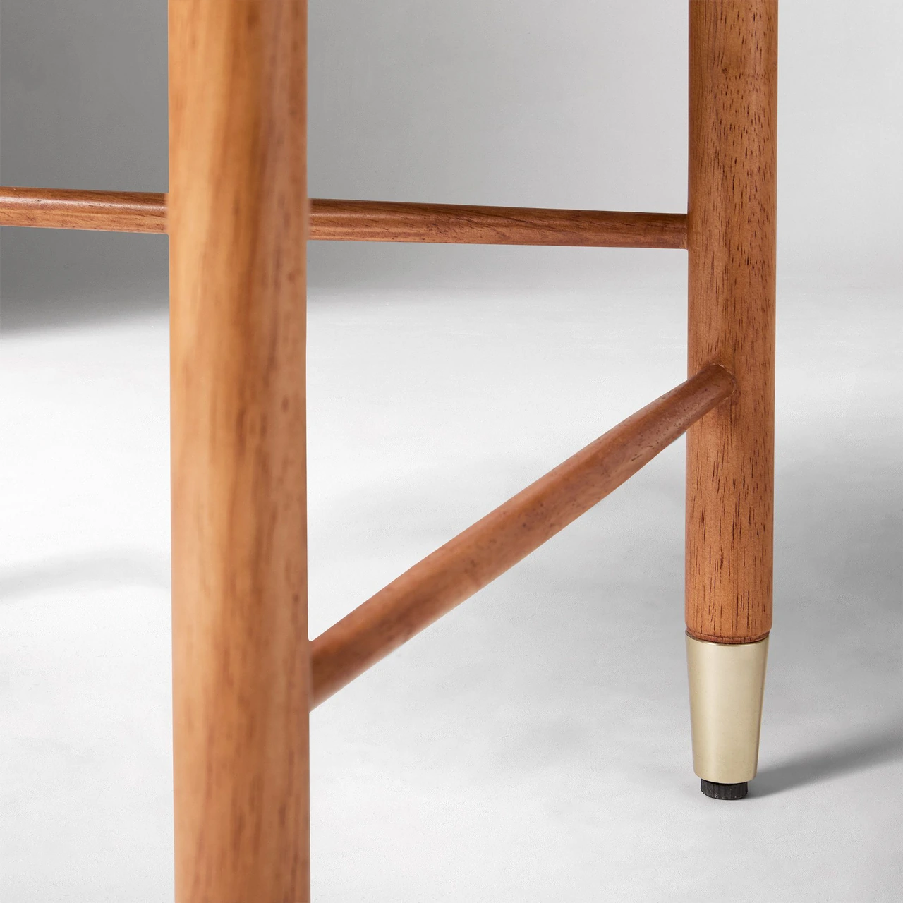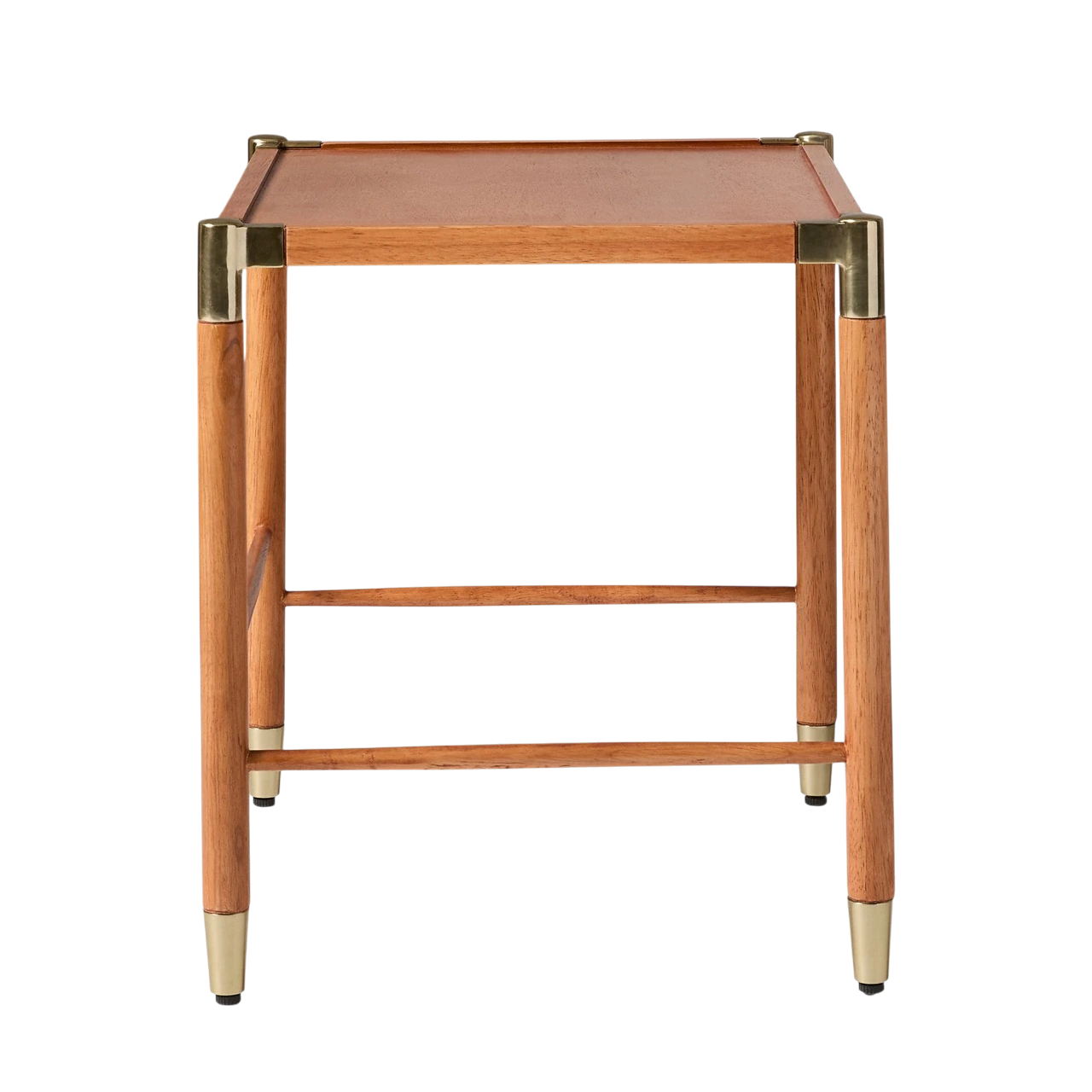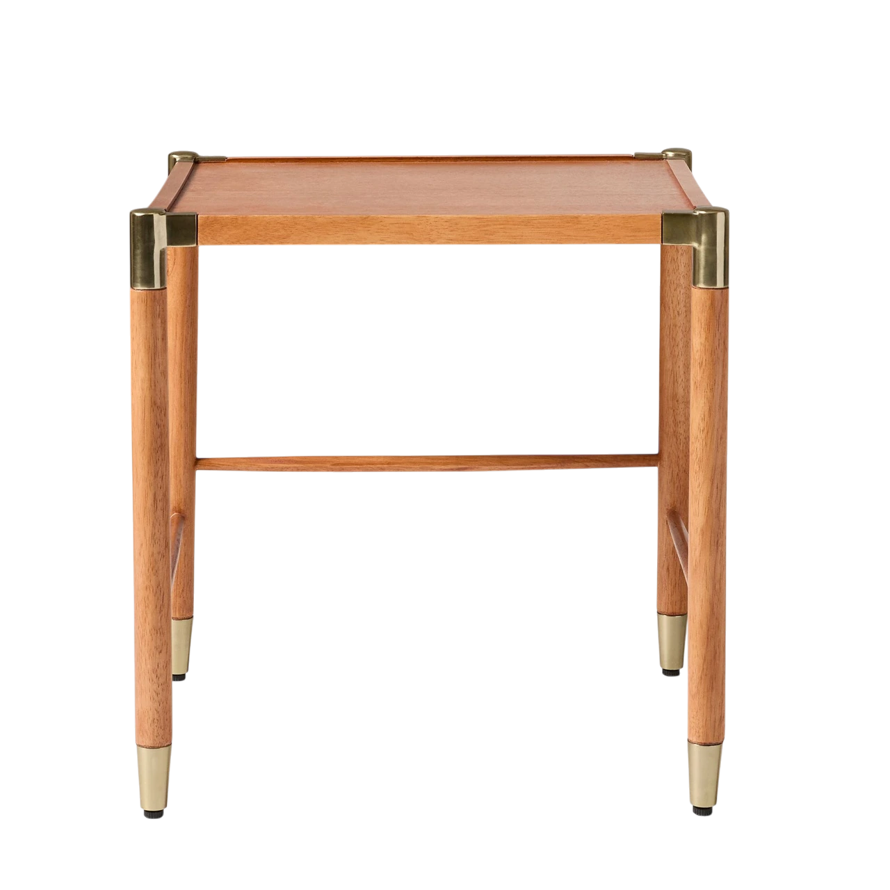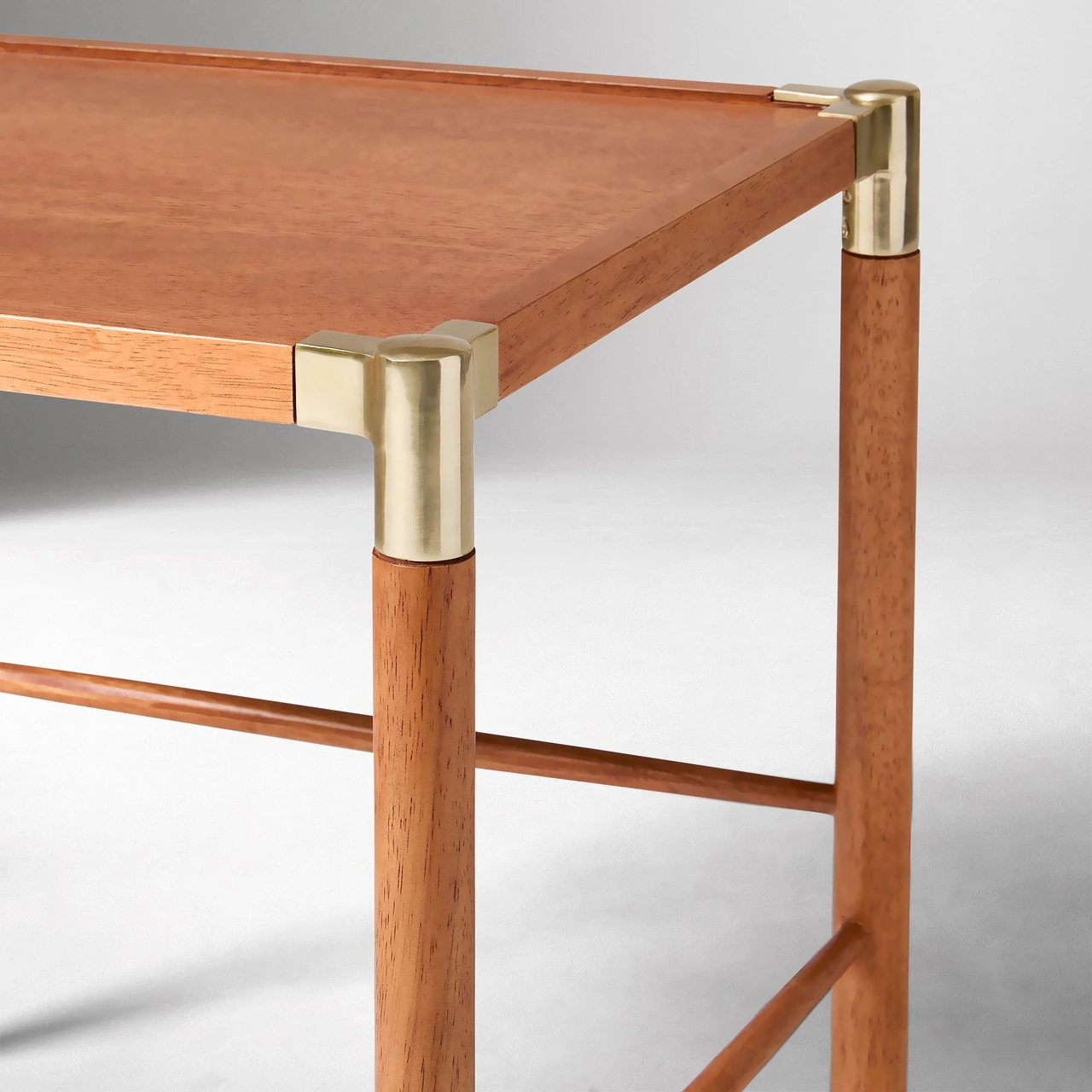 The Arnet Nesting Side Tables combine warm wood with sleek details in a versatile design. Each table has a solid rubberwood frame with brass-toned metal accents that add subtle contrast. The smaller table is topped with mango veneer, while the larger features tempered glass, allowing the two to layer visually when nested together.