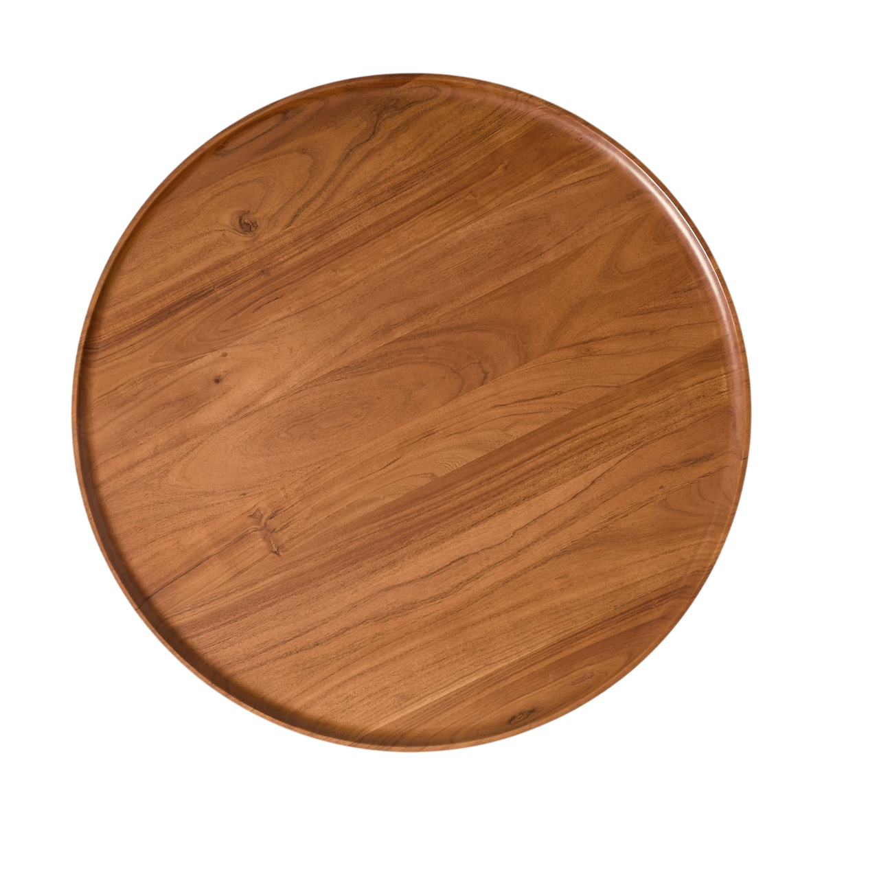 Round coffee table with a solid acacia wood top and acacia veneer base. |