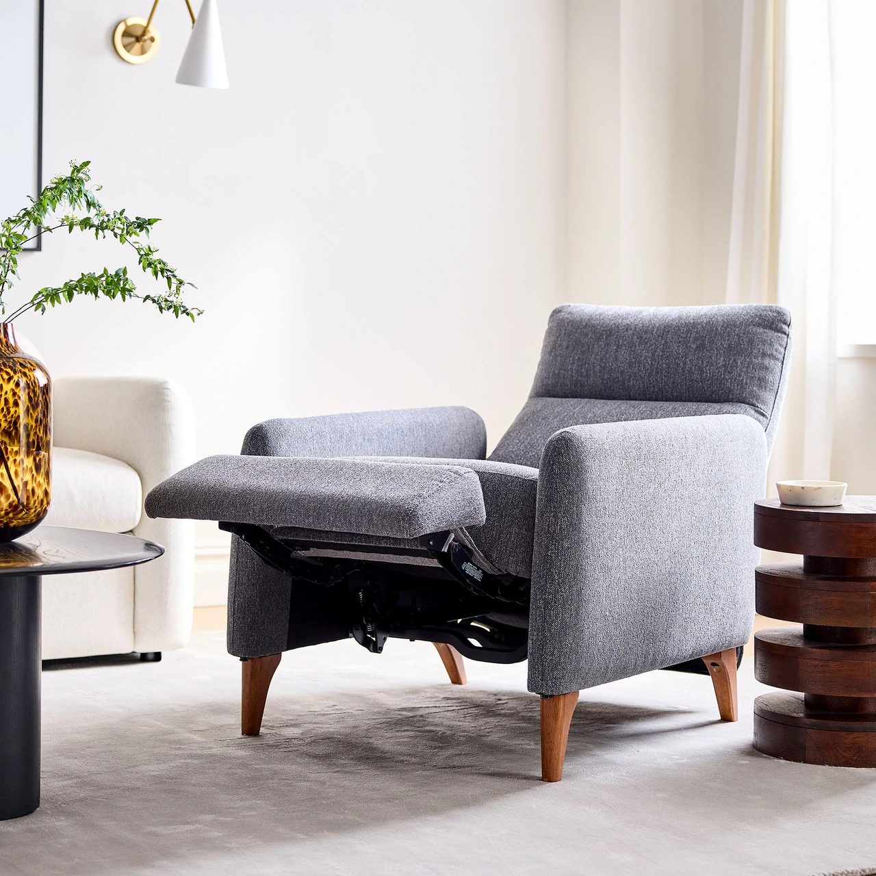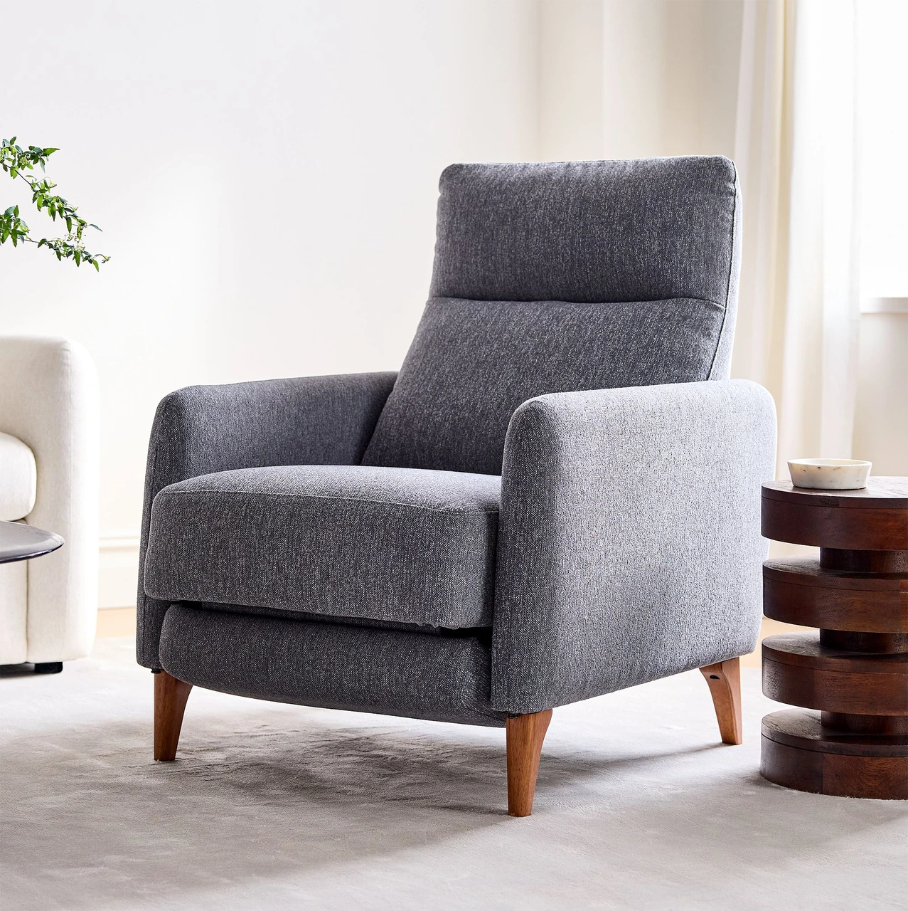 Built with an engineered wood frame and solid rubberwood legs, this recliner balances comfort and durability. Its hidden push-back mechanism ensures a smooth, understated function, while the wide selection of fabrics—from performance velvets to textured linens—allows it to complement both contemporary and traditional interiors.