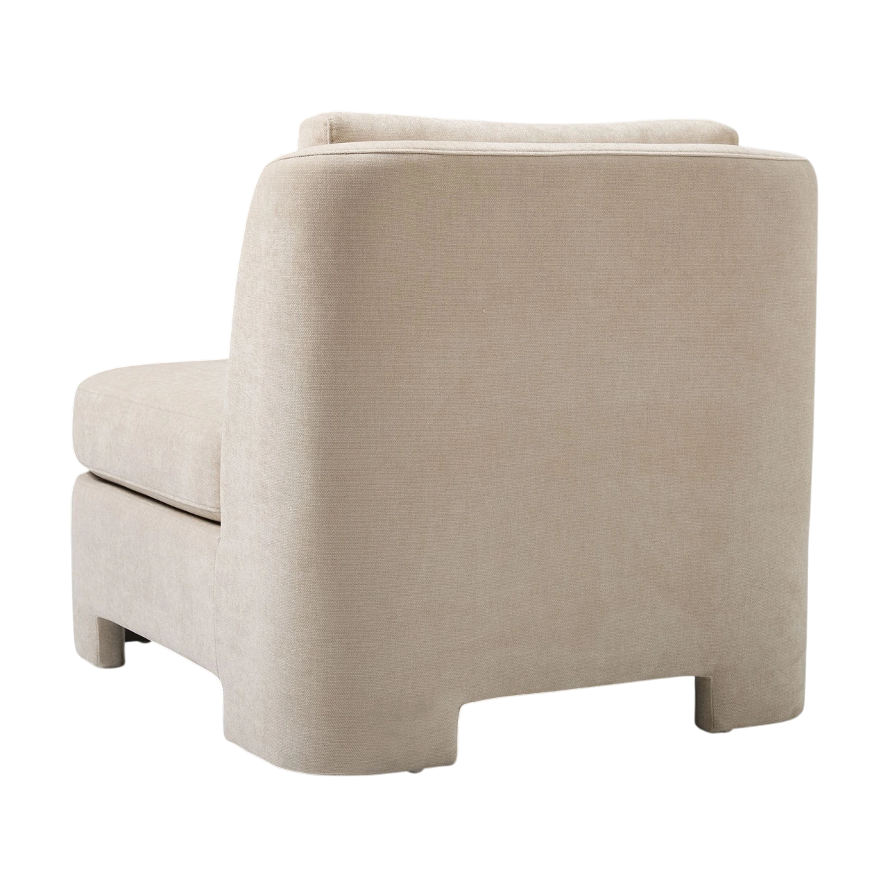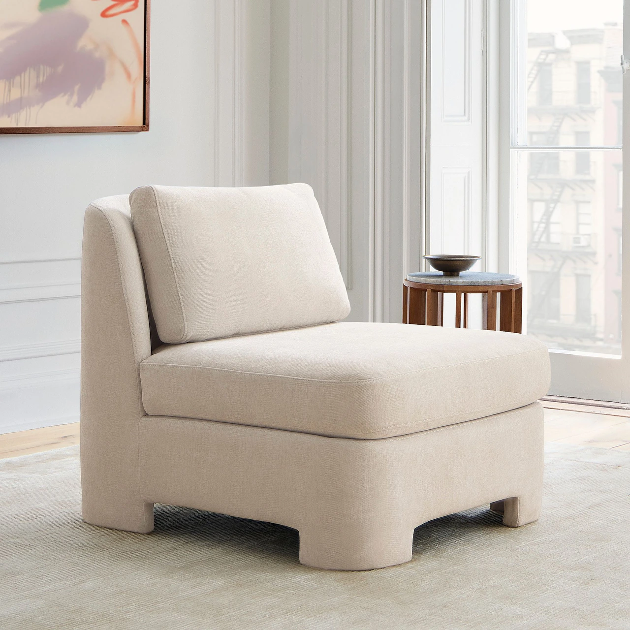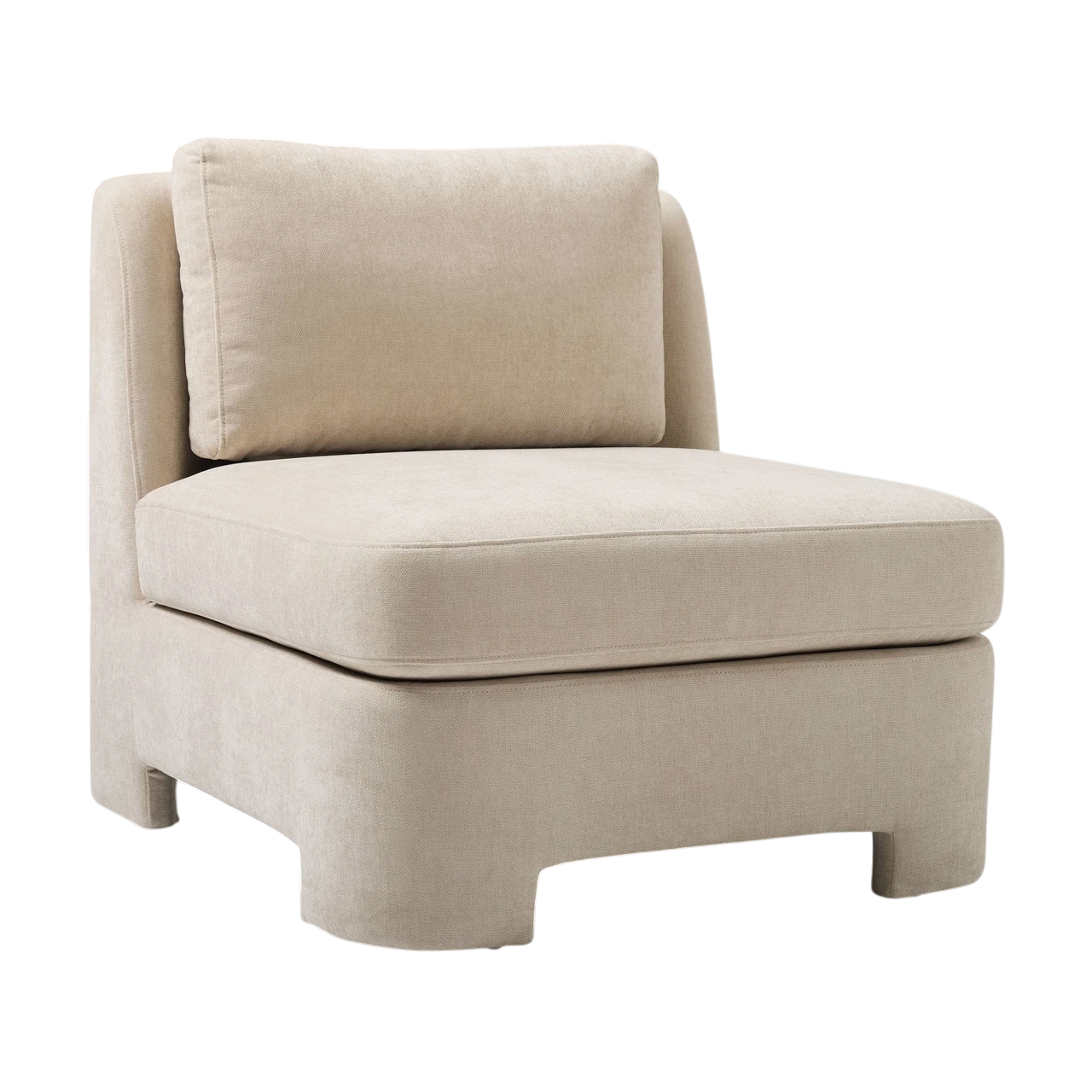 Armless lounge chair with a softly curved back and fully upholstered frame. |