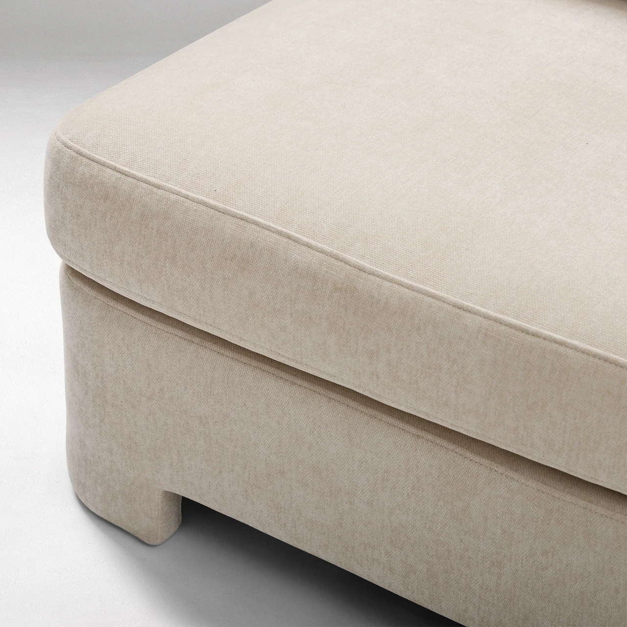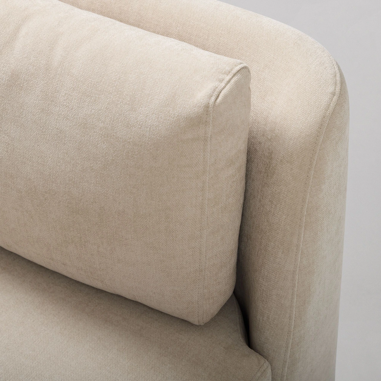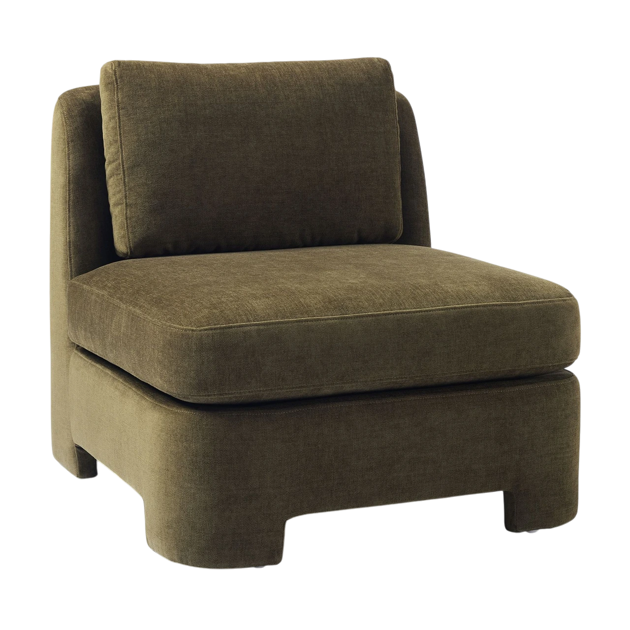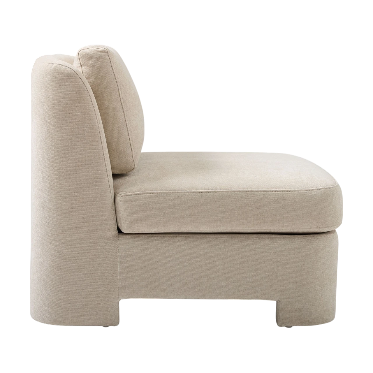 Armless lounge chair with a softly curved back and fully upholstered frame. |