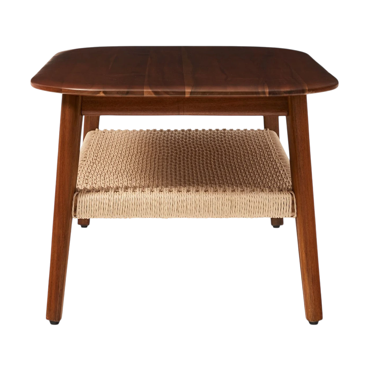 The Chadwick Mid-Century Rectangle Coffee Table pairs solid acacia wood with a woven cord shelf, blending warm materials and refined craftsmanship. Its smooth top and open lower tier create both function and visual balance.