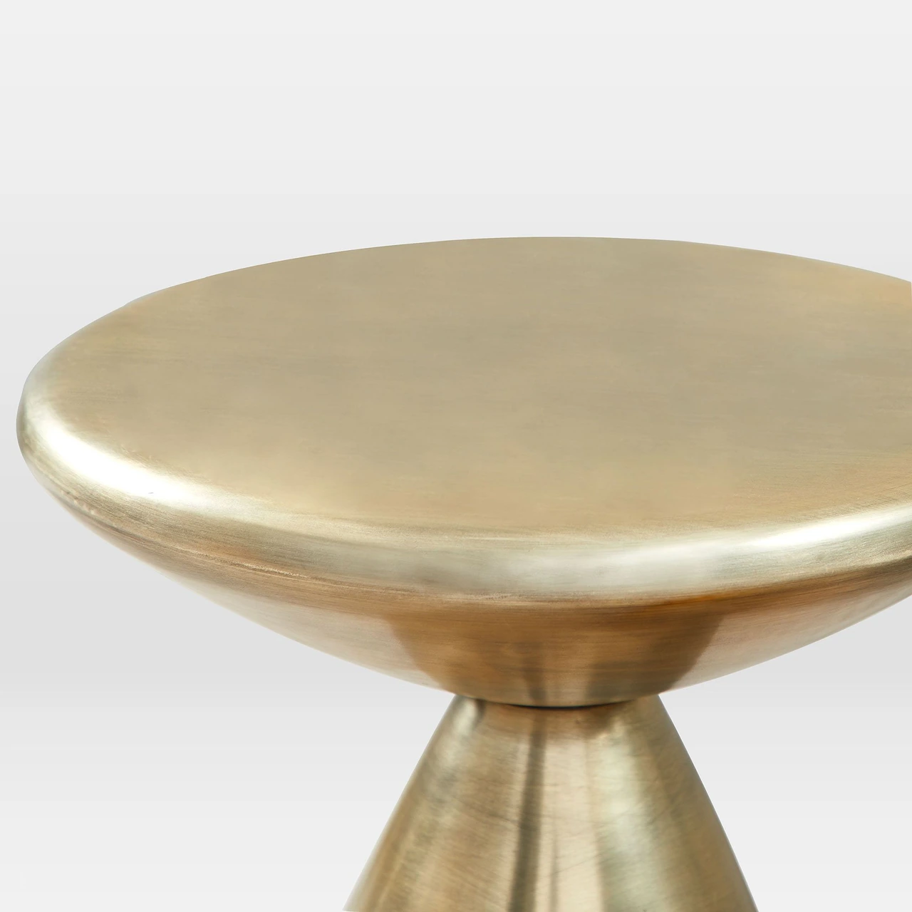 The Cosmo Side Table has a sculptural, compact form crafted from spun aluminum. Its smooth, rounded shape and Antique Brass finish give it a warm metallic tone while keeping the design lightweight and easy to move.