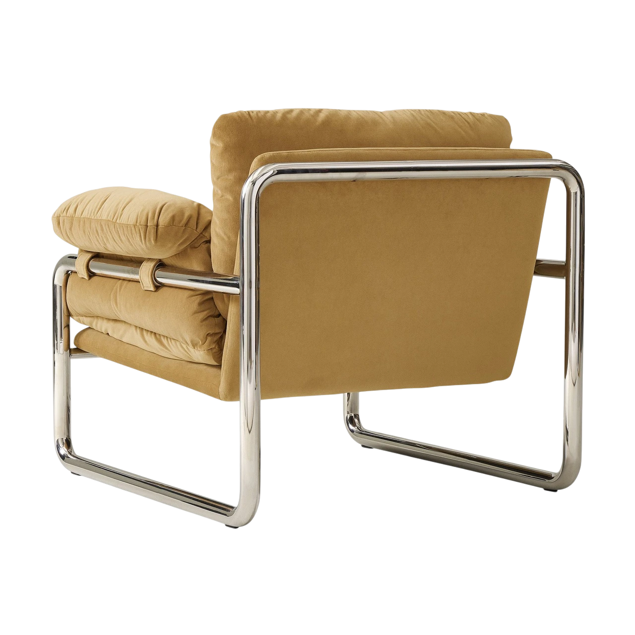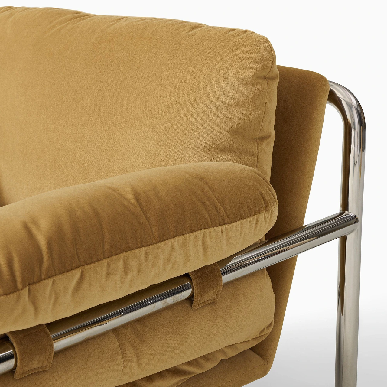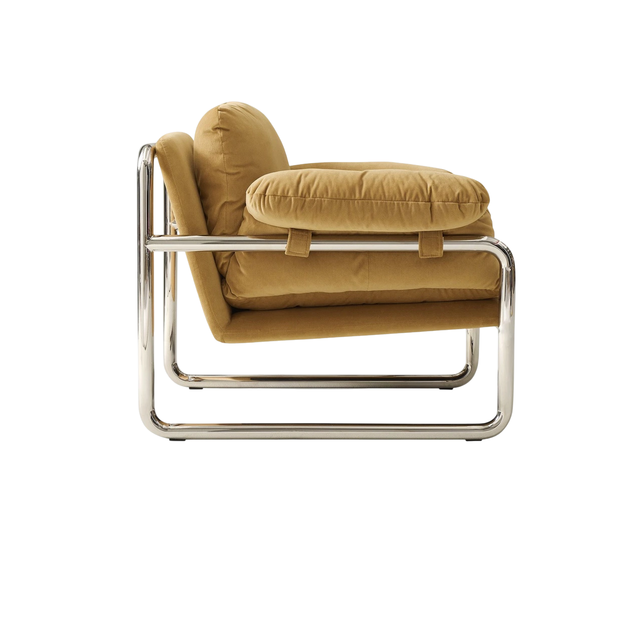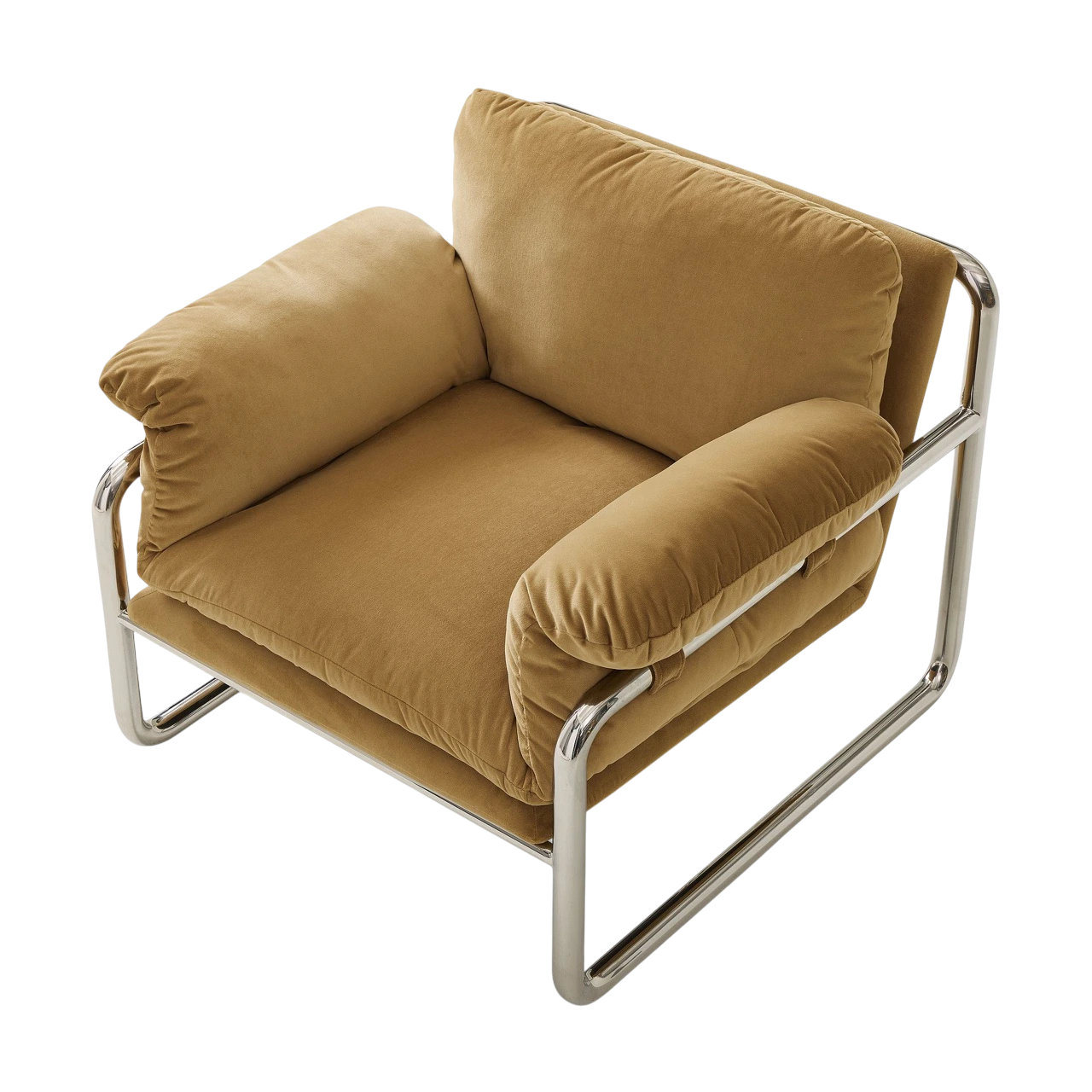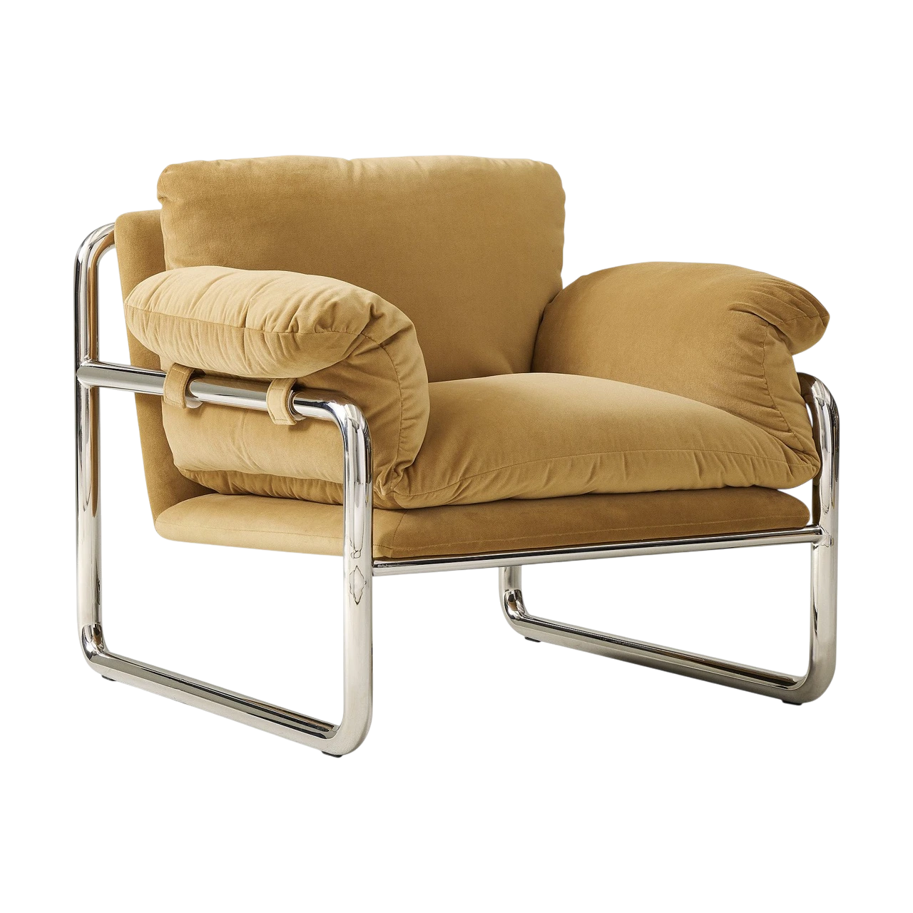 The Desmond Chair combines a sleek metal outline with soft, slouchy cushions to create a refined balance between structure and comfort. Its exposed frame contrasts with plush upholstery, giving the chair a distinctive, modern profile that feels both casual and composed.