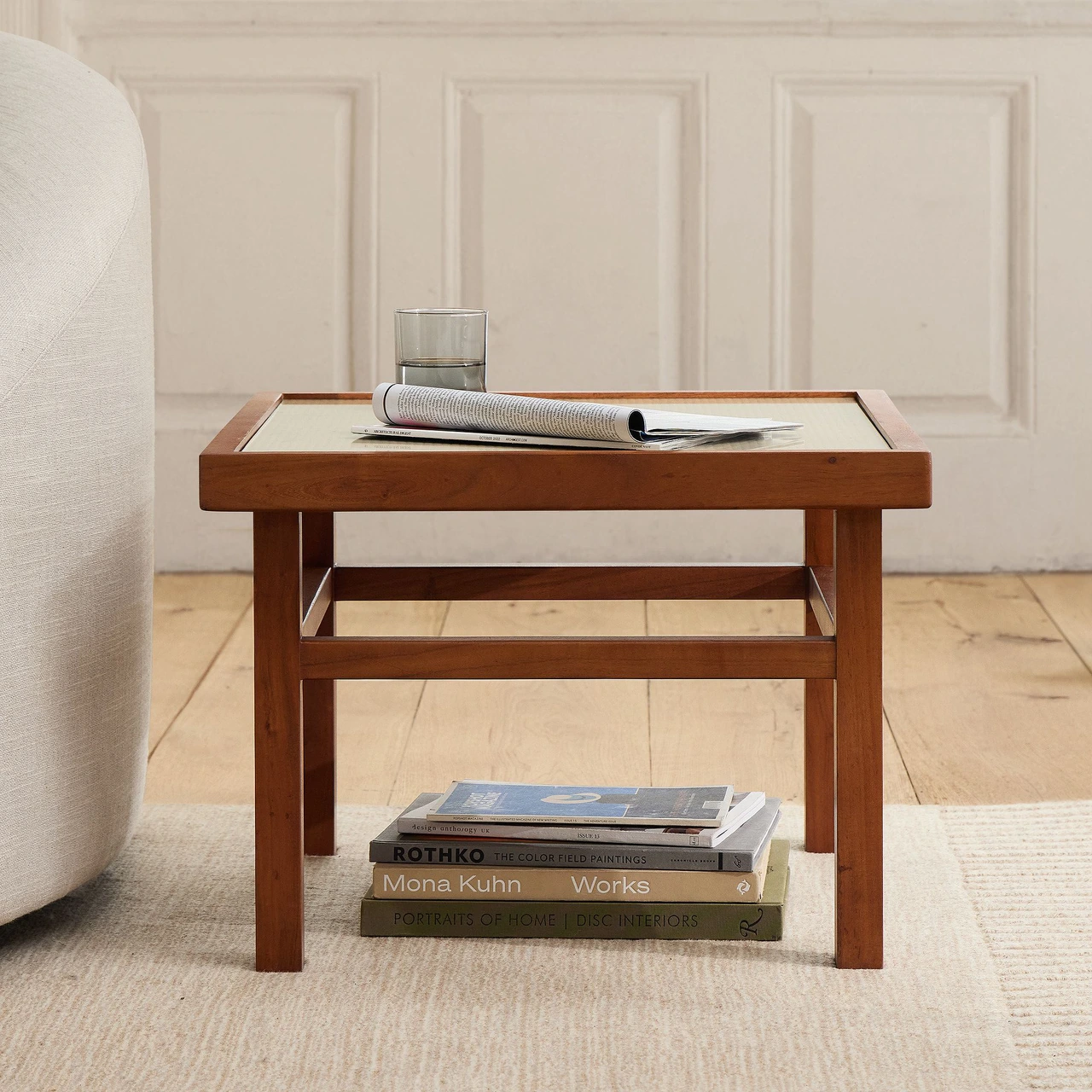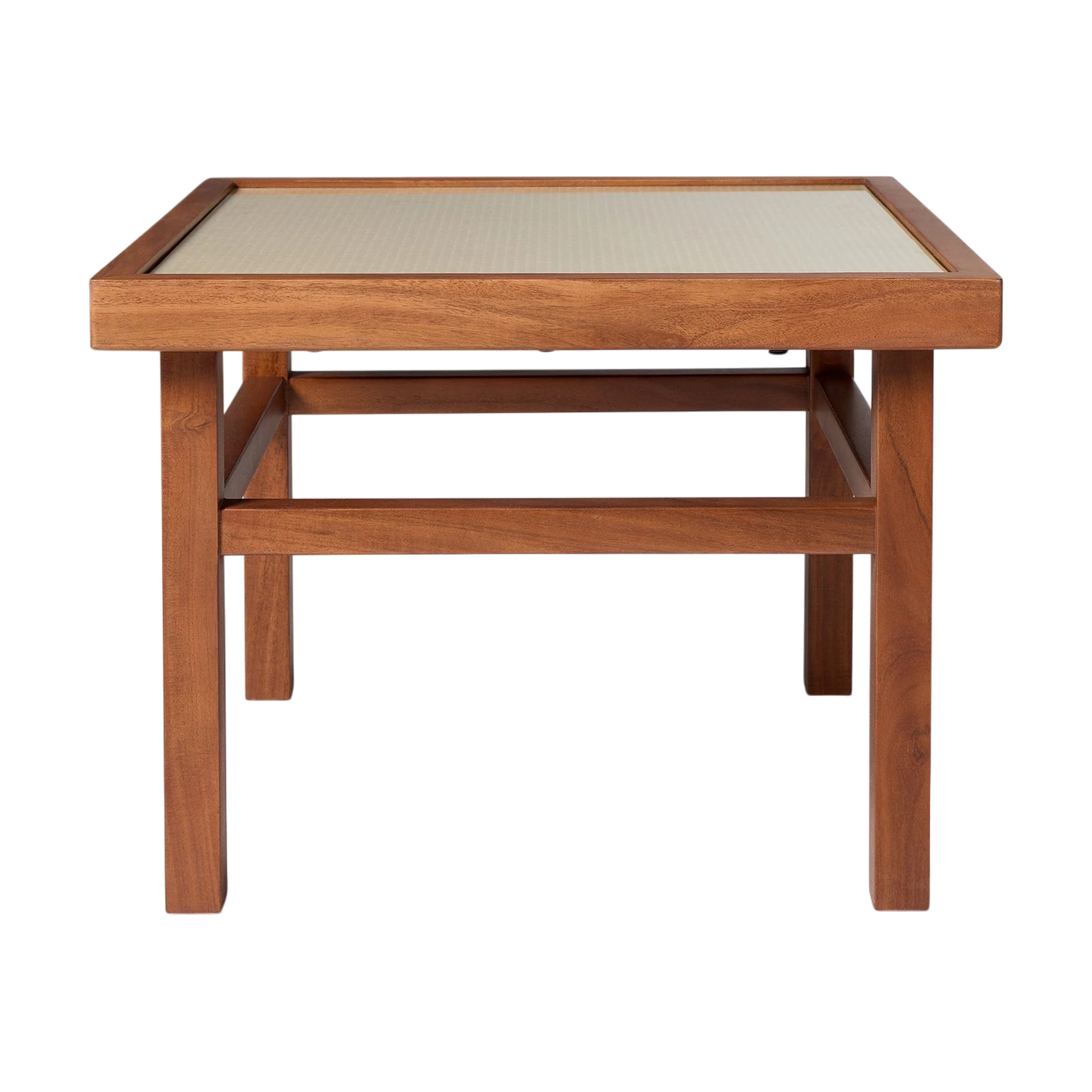 The Douglas Side Table blends natural texture with clean geometry. Its top combines finely woven tatami beneath tempered glass, framed by acacia veneer for a layered, tactile effect. The clear glass surface protects the weave while keeping its detail visible.