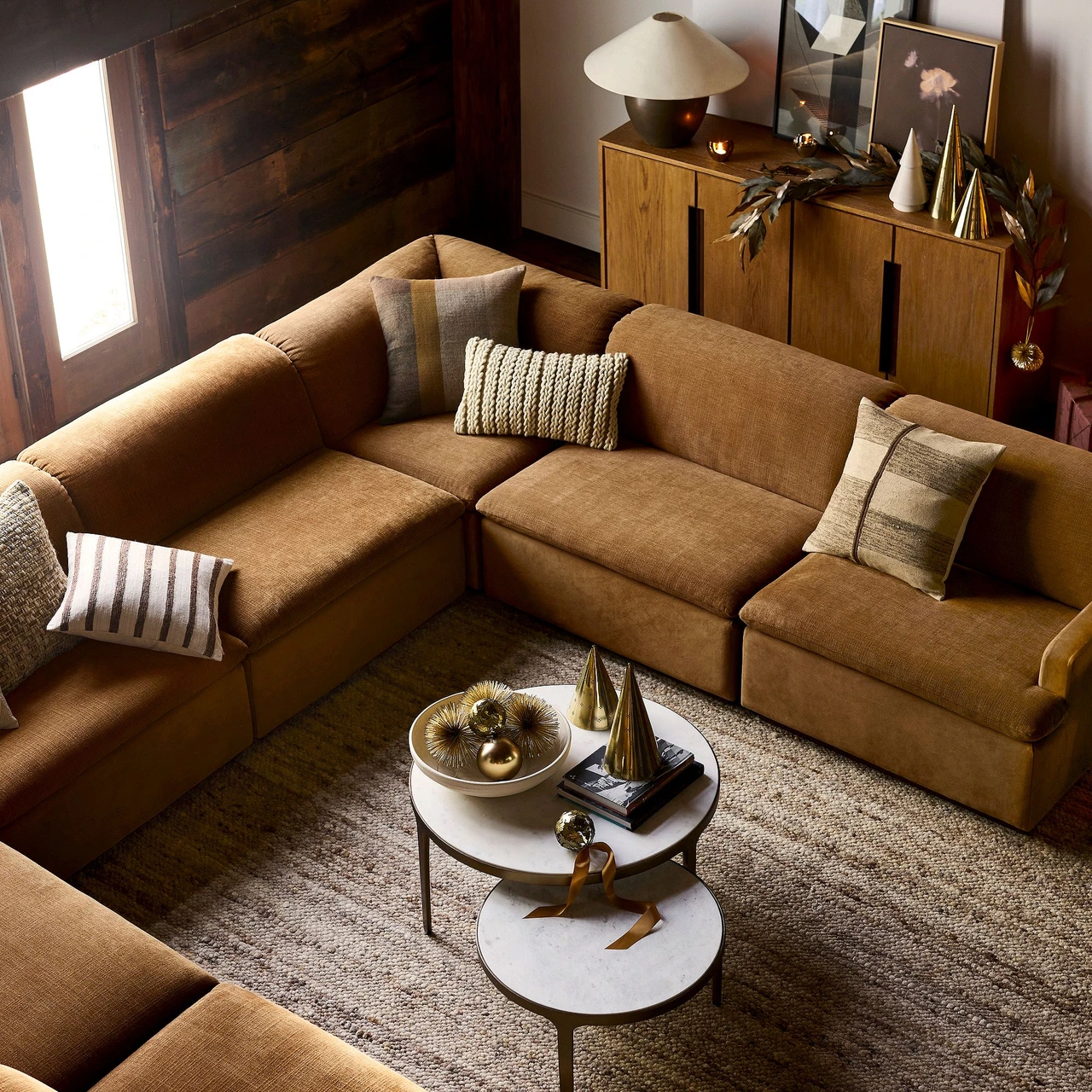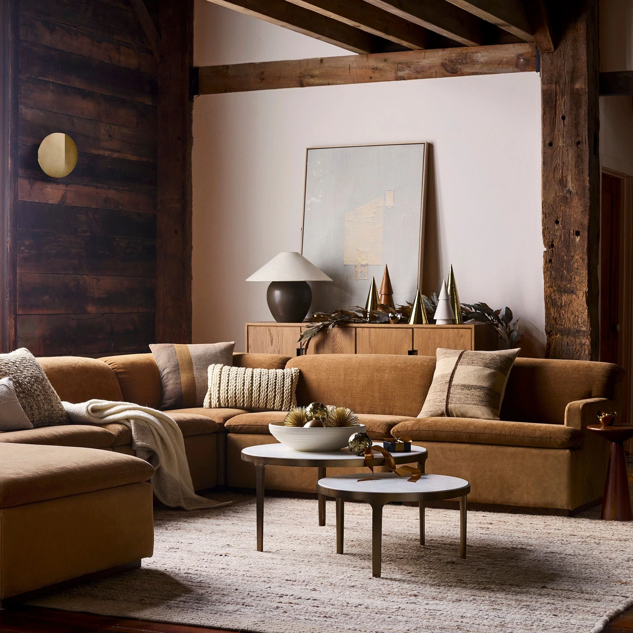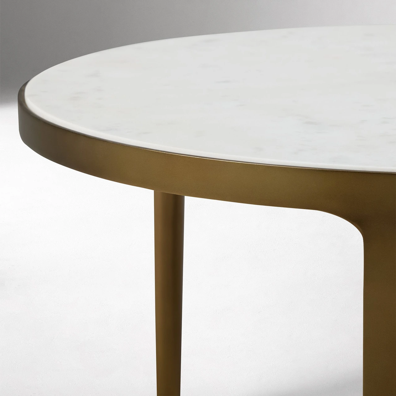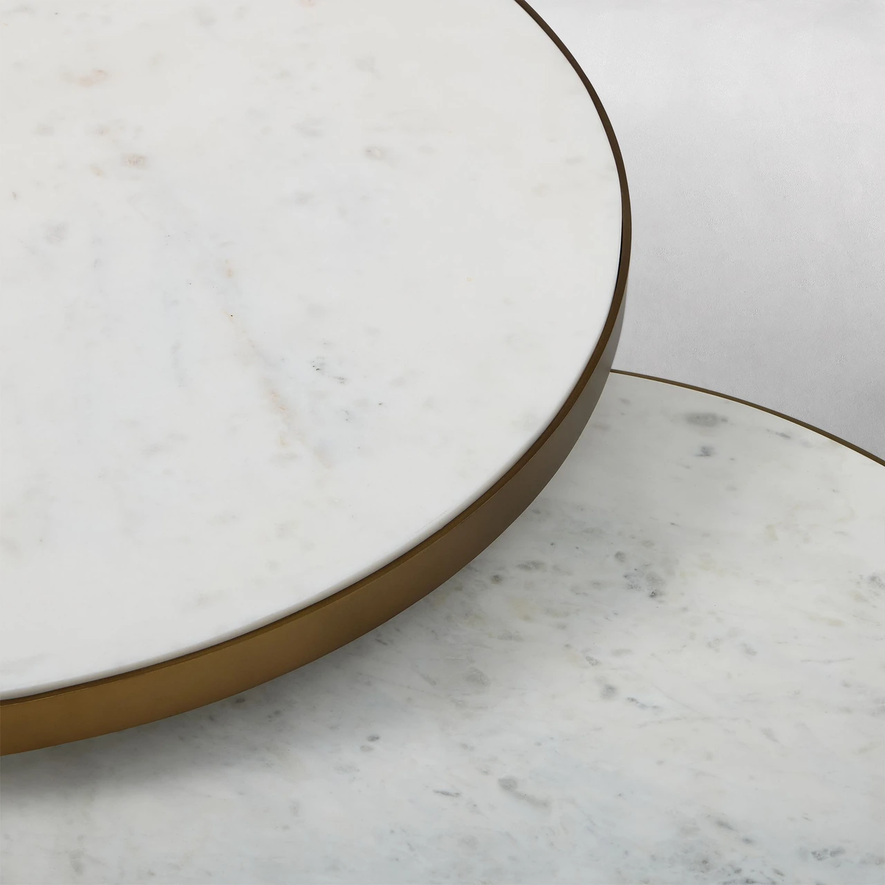 The Elwell Round Marble Coffee Table set pairs smooth white Banswara marble with the warm sheen of Vintage Brass. Designed for versatility, the two nesting tables can be layered together or used separately to adapt to different spaces.
