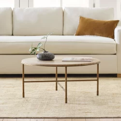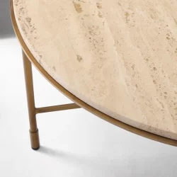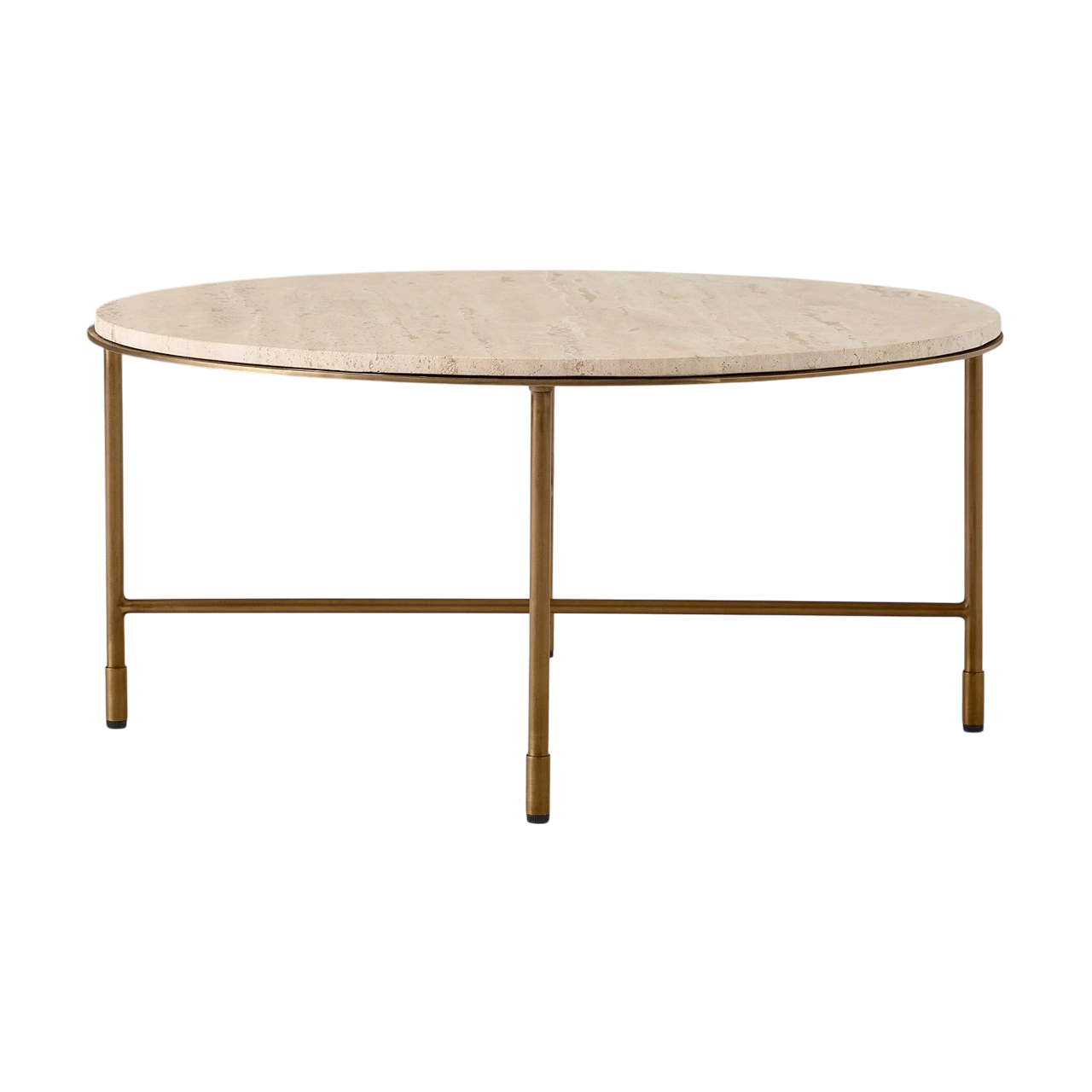 The Fay Travertine Coffee Table combines natural stone texture with a sculptural metal base. Its travertine top highlights the organic variation and subtle warmth of the material, making each piece one of a kind.