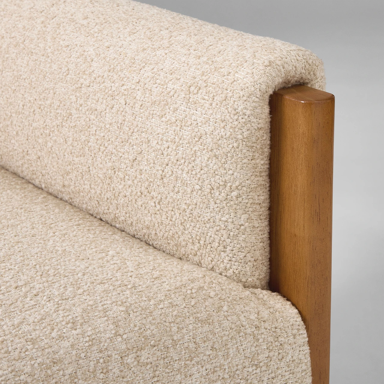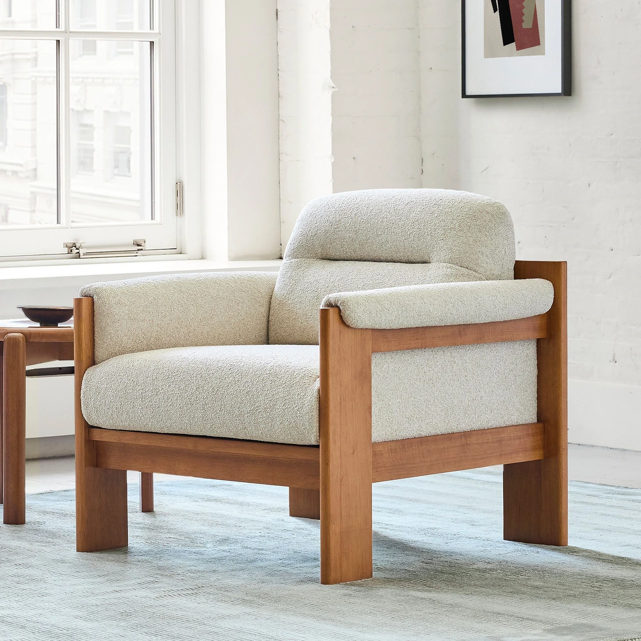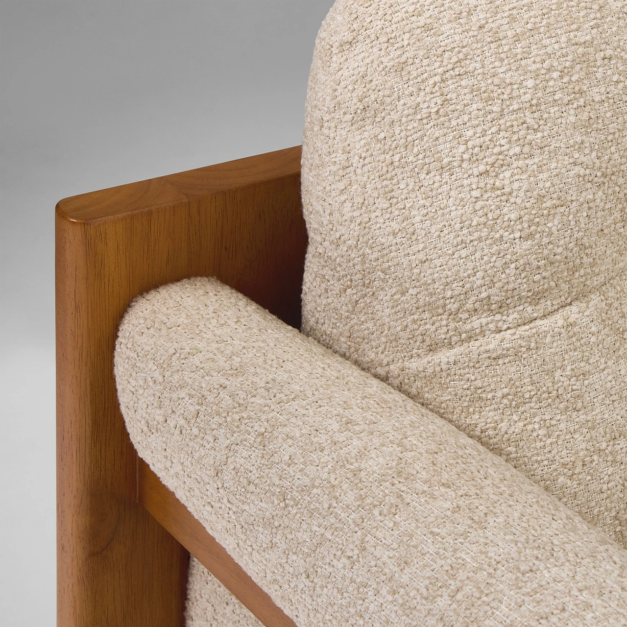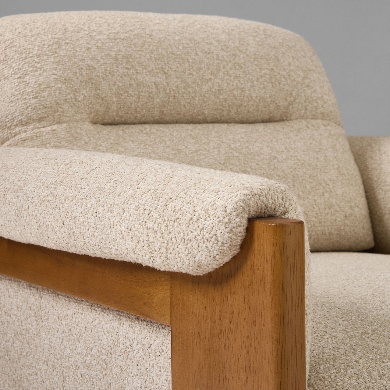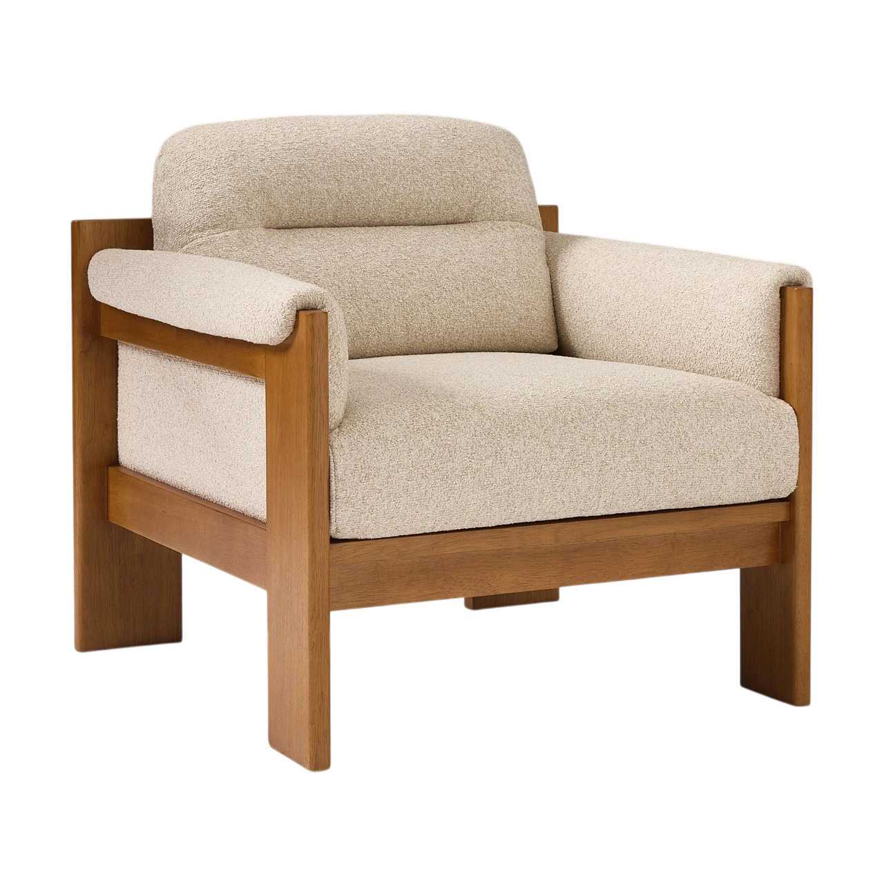 The Gunnison Chair pairs mid-century design with deep, inviting comfort. Its exposed wood frame highlights the natural grain of solid rubberwood, while waterfall-style arm cushions soften the silhouette and add a relaxed touch.