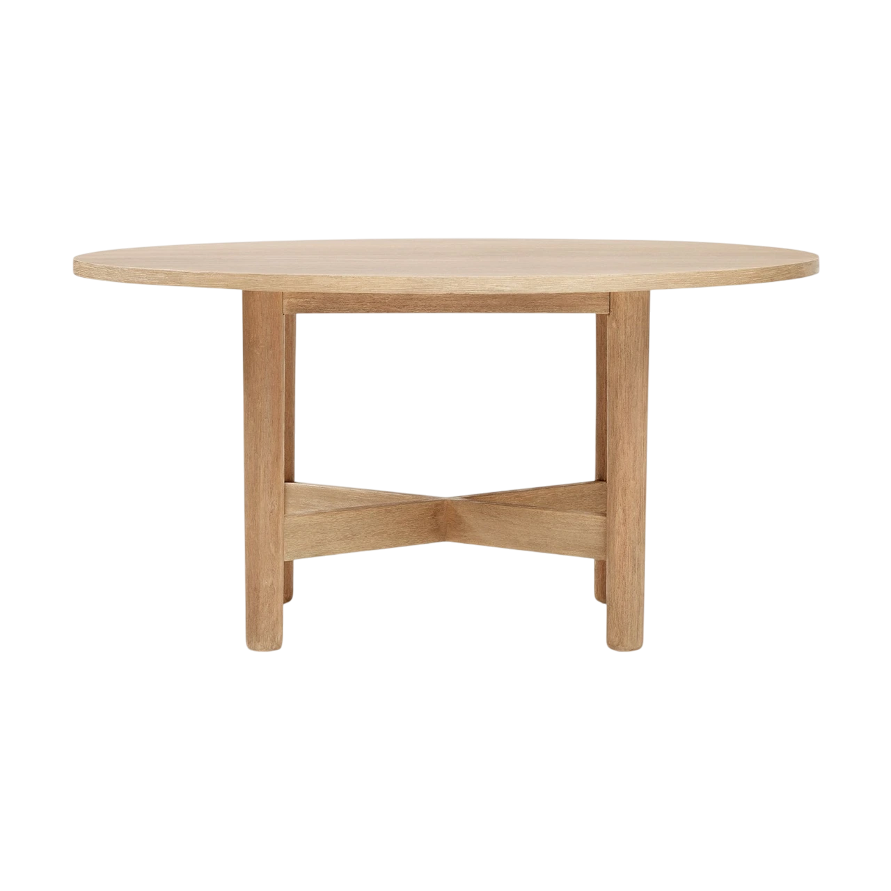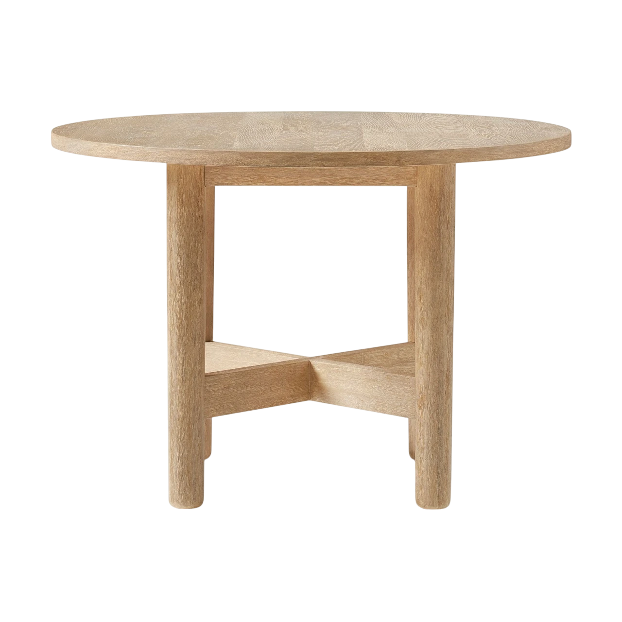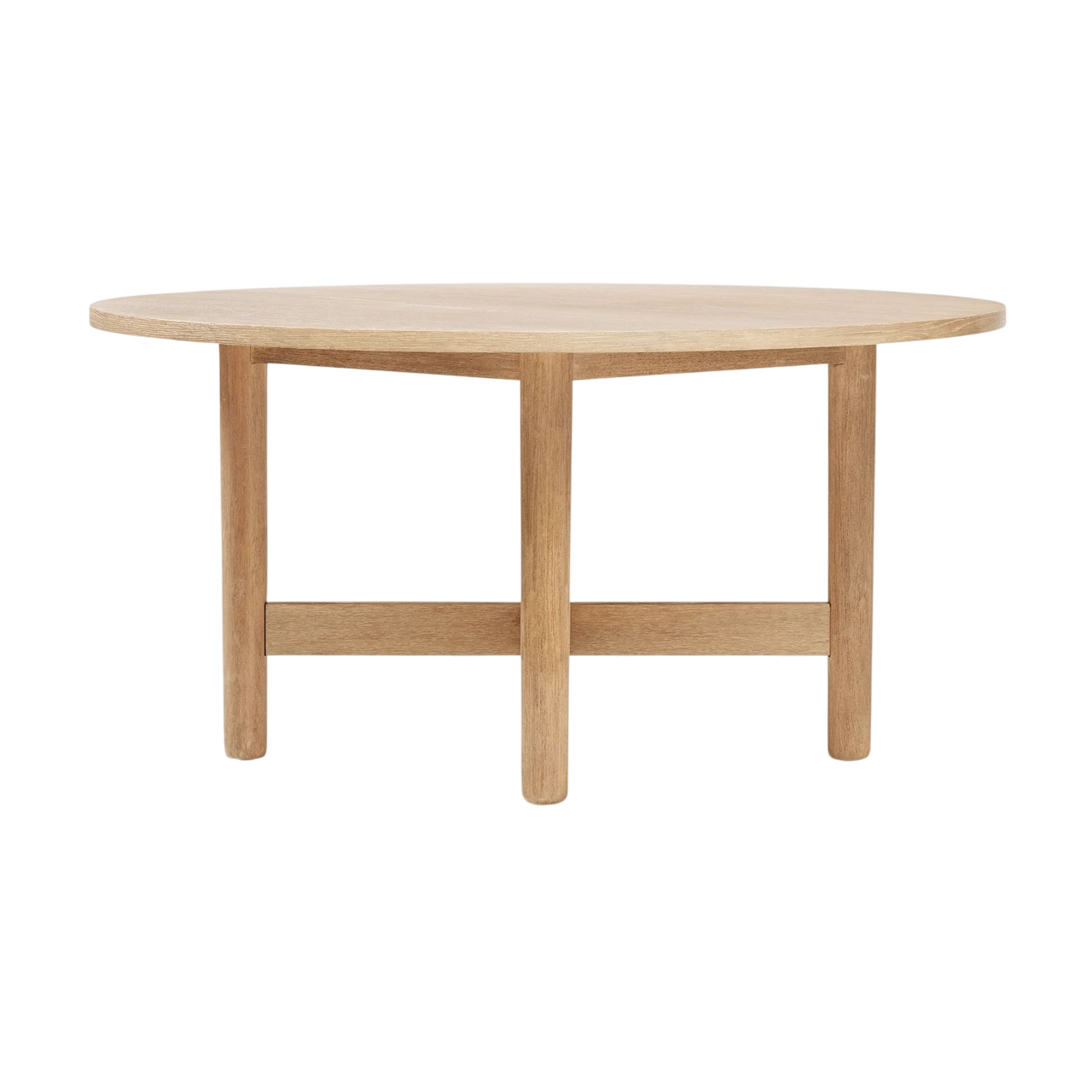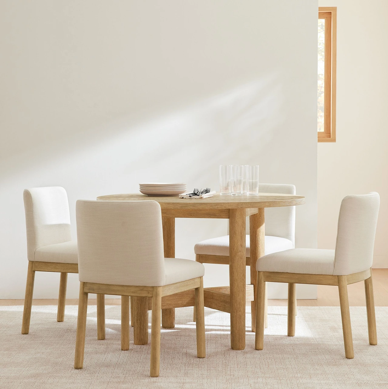 A modern update on the classic farmhouse table, this piece pairs solid mahogany legs with a white oak veneer top in a soft Dune finish. Made from kiln-dried wood, it’s built for both residential and contract use, with adjustable levelers for added stability.