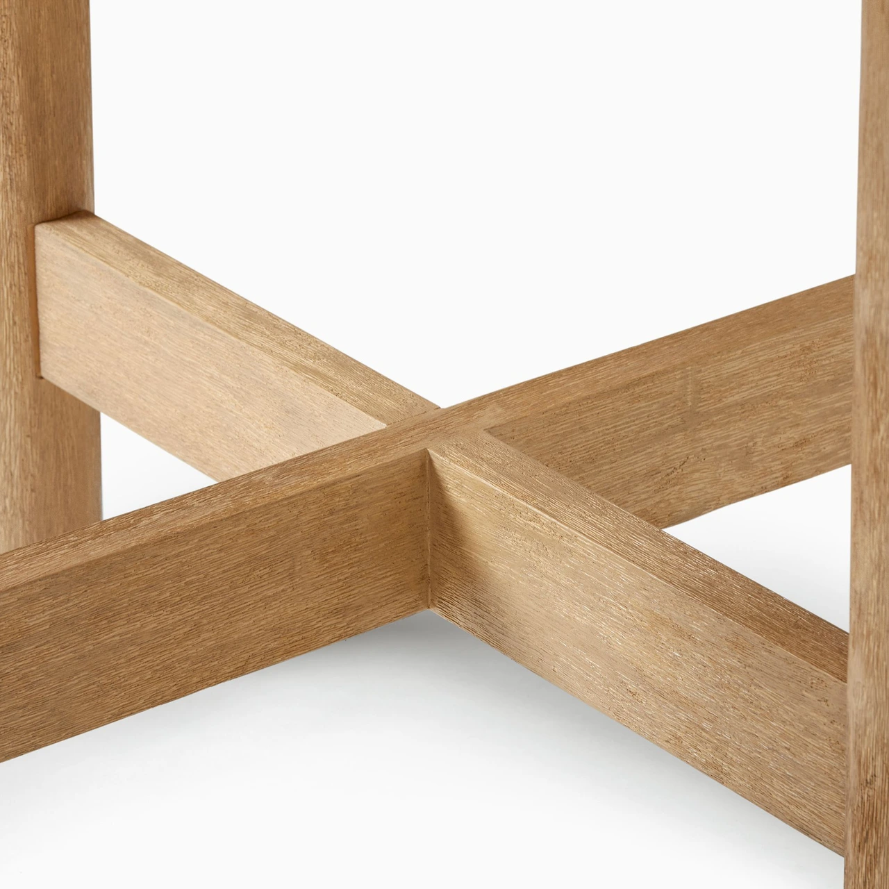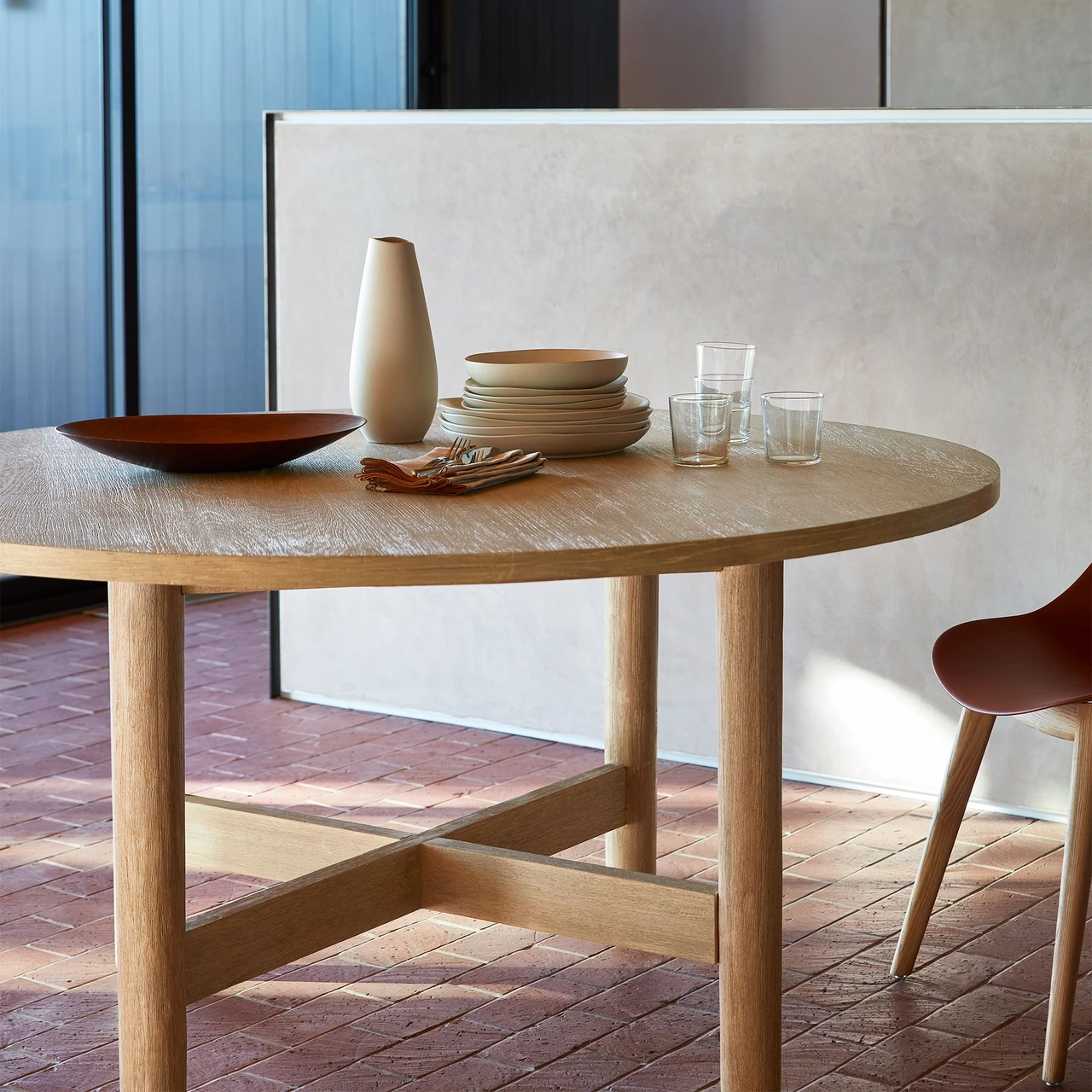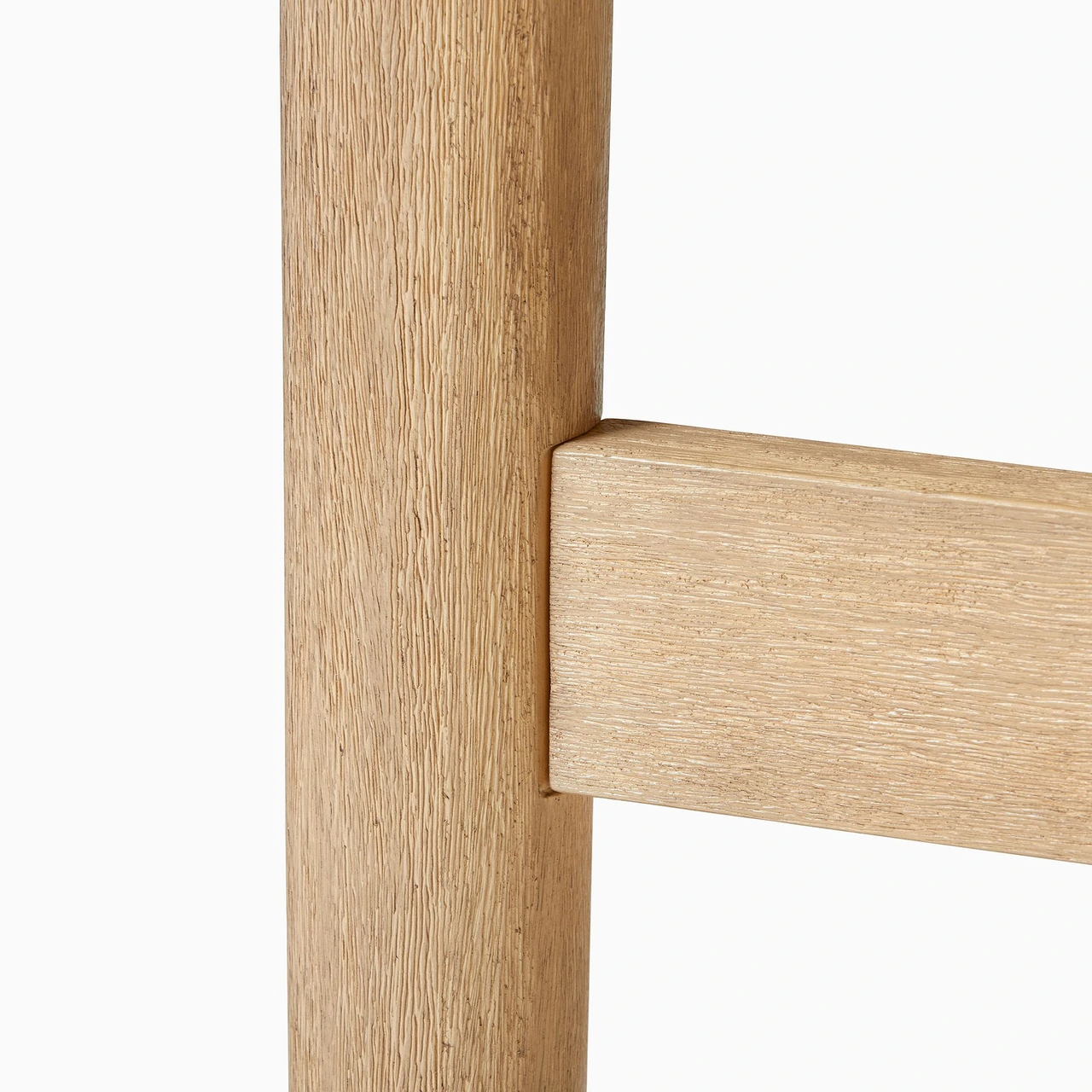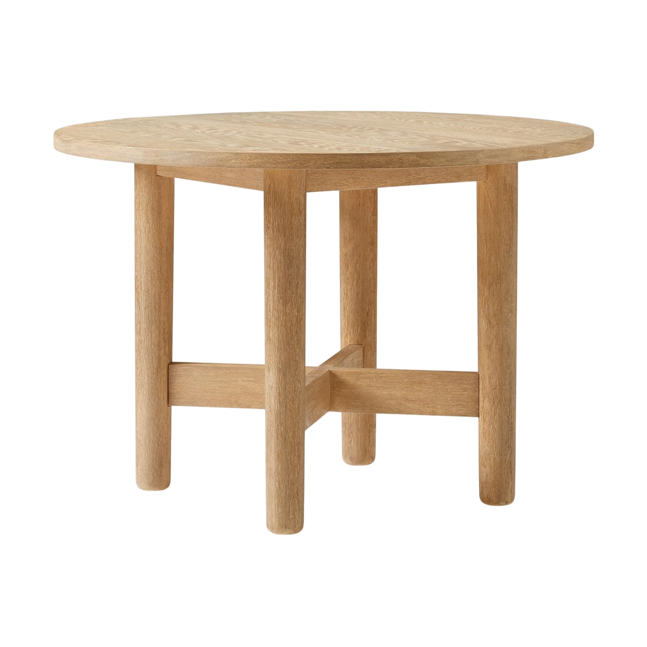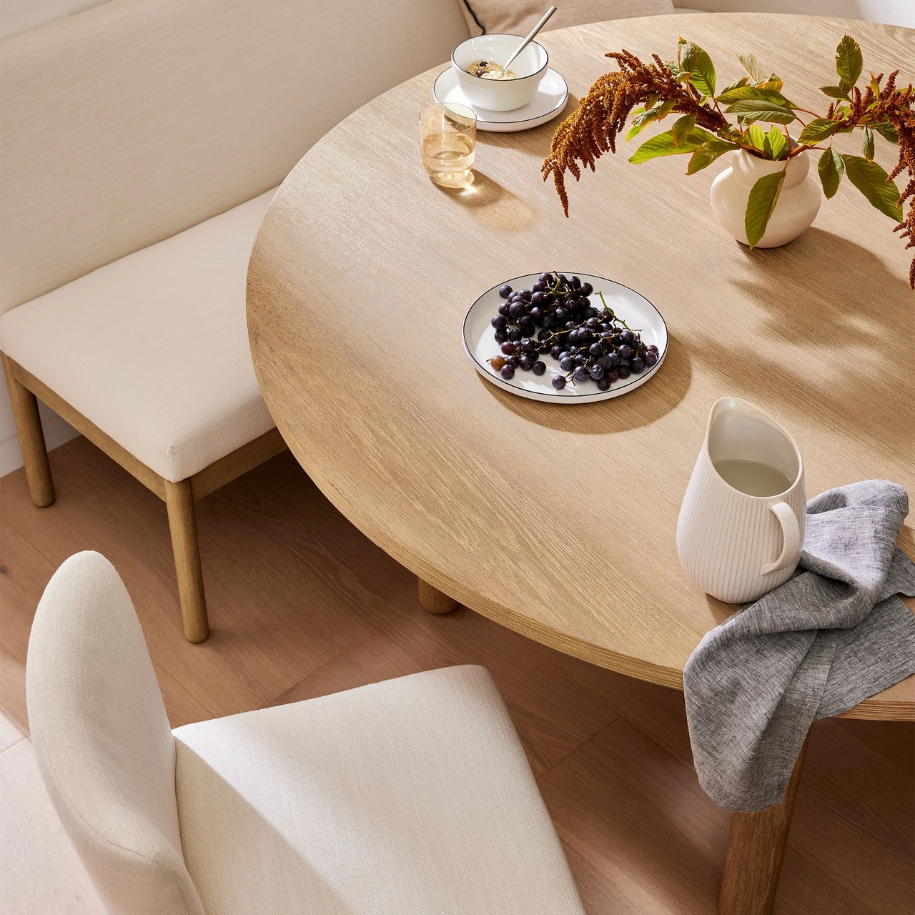 A modern update on the classic farmhouse table, this piece pairs solid mahogany legs with a white oak veneer top in a soft Dune finish. Made from kiln-dried wood, it’s built for both residential and contract use, with adjustable levelers for added stability.