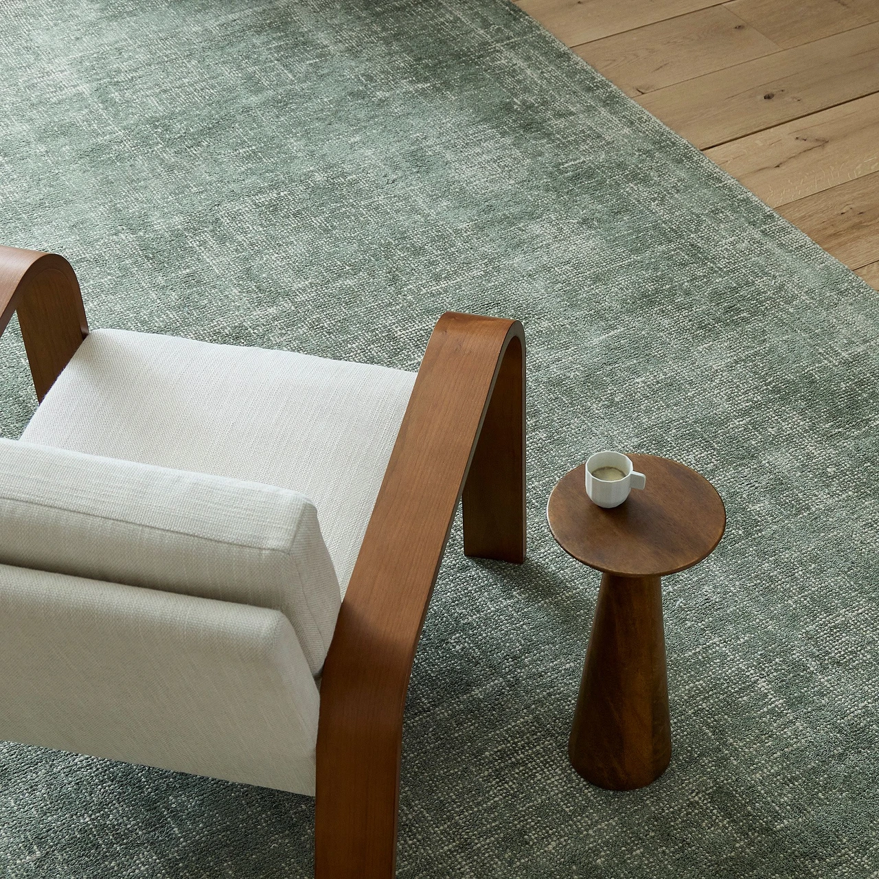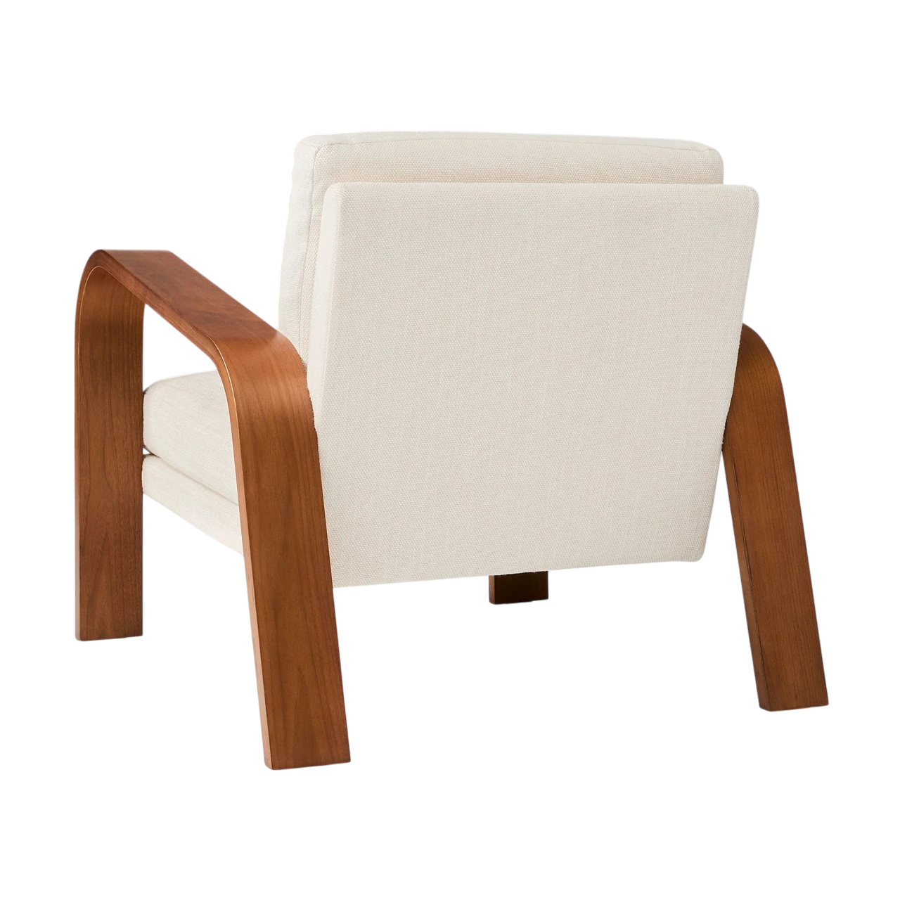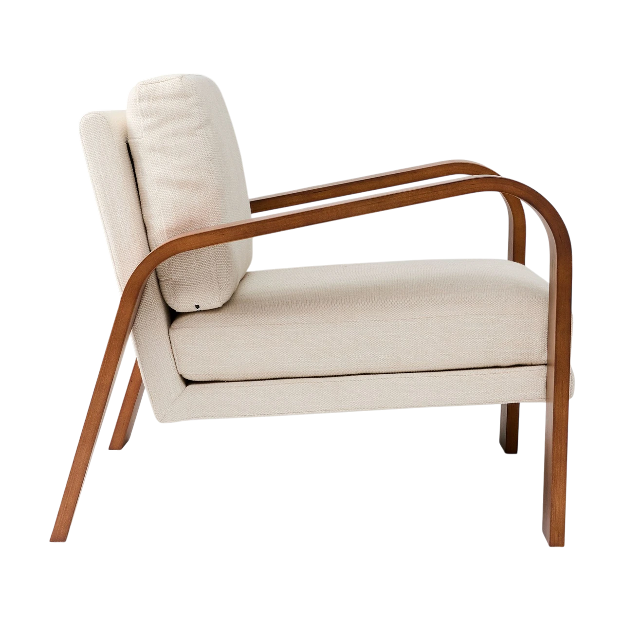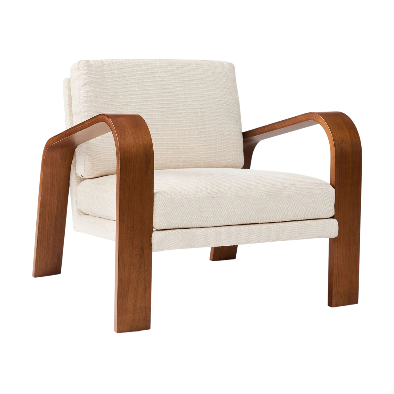 The Hugo Chair offers a refined update to the classic mid-century show wood chair, defined by its curved bentwood arms and rich walnut finish. The sculpted frame highlights the warmth and grain of the wood, while the upholstered cushions provide a comfortable, inviting contrast.