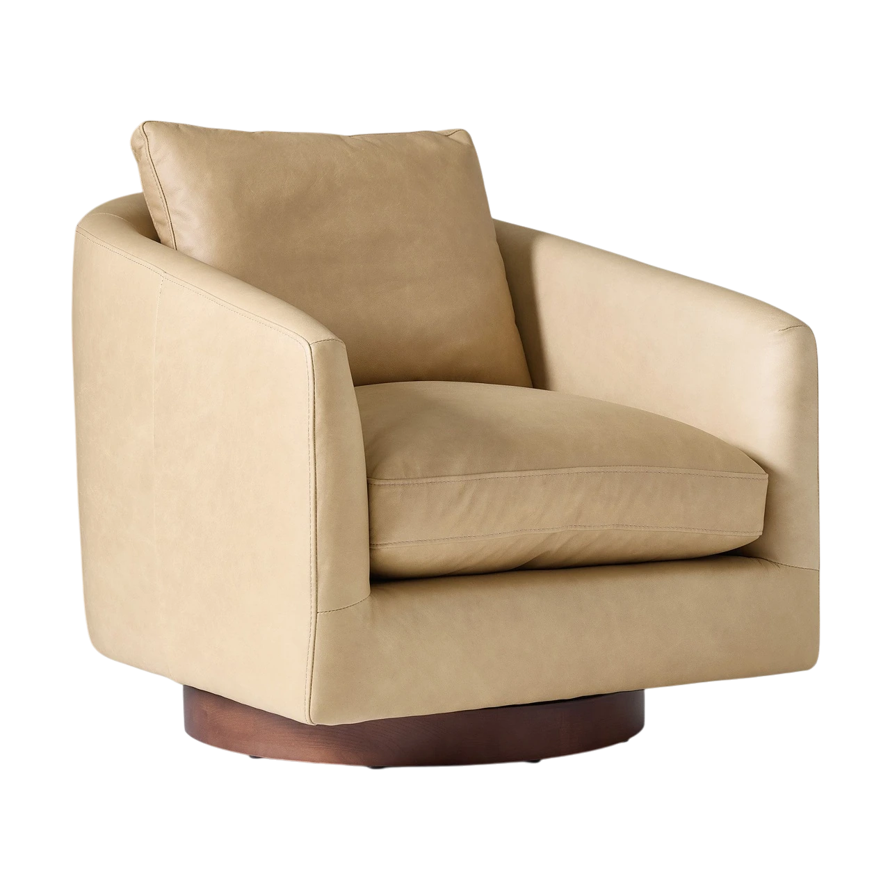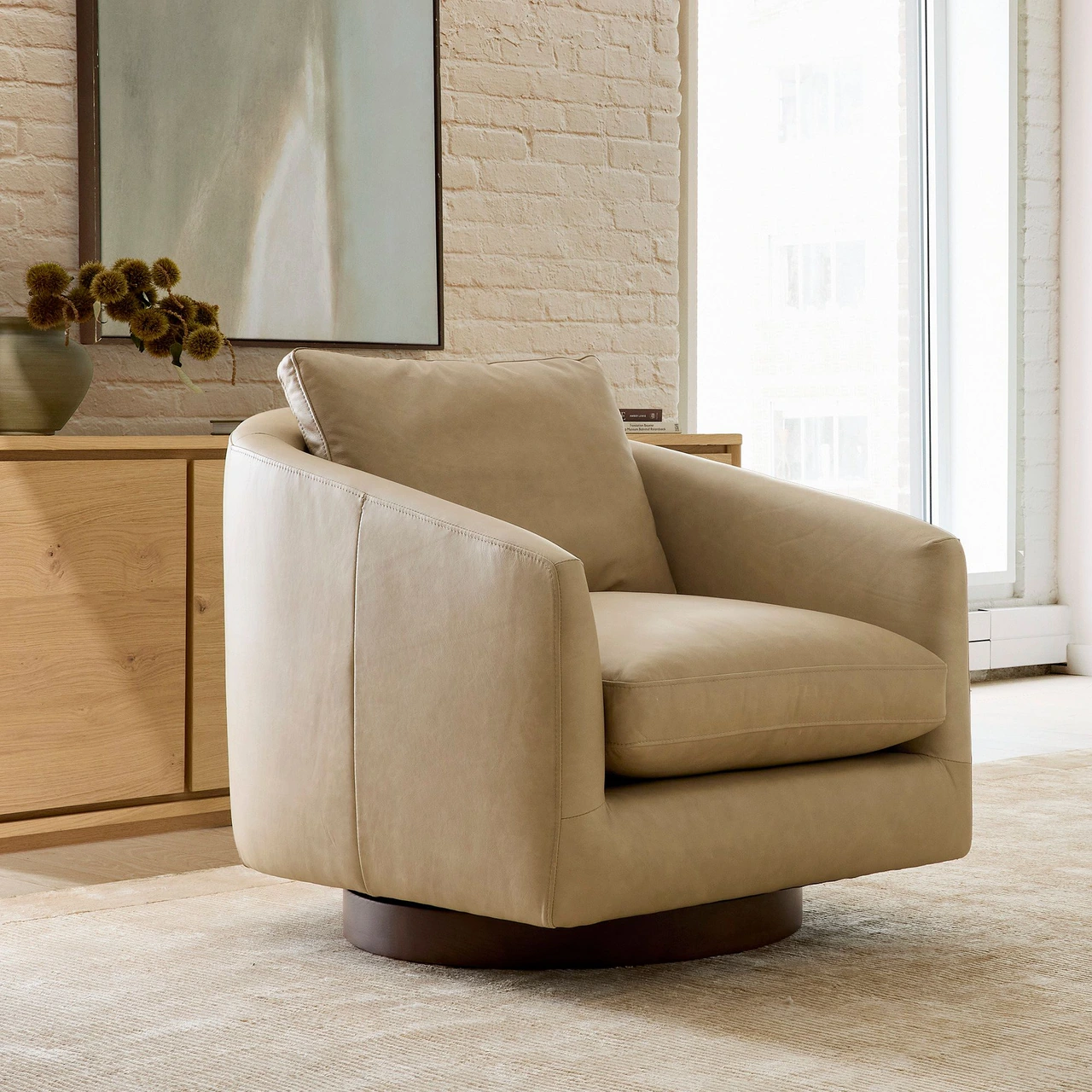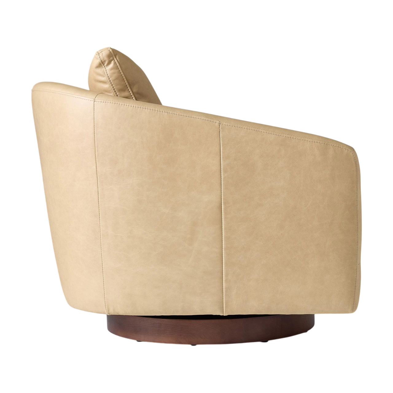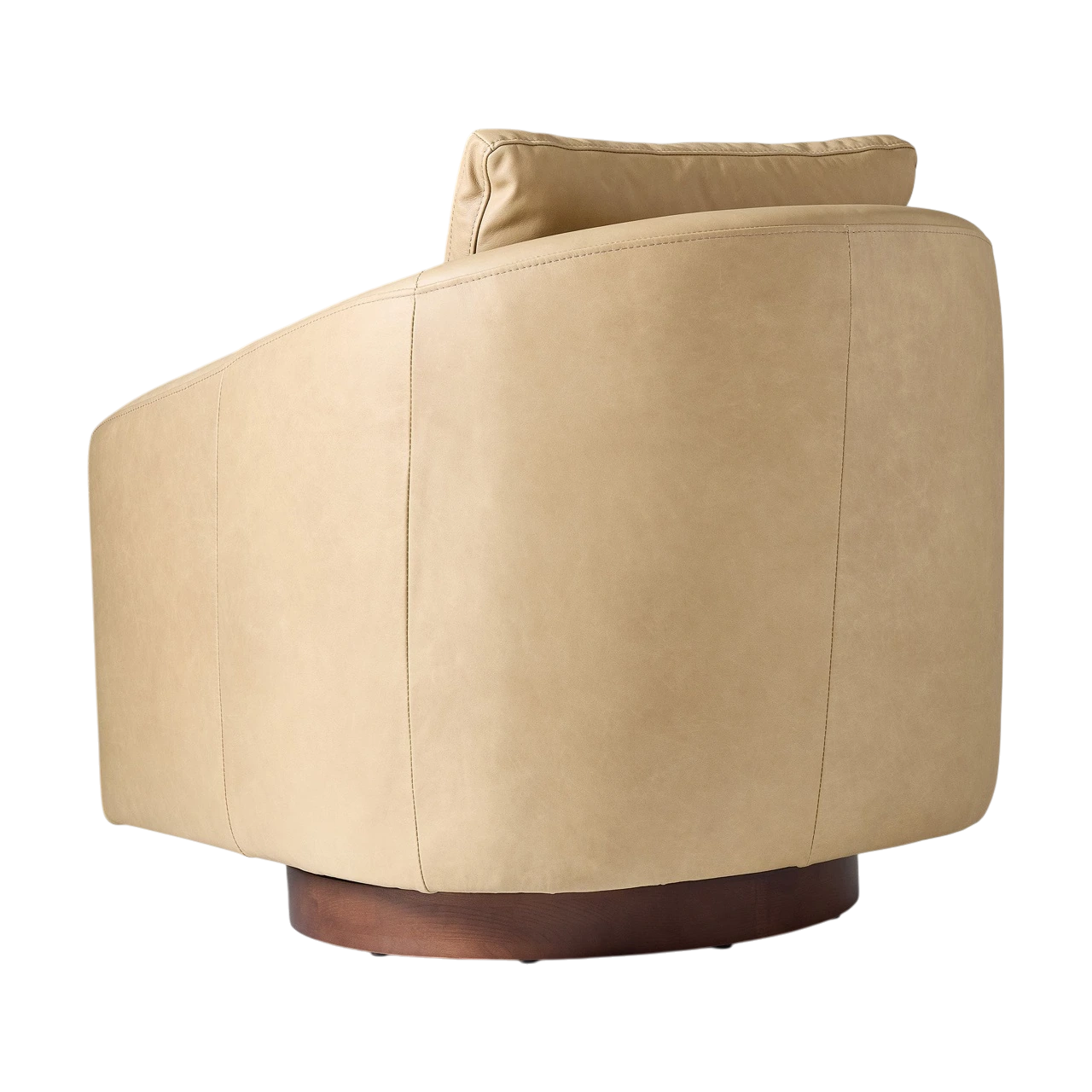 The Imogene Leather Swivel Chair combines sculptural form with supple materials, featuring a curved barrel back and a refined wood swivel base. |
