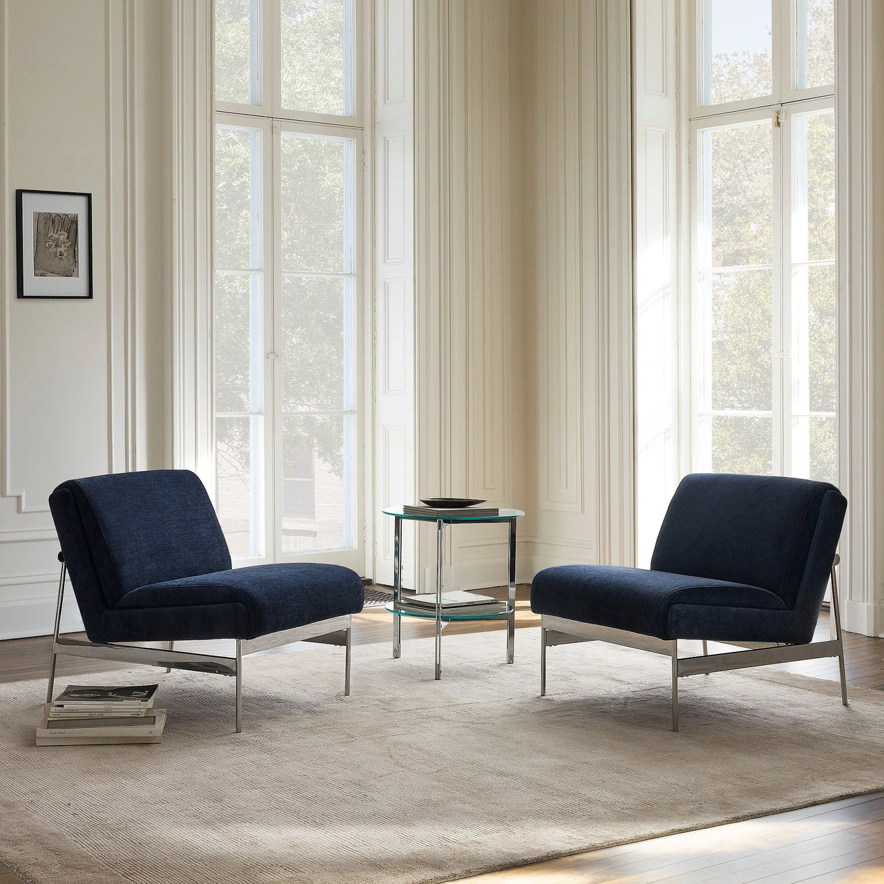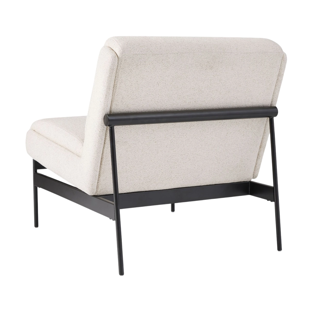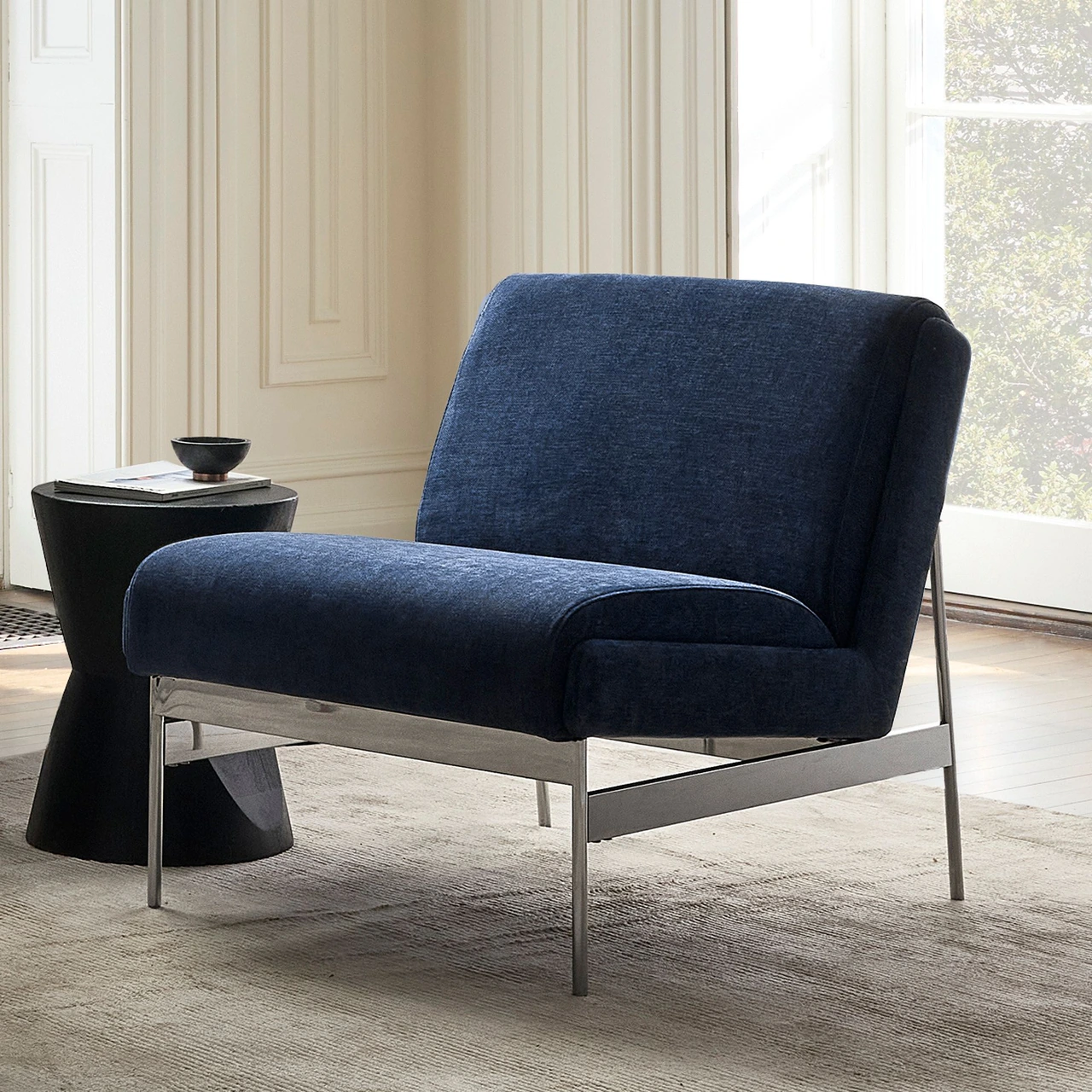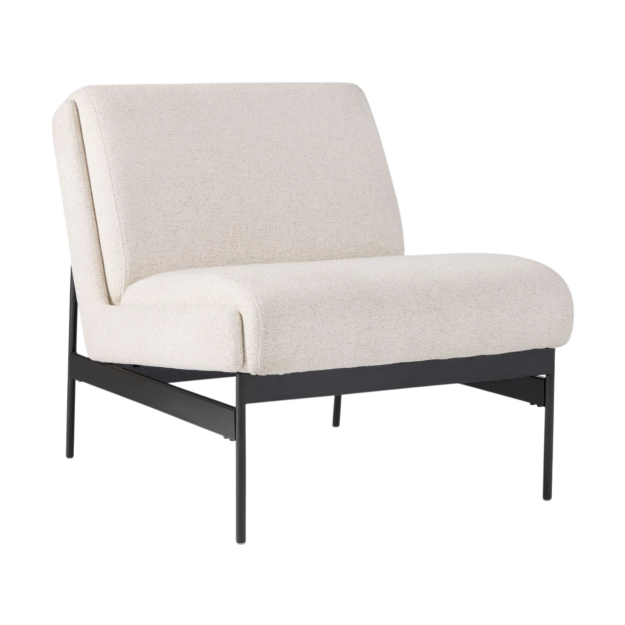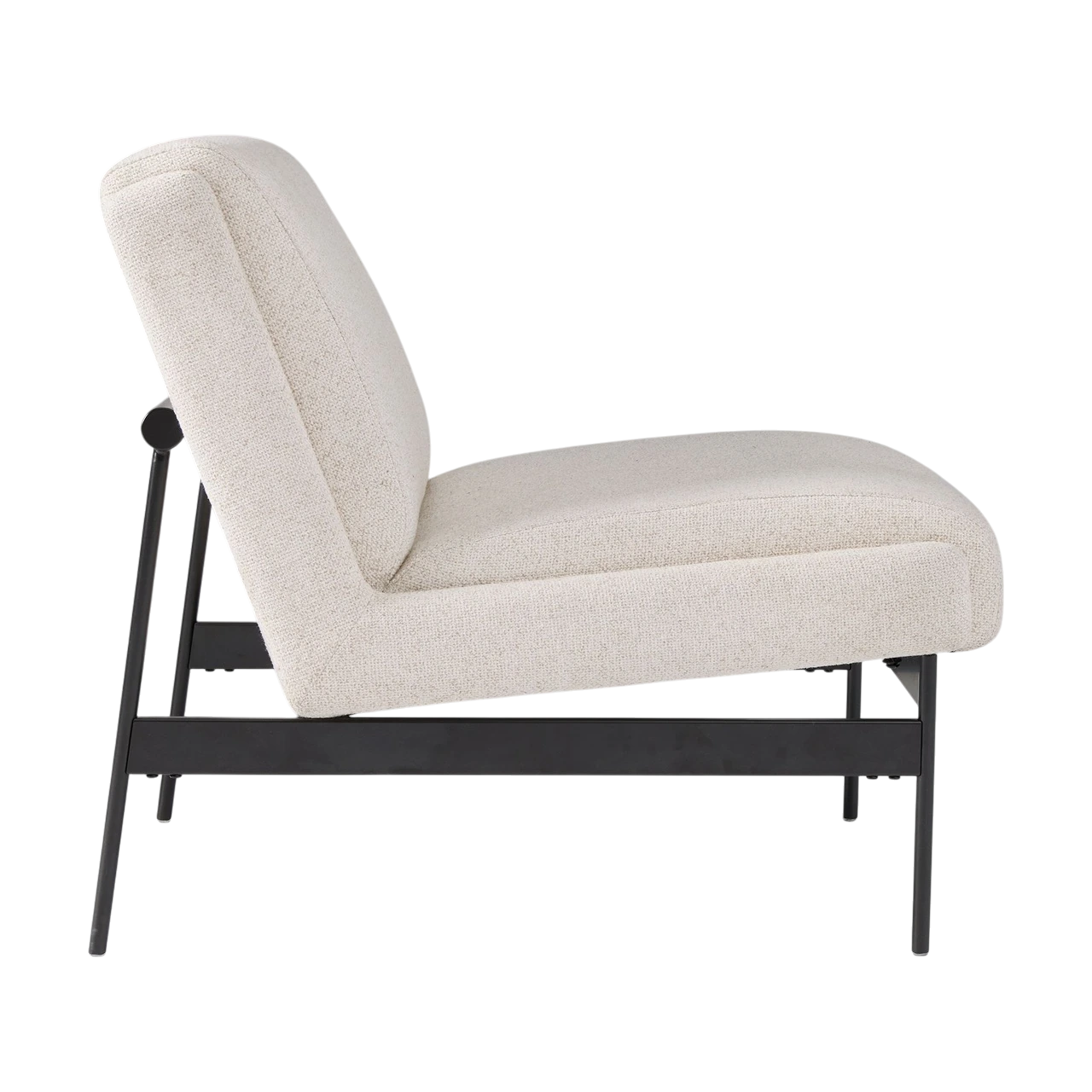 The Lacon Slipper Chair combines minimalist design with inviting comfort. Its armless, low-profile form and angled seat create an easy, lounge-ready feel, while the slim metal base provides a refined contrast to the generously cushioned seat and back.