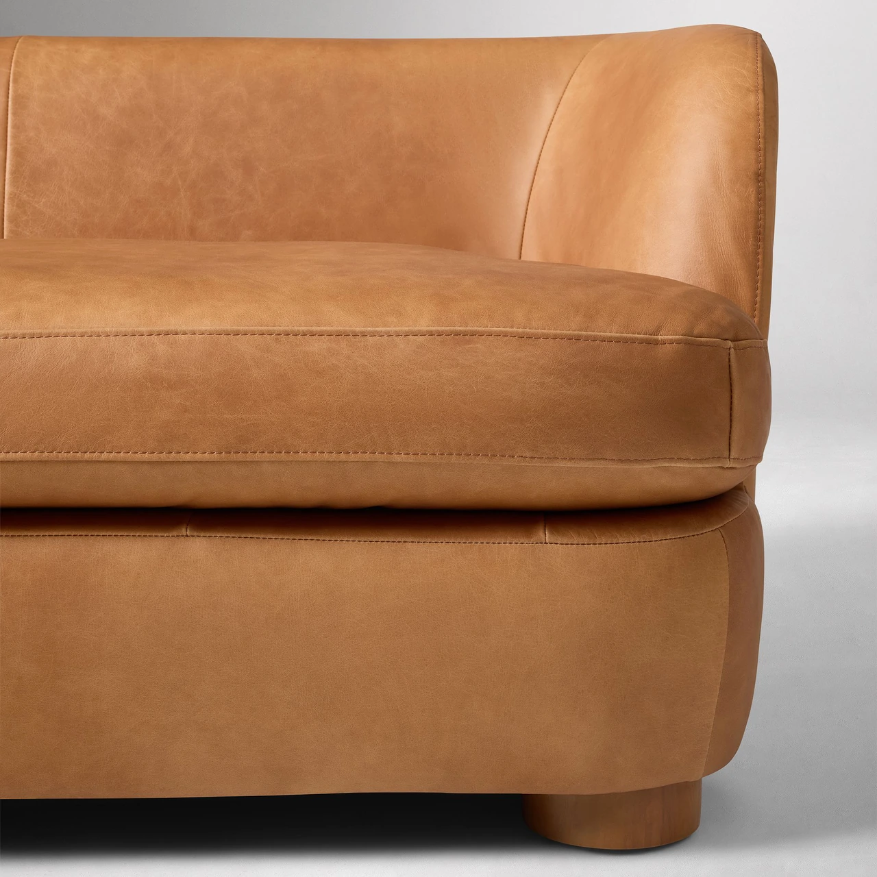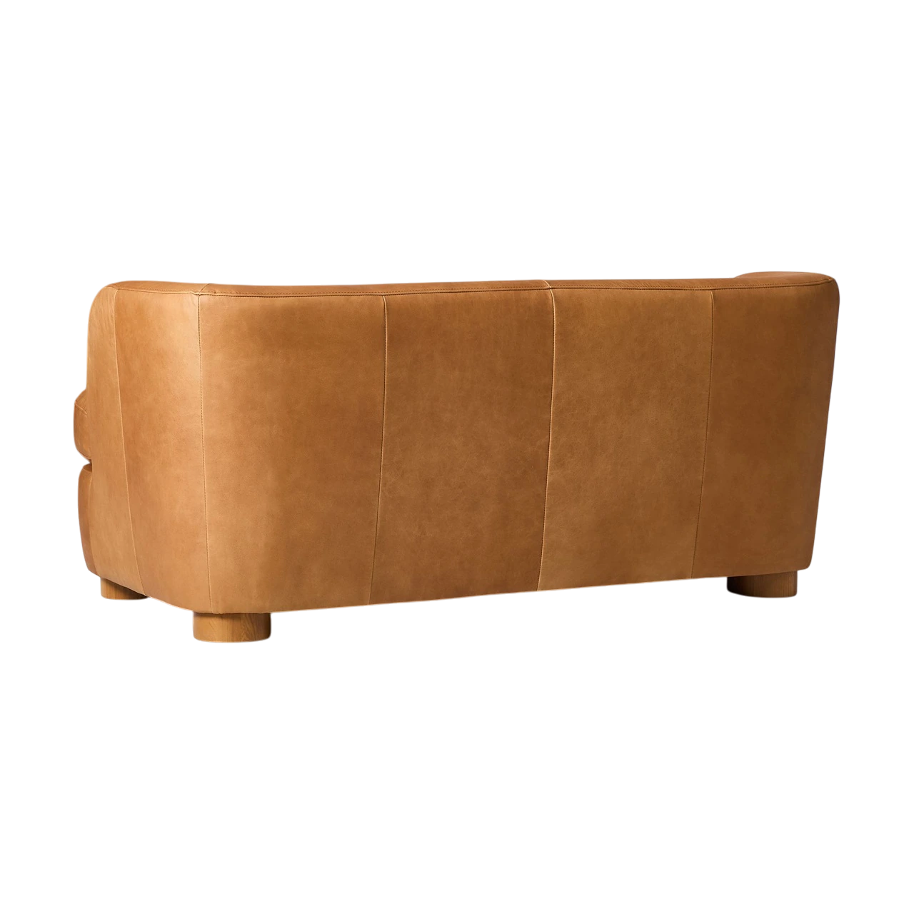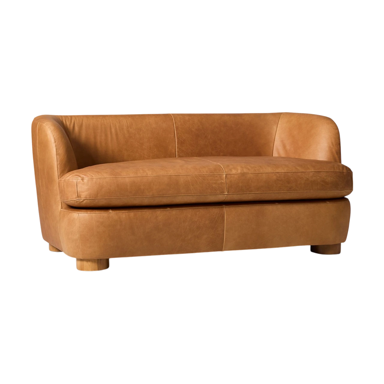 The Leroy Leather Loveseat features a curved back and arms that create a comfortable, enveloping shape. Its compact, low-profile form and rounded wood legs lend a modern, sculptural quality ideal for smaller living areas or statement seating.