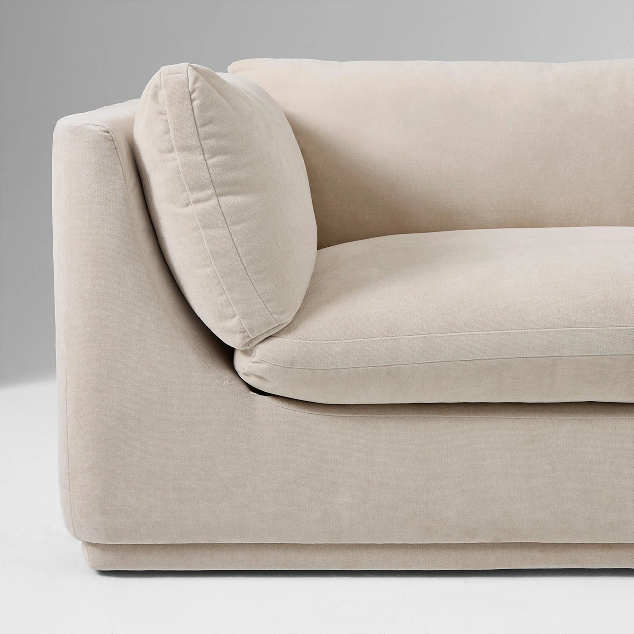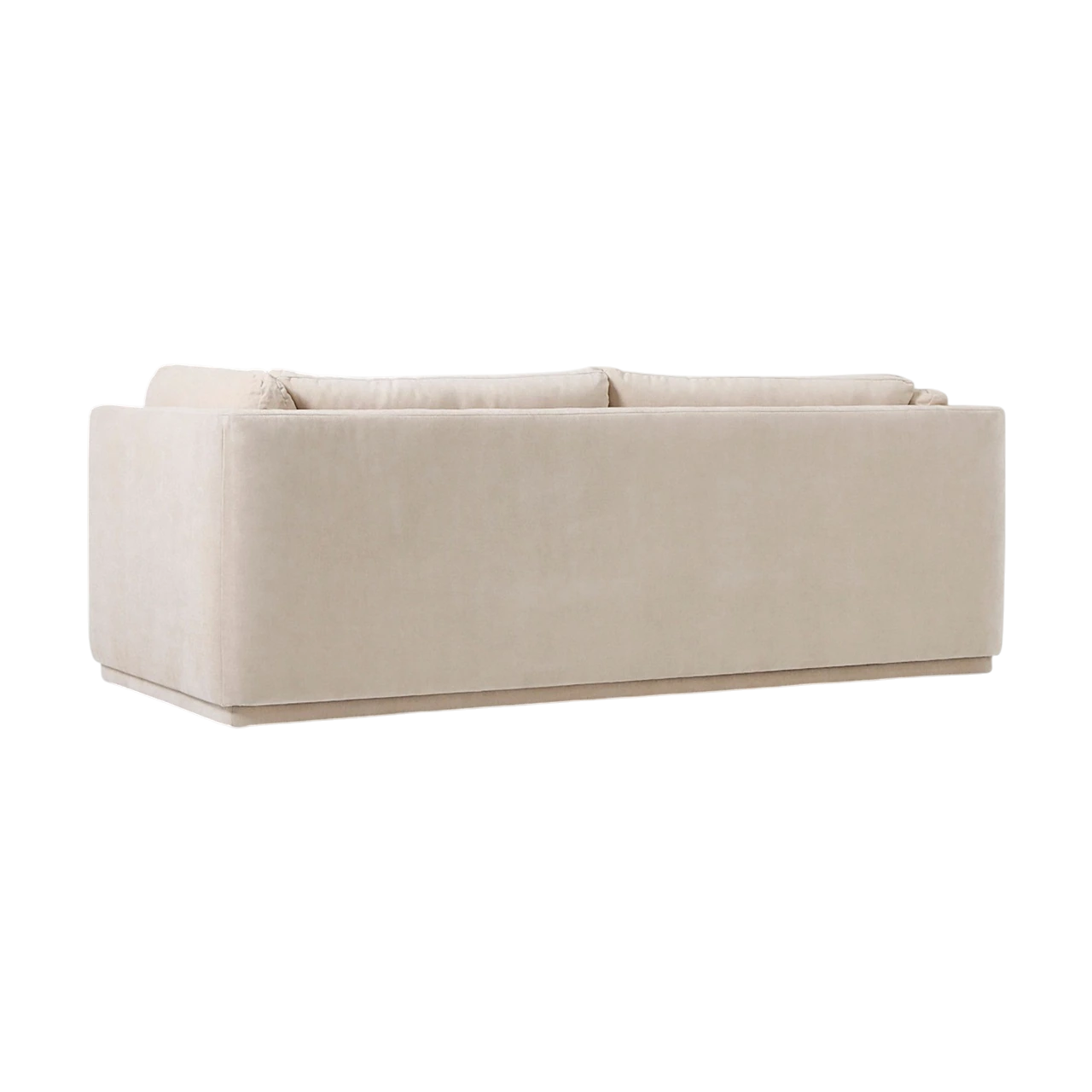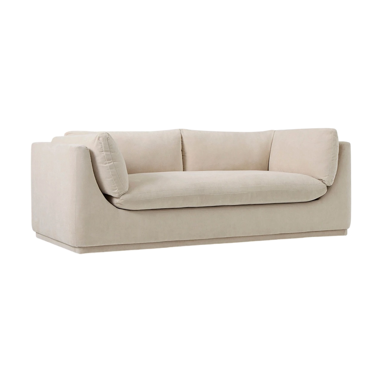 The Loring Sofa features a smooth, curved silhouette and deep, inviting seat designed for relaxed lounging. Its low, rounded profile gives it a sculptural, contemporary look while maintaining a plush, comfortable feel.