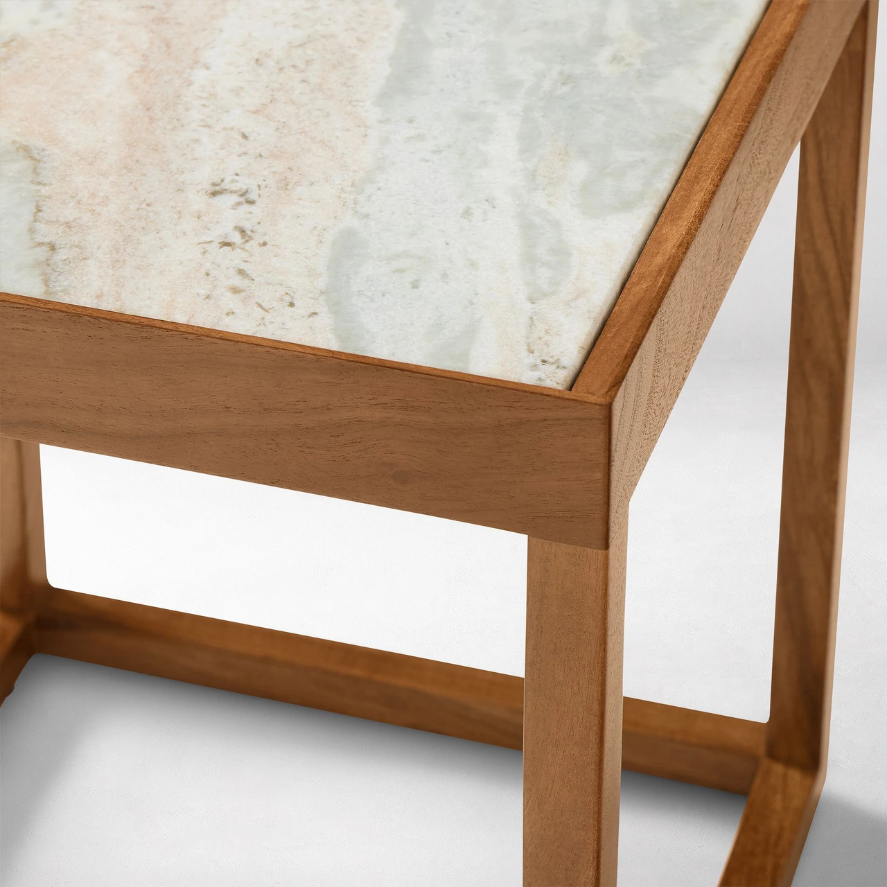 Side table available with two material combinations: Sawar marble top with solid acacia wood frame in Cool Walnut, or travertine top with solid hemlock wood frame in Blonde. |