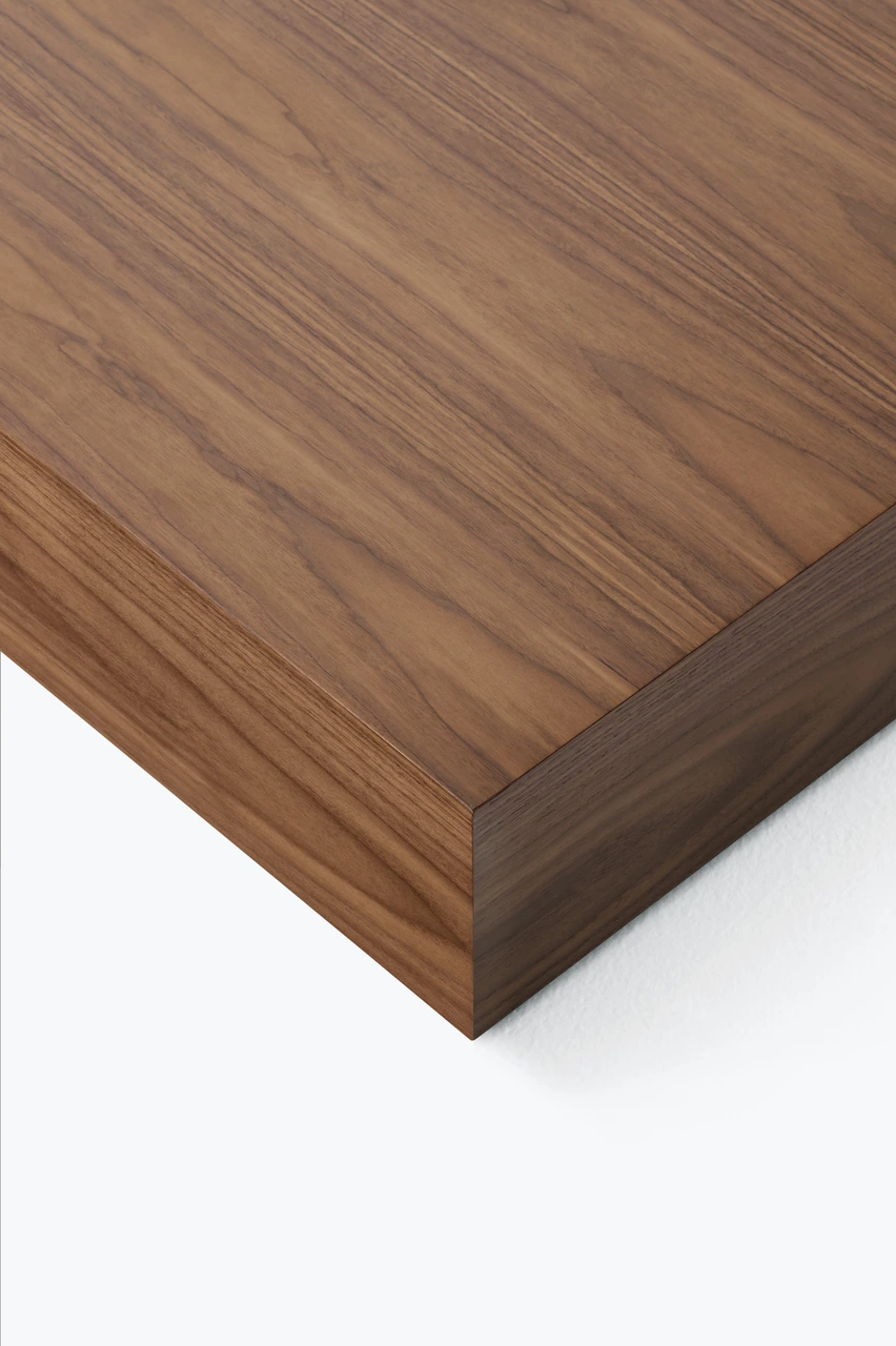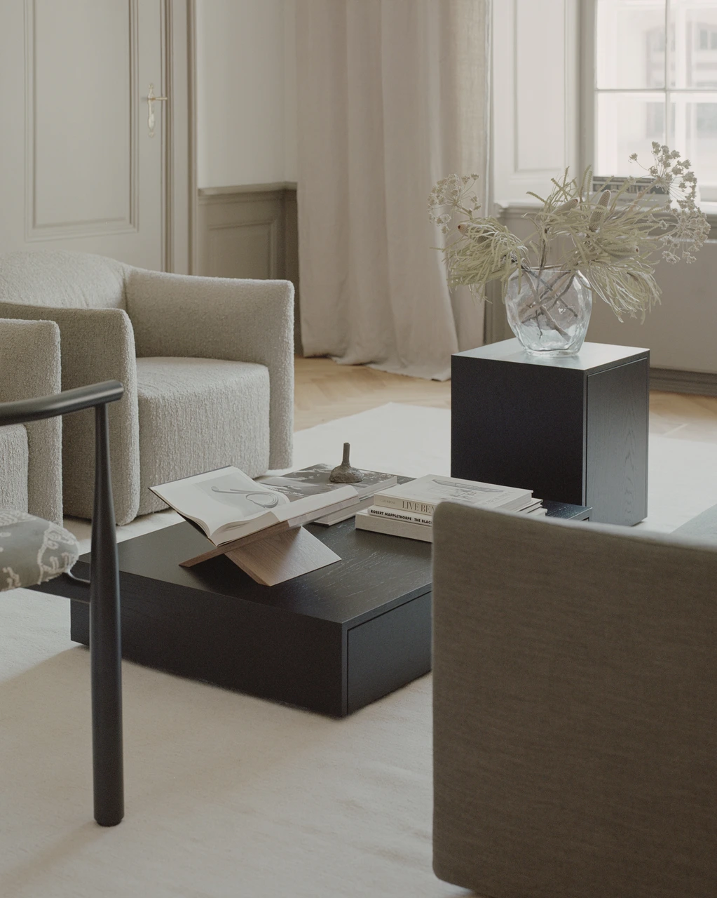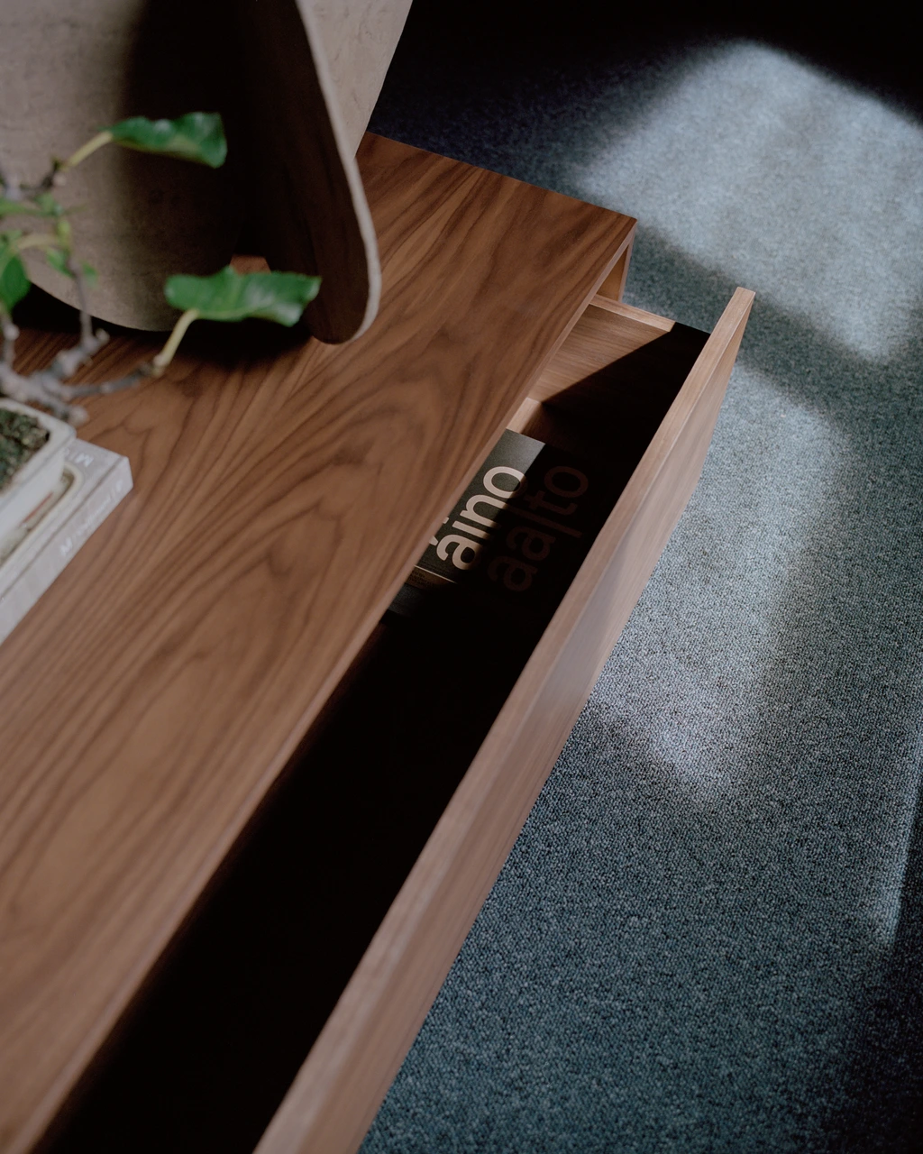 A sculptural simplicity and honest palette of materials bring the family together. The table comes in three finishes, walnut, natural oak, and black-stained oak, with an optional drawer available in both the walnut and black versions.