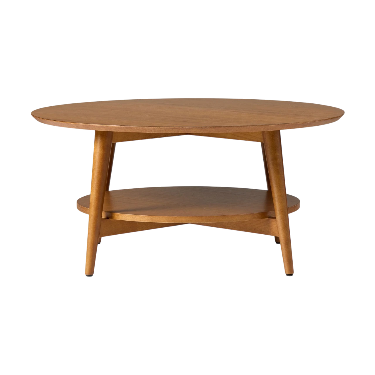 The Mid-Century Round Coffee Table draws inspiration from classic 1950s and 1960s design. Its rounded profile and tapered legs highlight the warmth of eucalyptus wood in a smooth Acorn finish.
