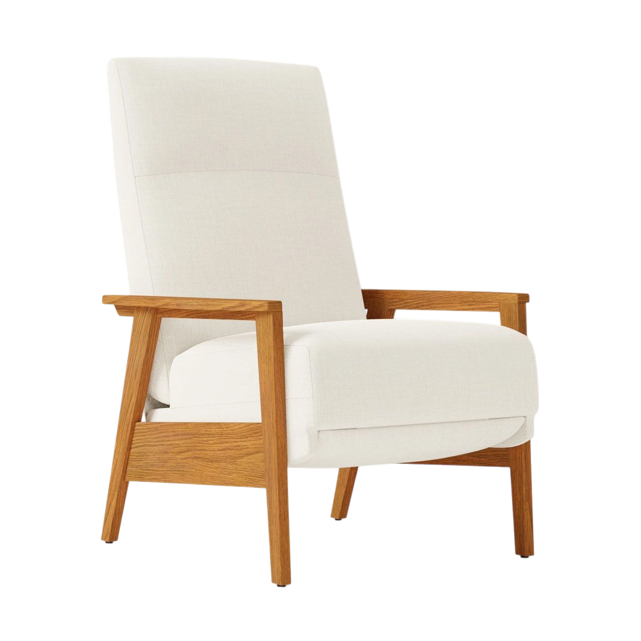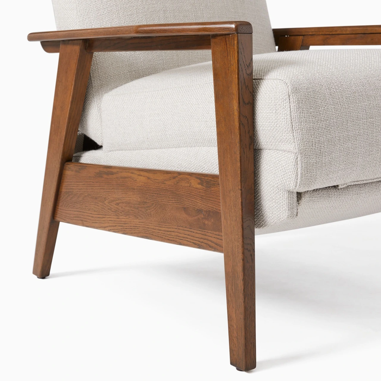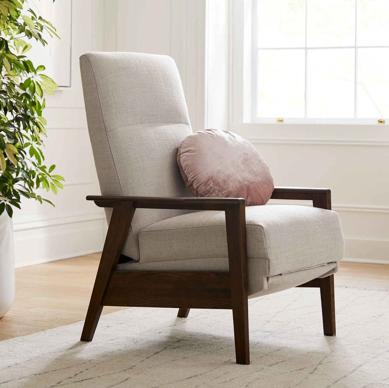The Mid-Century Show Wood Recliner combines classic form with functional design. Its exposed wood frame and gently sloped arms echo the clean lines and proportions of mid-century furniture, while a concealed reclining mechanism maintains its refined appearance.