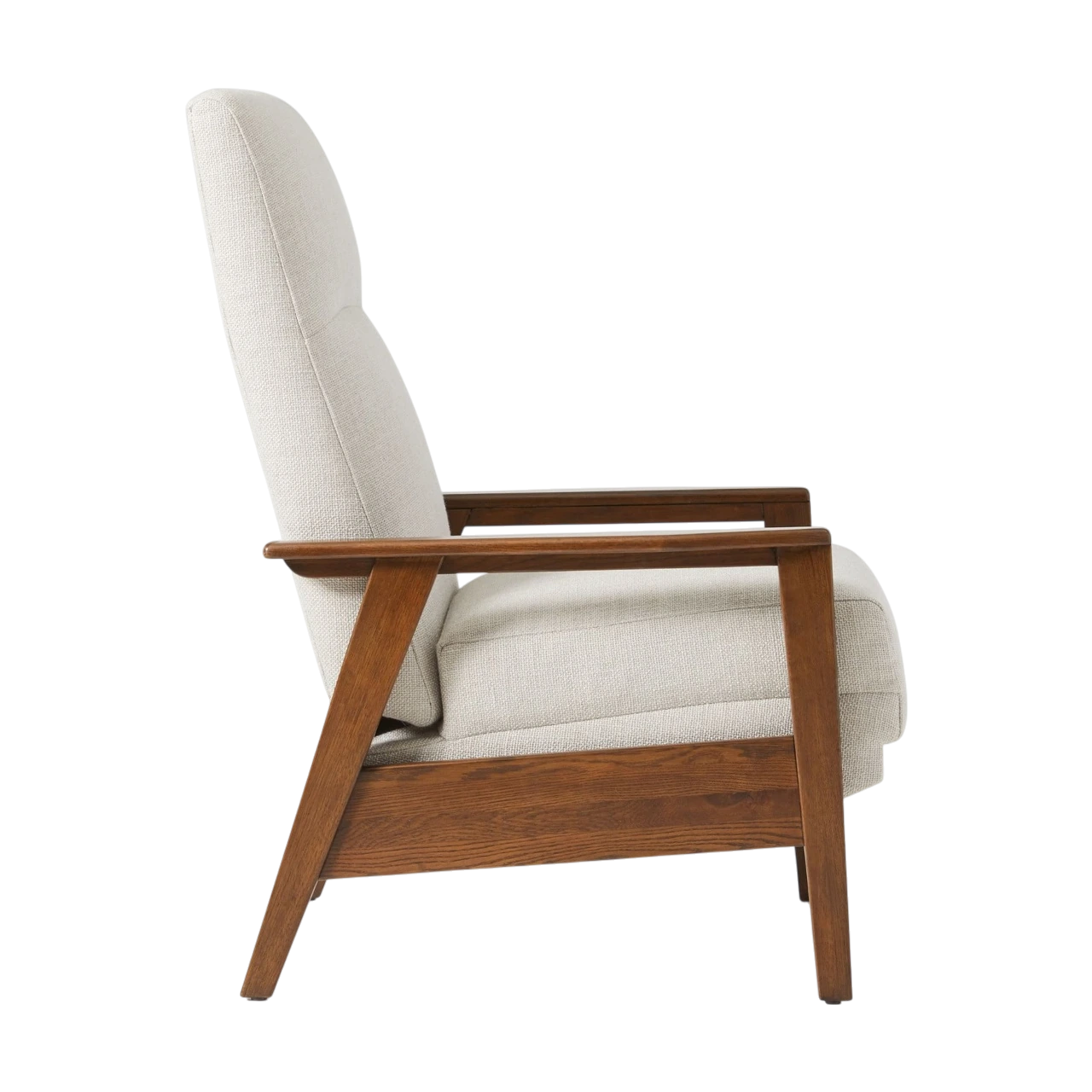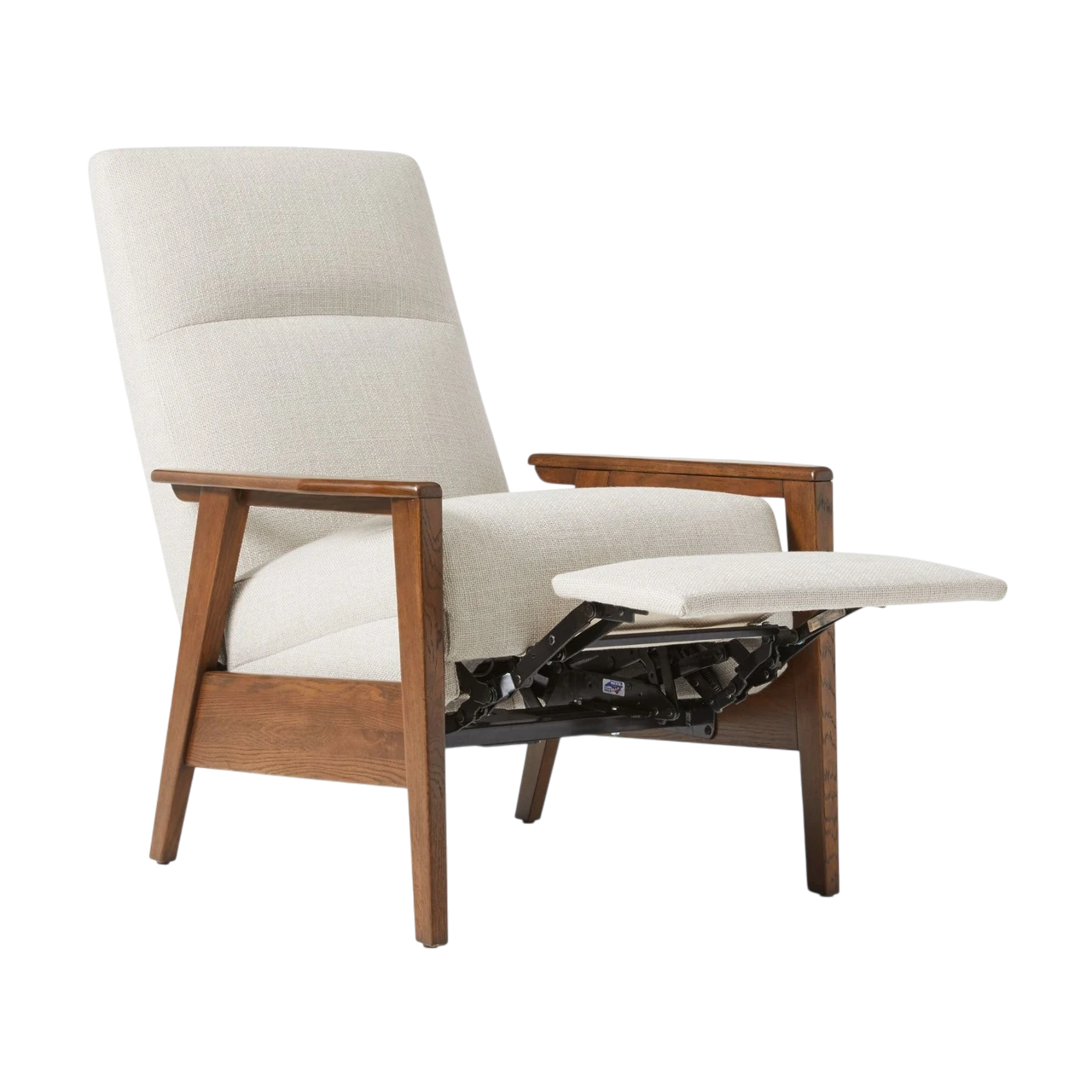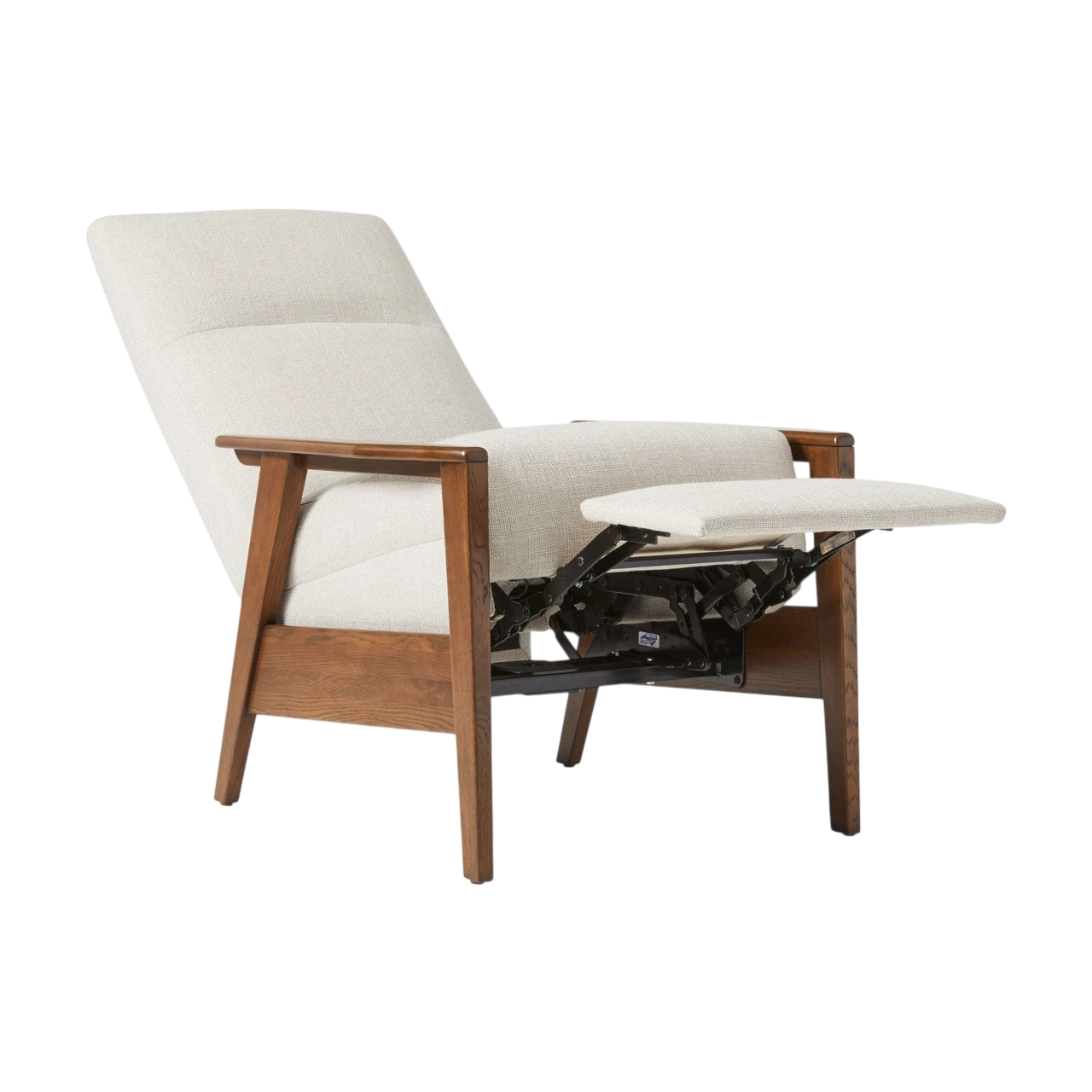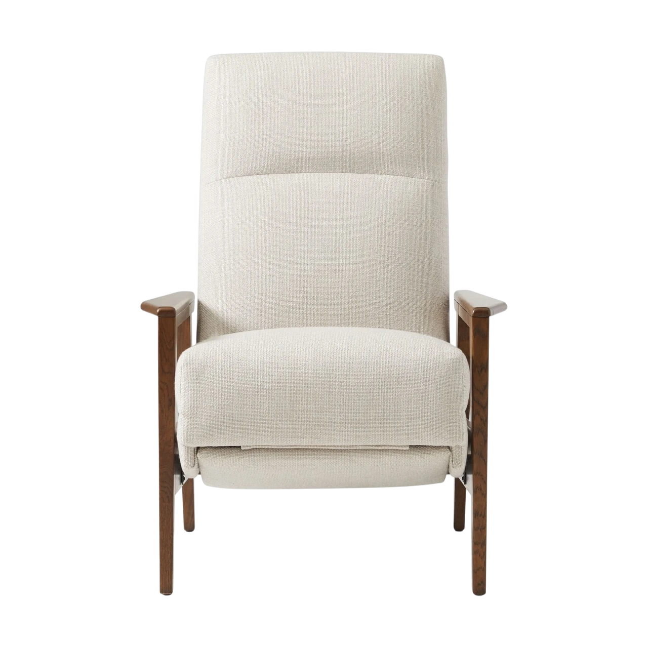 The Mid-Century Show Wood Recliner combines classic form with functional design. Its exposed wood frame and gently sloped arms echo the clean lines and proportions of mid-century furniture, while a concealed reclining mechanism maintains its refined appearance.