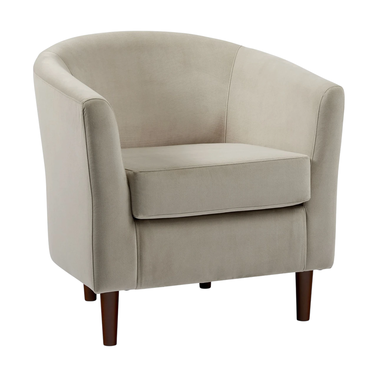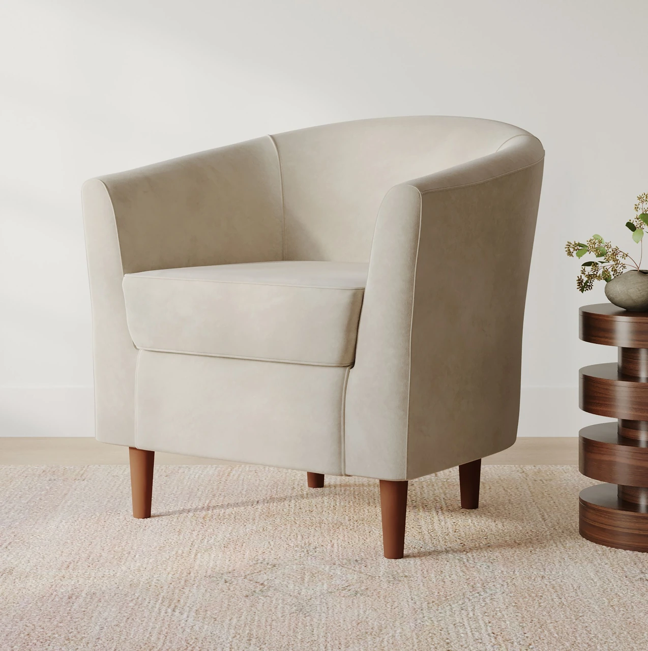 The Mila Chair combines a sculptural shape with everyday comfort. Its tub-style form curves gently around the back and arms, creating a supportive seat suited for relaxed conversation or quiet reading. The smooth upholstery and tailored stitching emphasize its refined craftsmanship, while the compact size allows it to fit comfortably in a variety of living spaces.