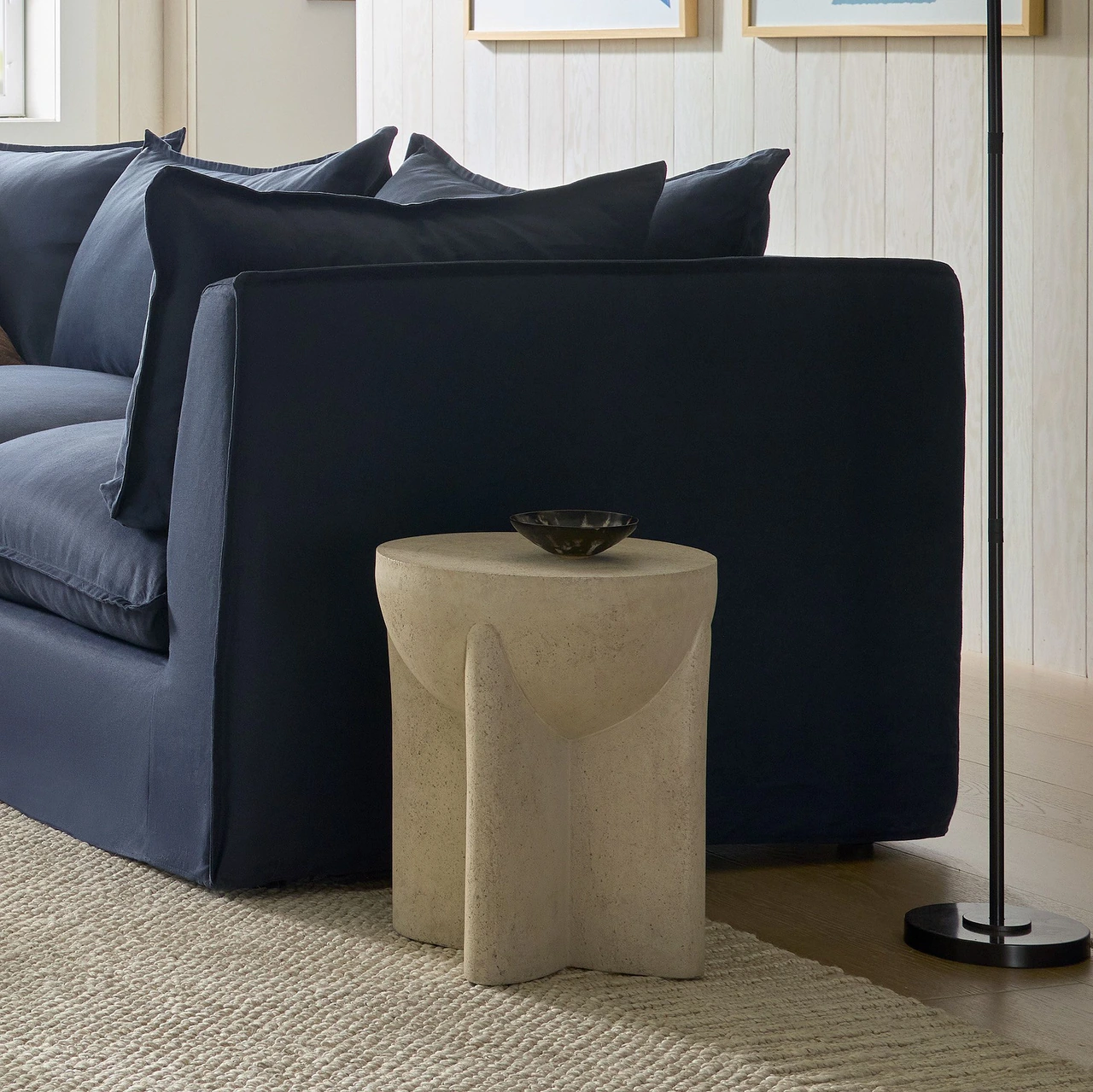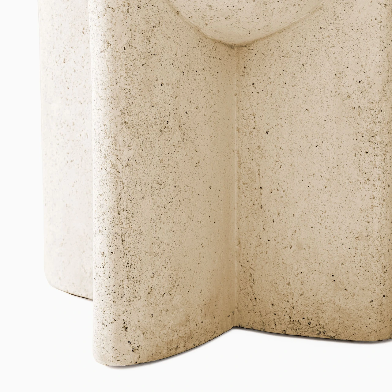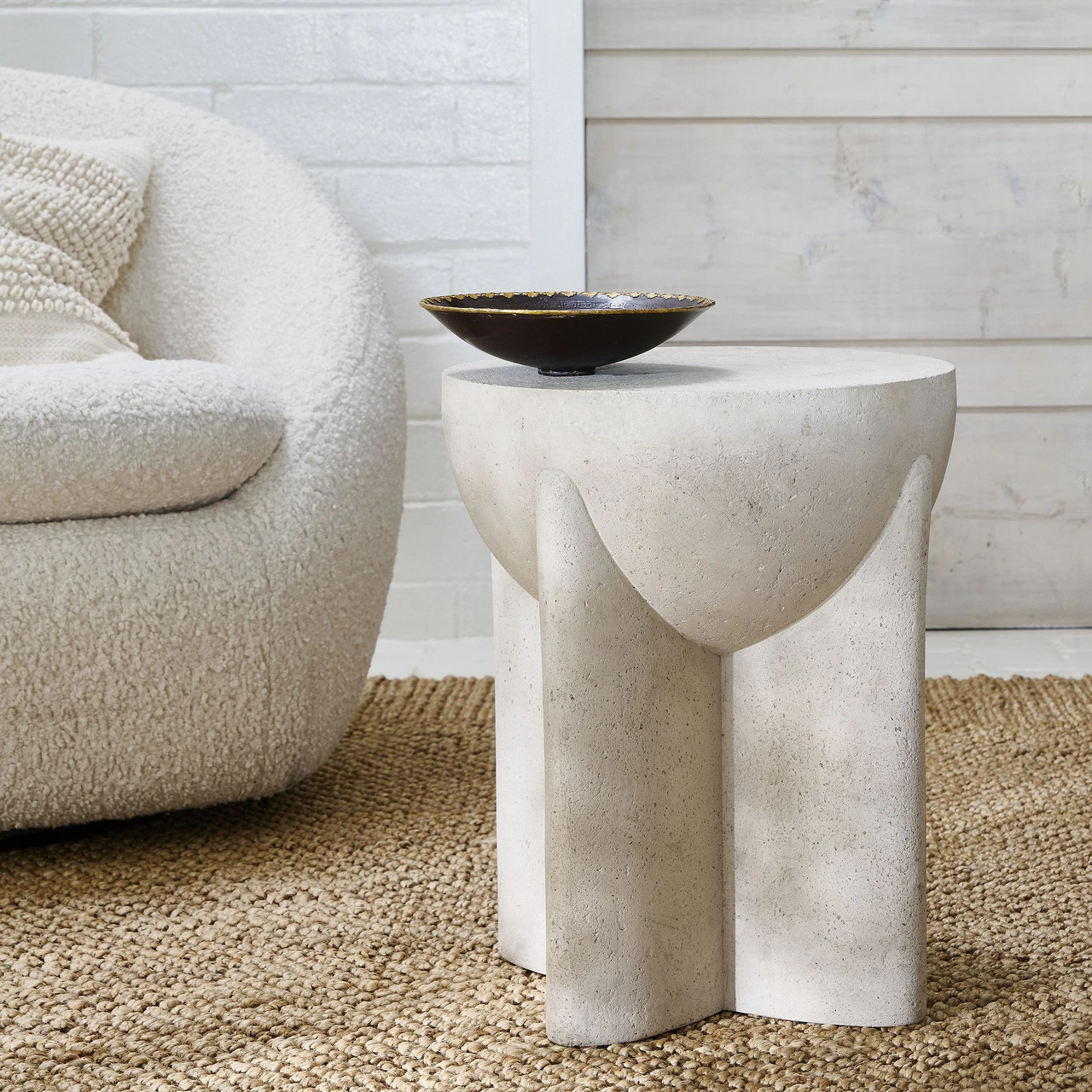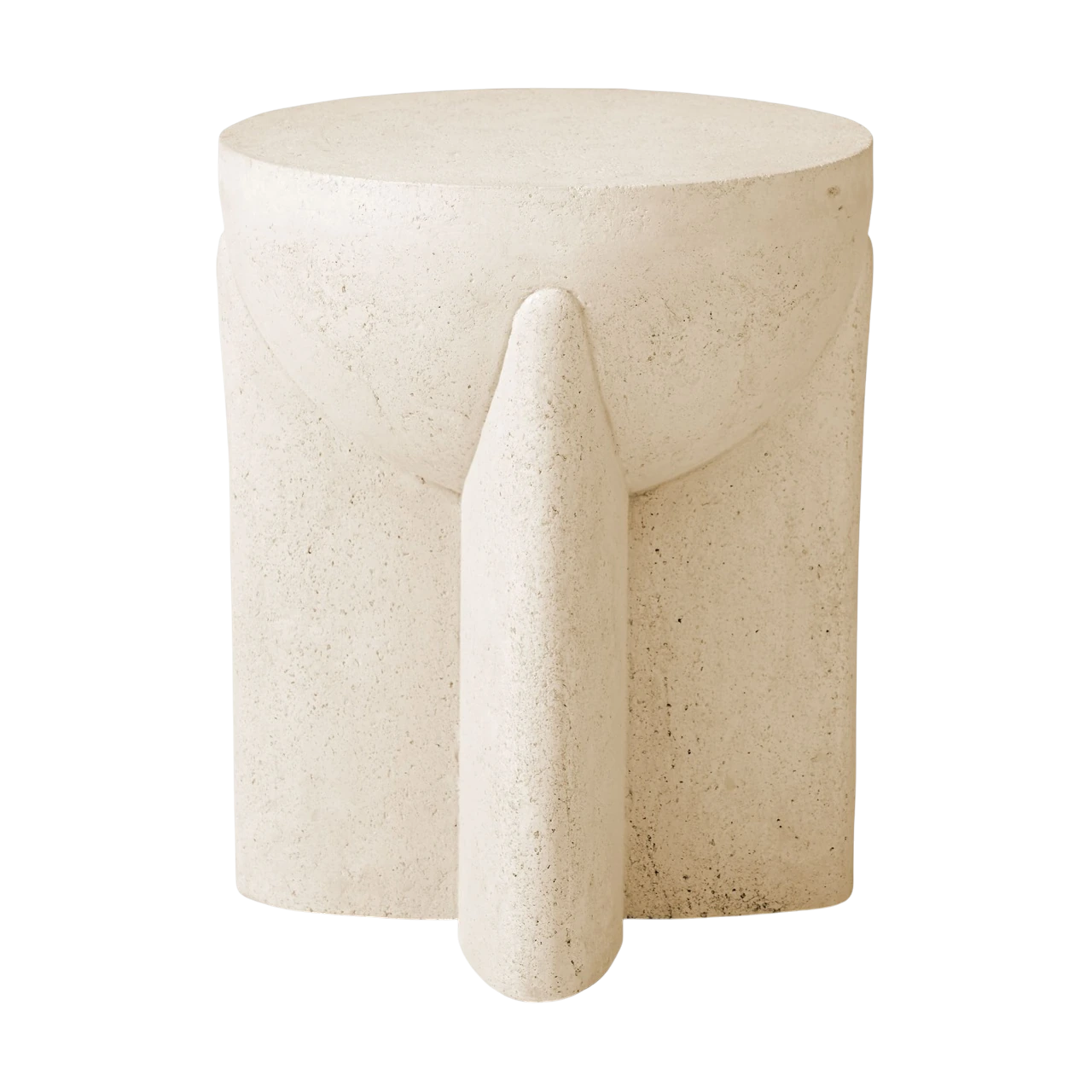 Round side table made from stone composite, engineered to be lighter than concrete while maintaining durability. |