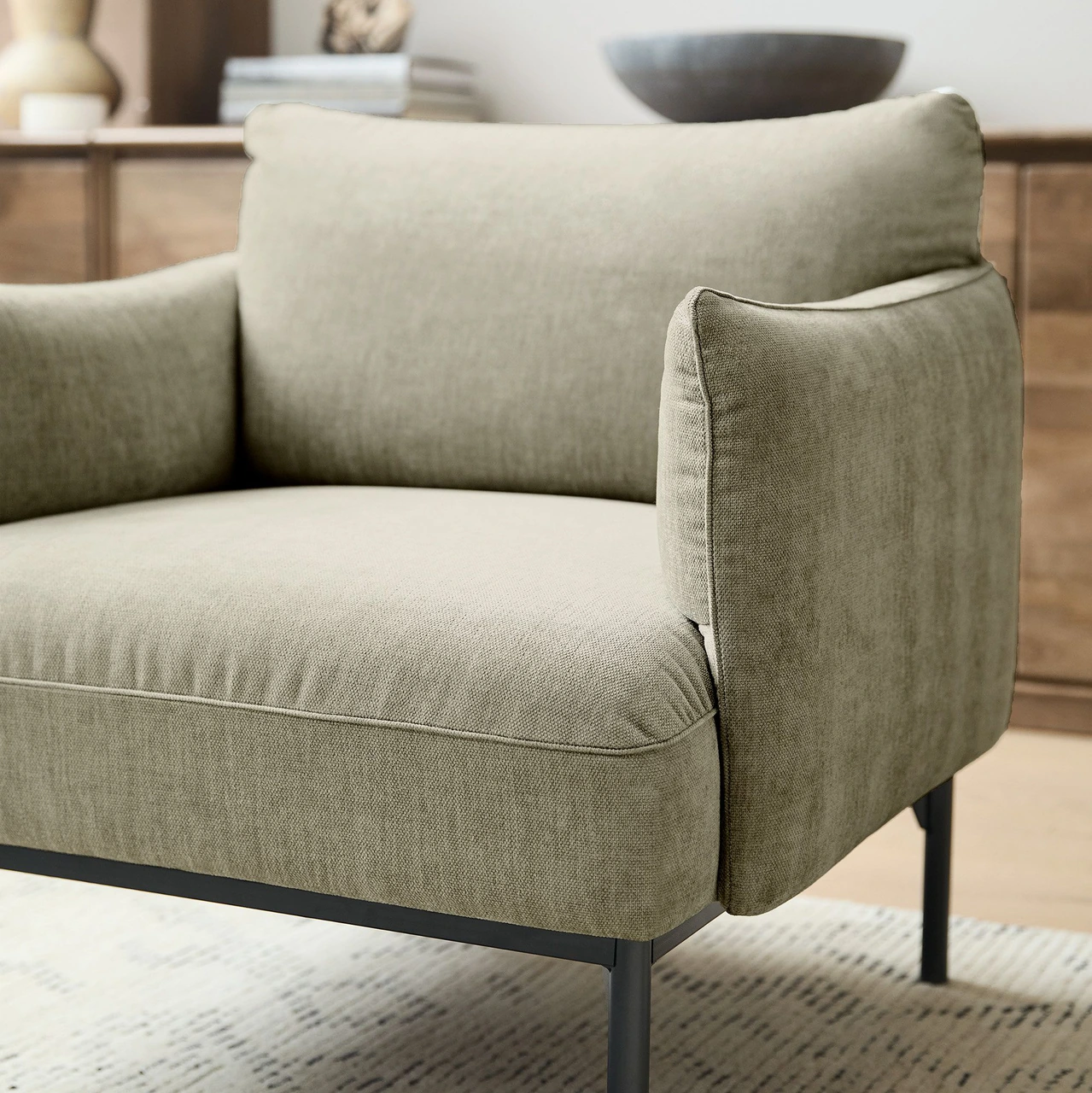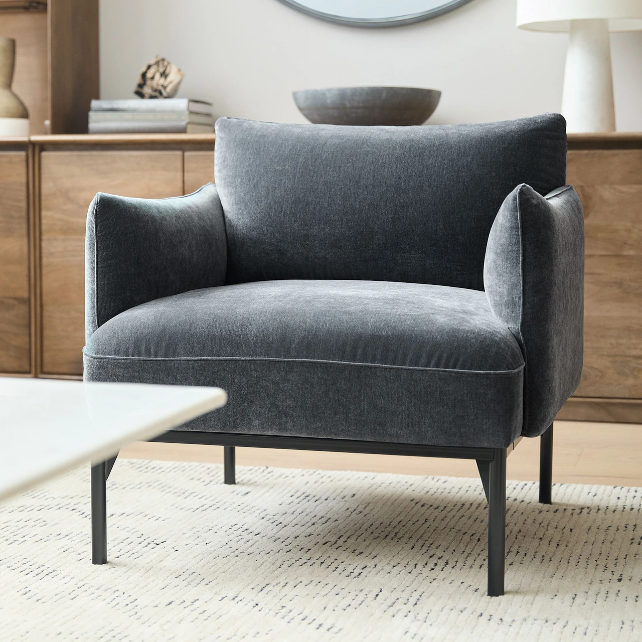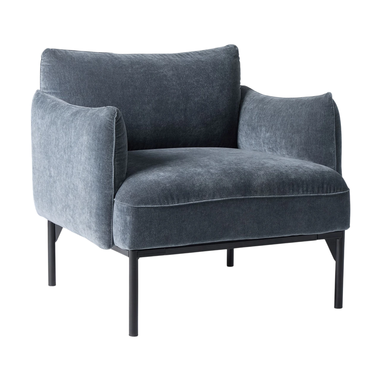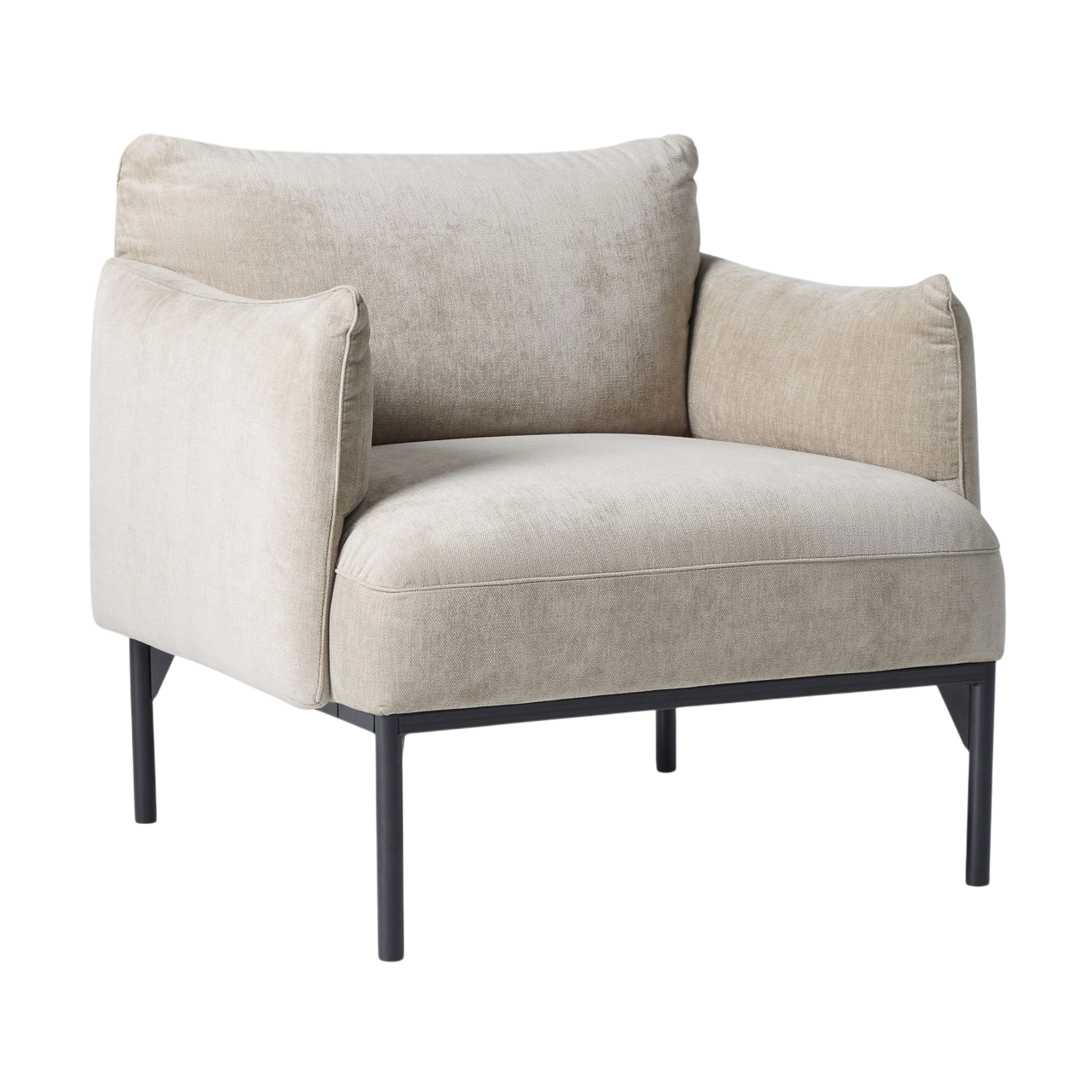 The Penn Chair combines modern structure with relaxed comfort. Its soft upholstery and subtly curved arms create an inviting shape, while the raised metal base gives the design a light, contemporary feel. The mix of textures—from plush fabric to sleek metal—adds visual depth without overwhelming a space.
