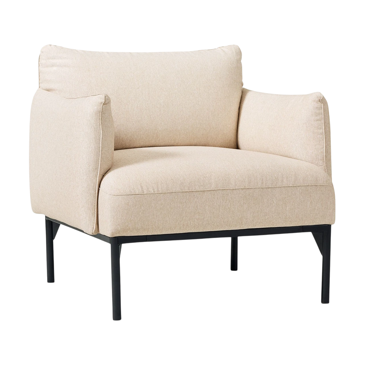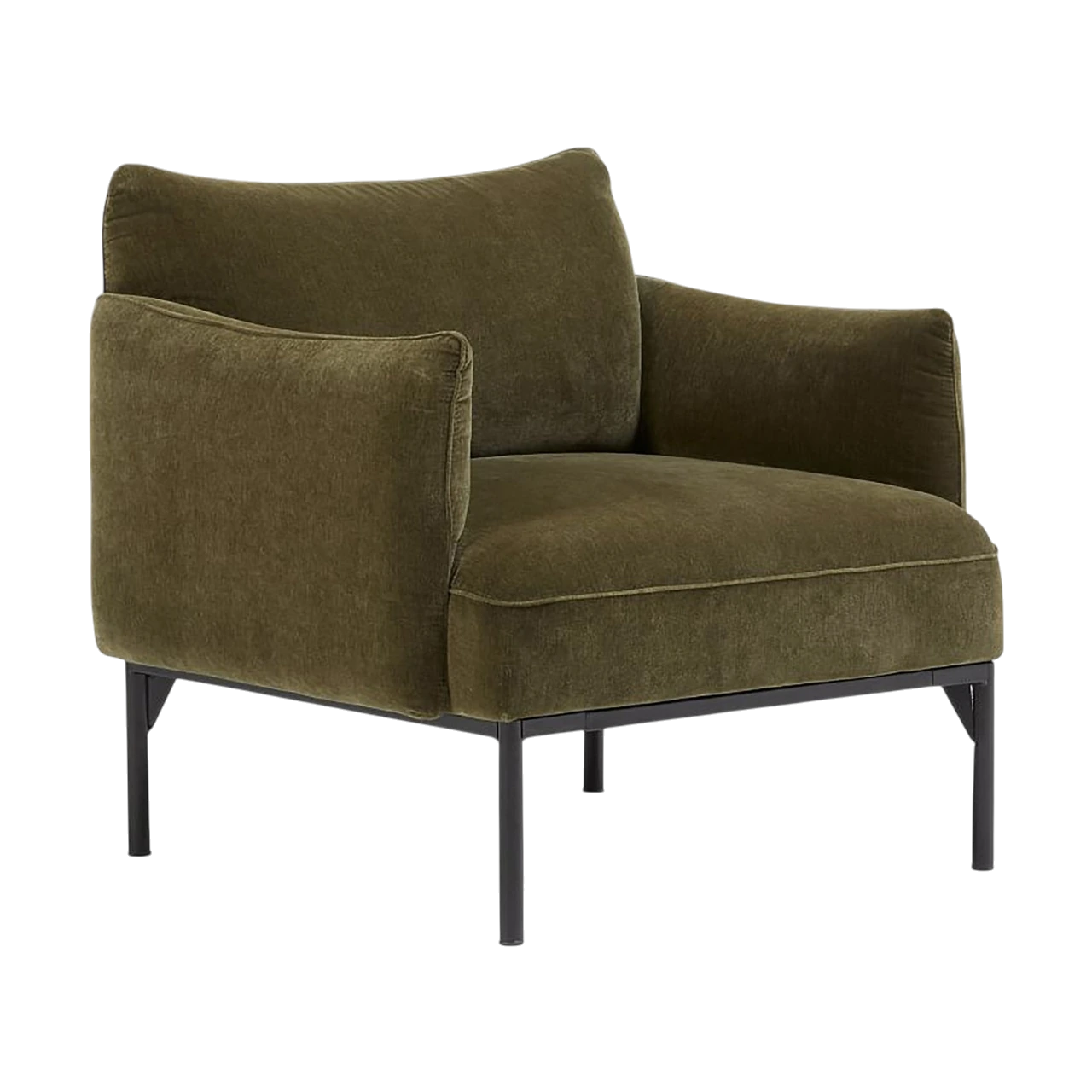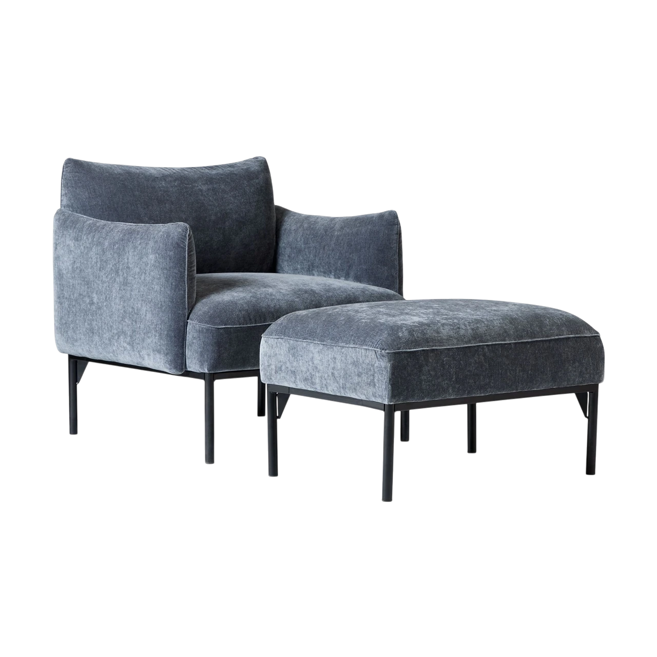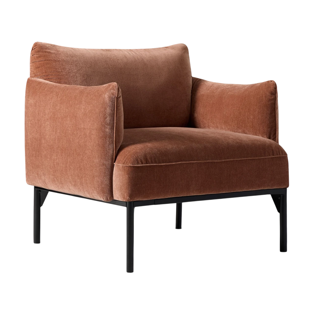 The Penn Chair combines modern structure with relaxed comfort. Its soft upholstery and subtly curved arms create an inviting shape, while the raised metal base gives the design a light, contemporary feel. The mix of textures—from plush fabric to sleek metal—adds visual depth without overwhelming a space.