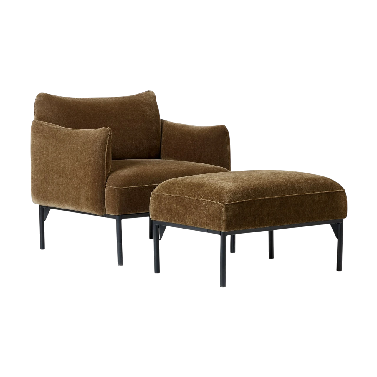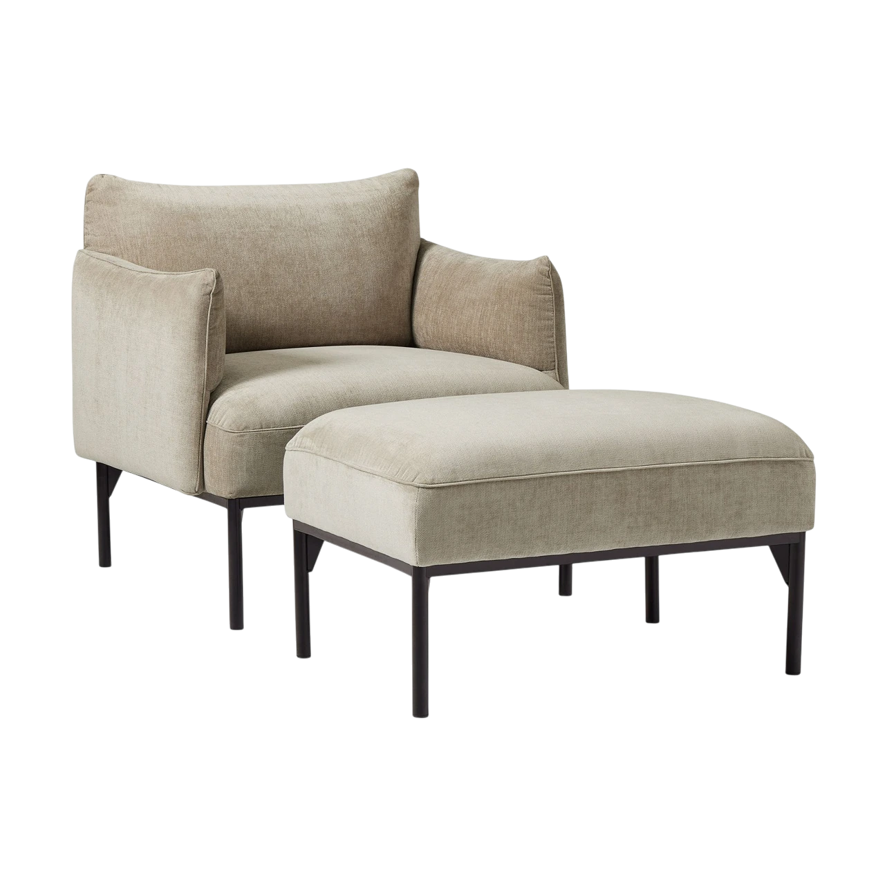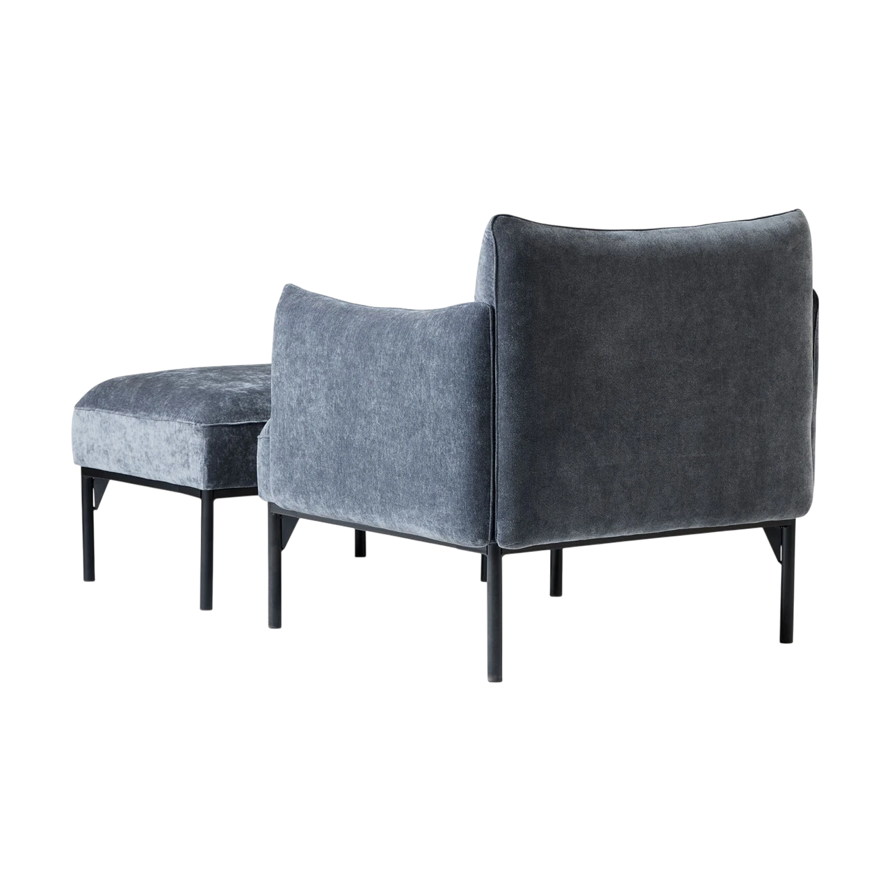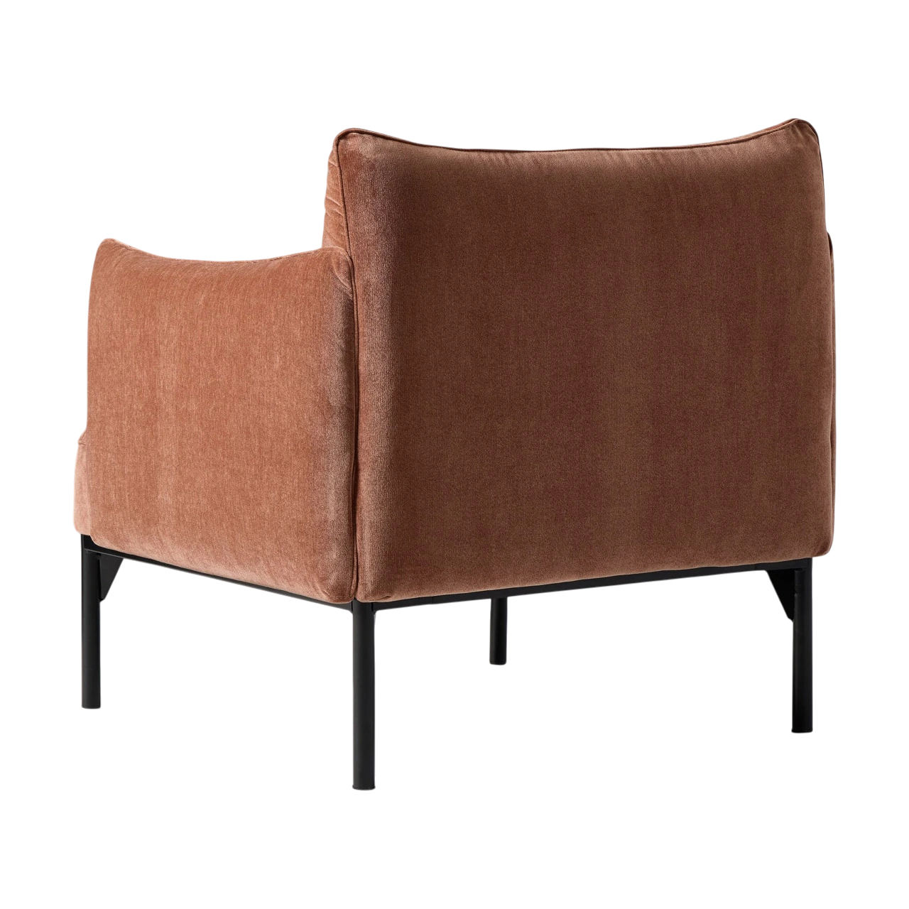 The Penn Chair combines modern structure with relaxed comfort. Its soft upholstery and subtly curved arms create an inviting shape, while the raised metal base gives the design a light, contemporary feel. The mix of textures—from plush fabric to sleek metal—adds visual depth without overwhelming a space.