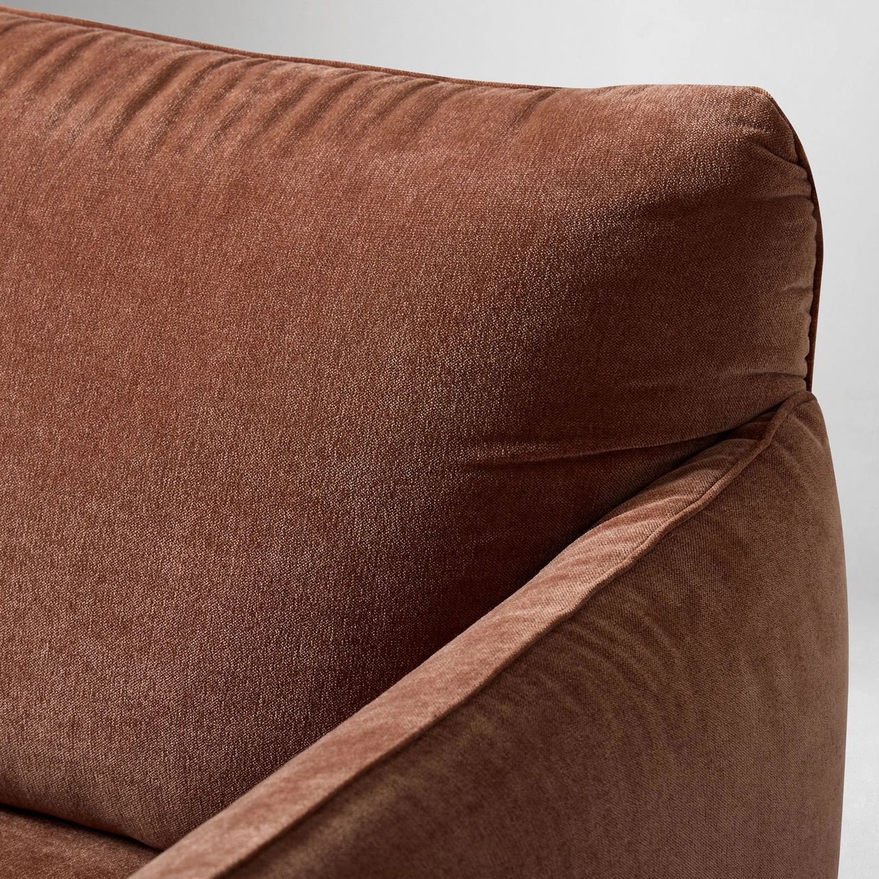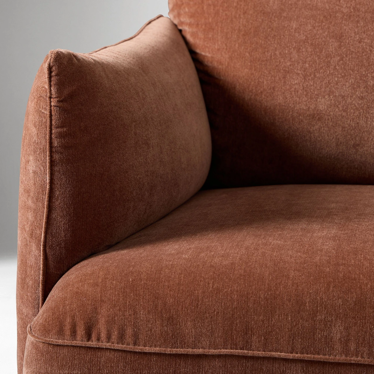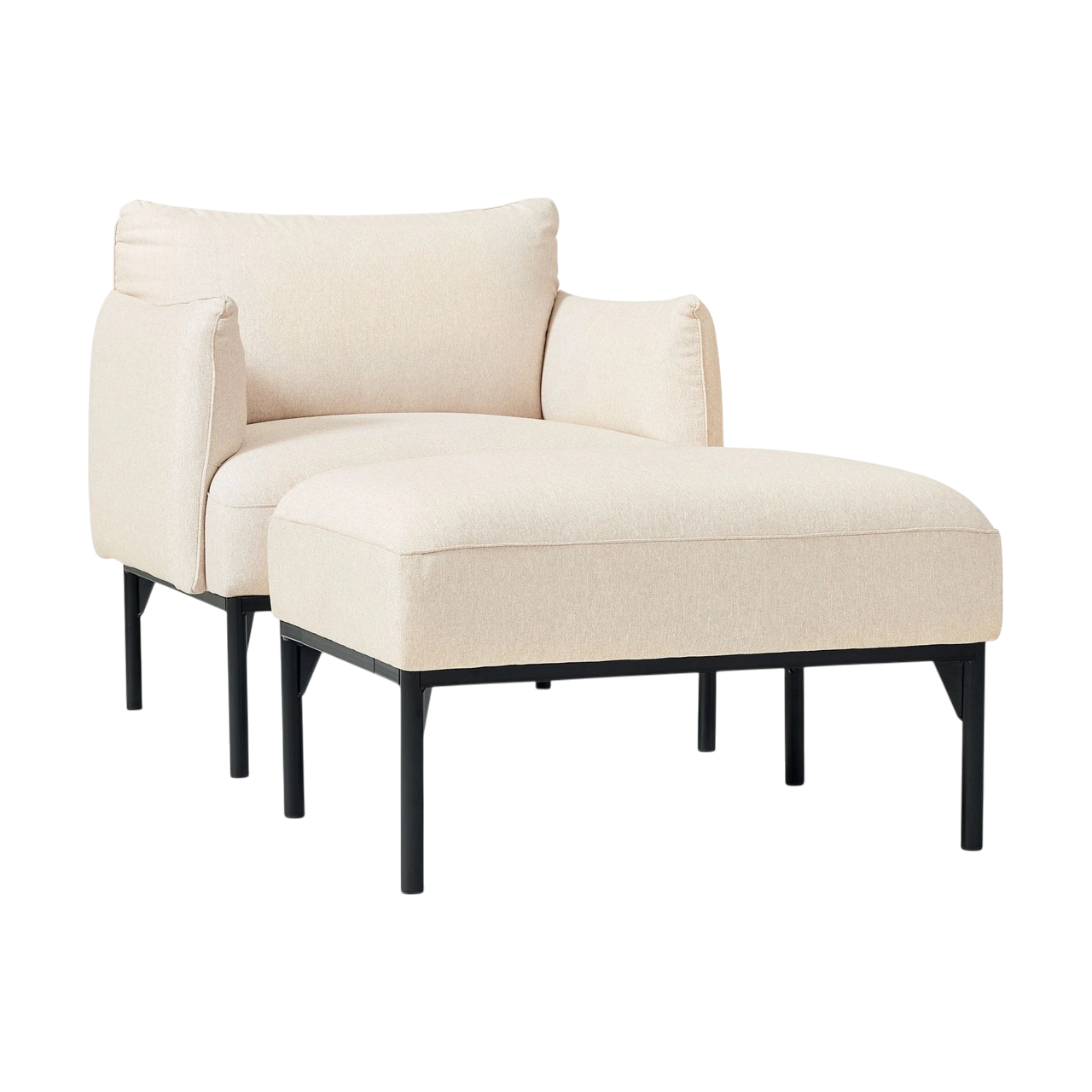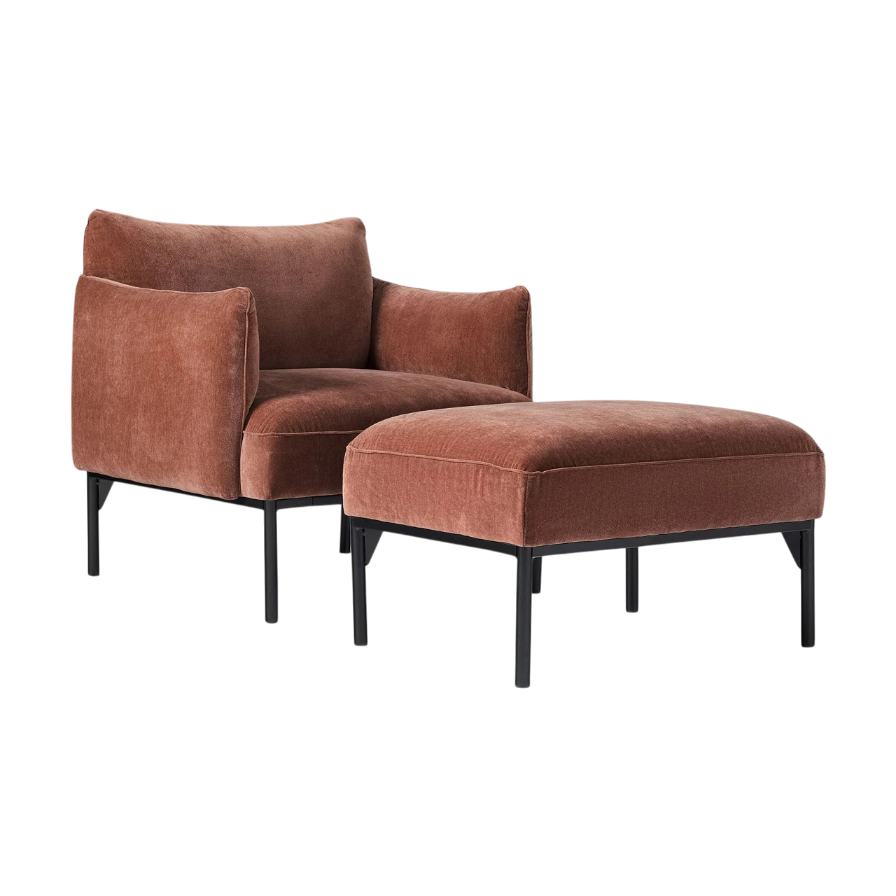 The Penn Chair combines modern structure with relaxed comfort. Its soft upholstery and subtly curved arms create an inviting shape, while the raised metal base gives the design a light, contemporary feel. The mix of textures—from plush fabric to sleek metal—adds visual depth without overwhelming a space.