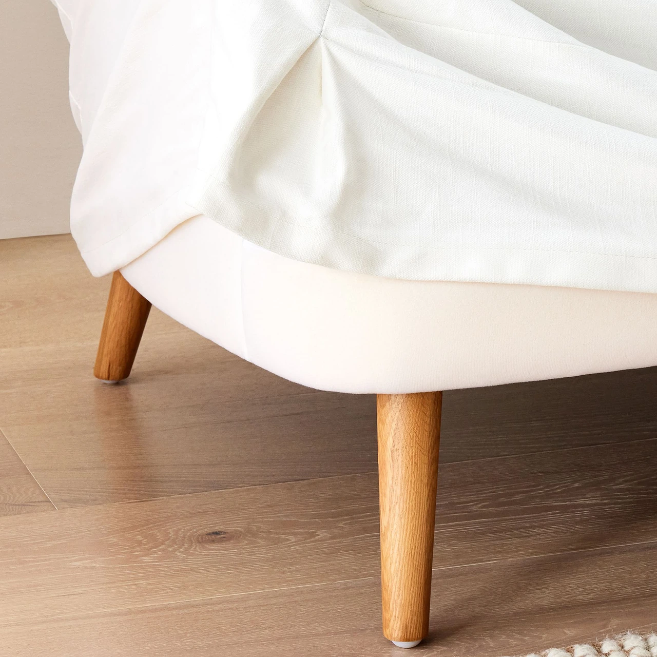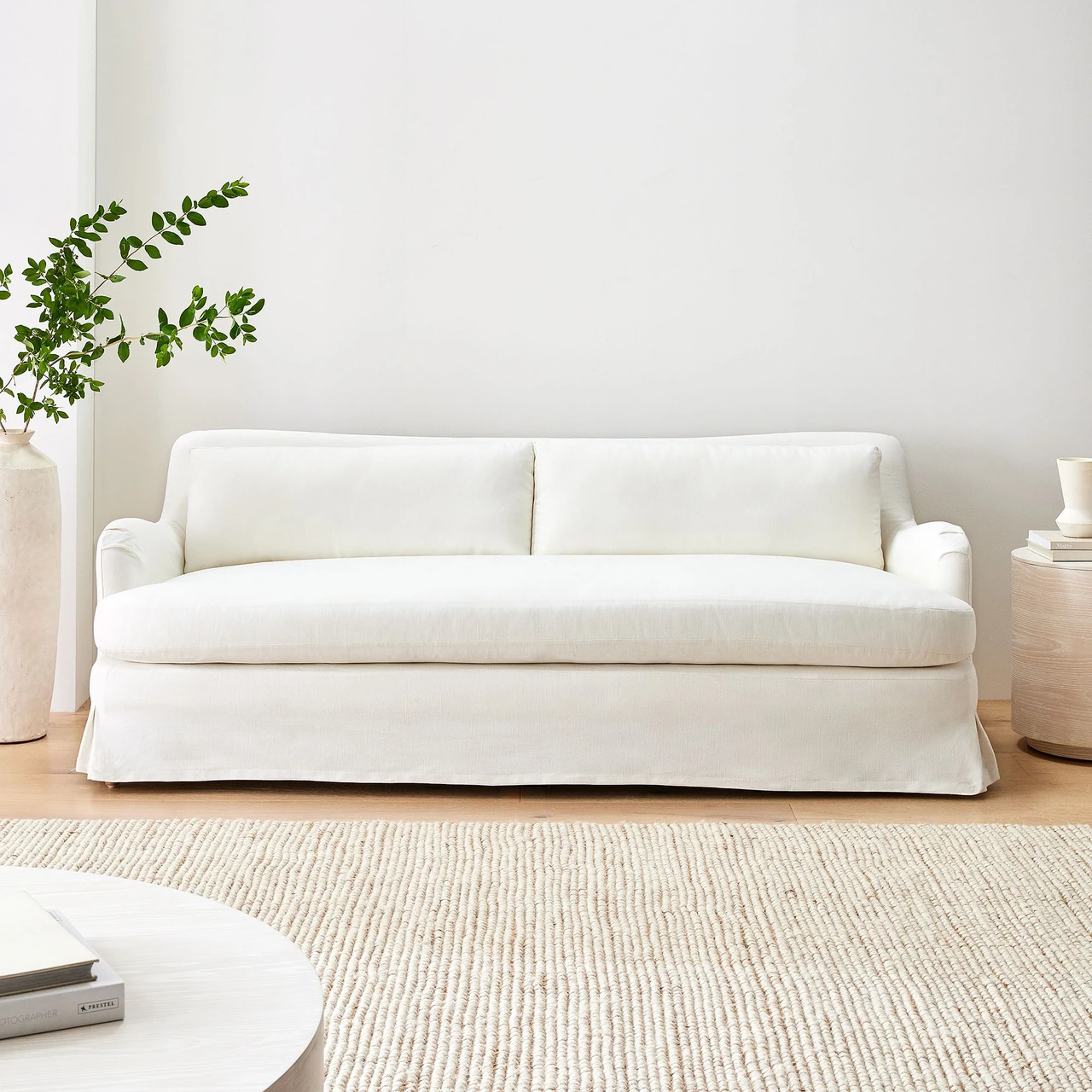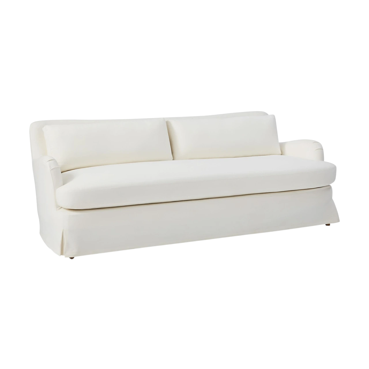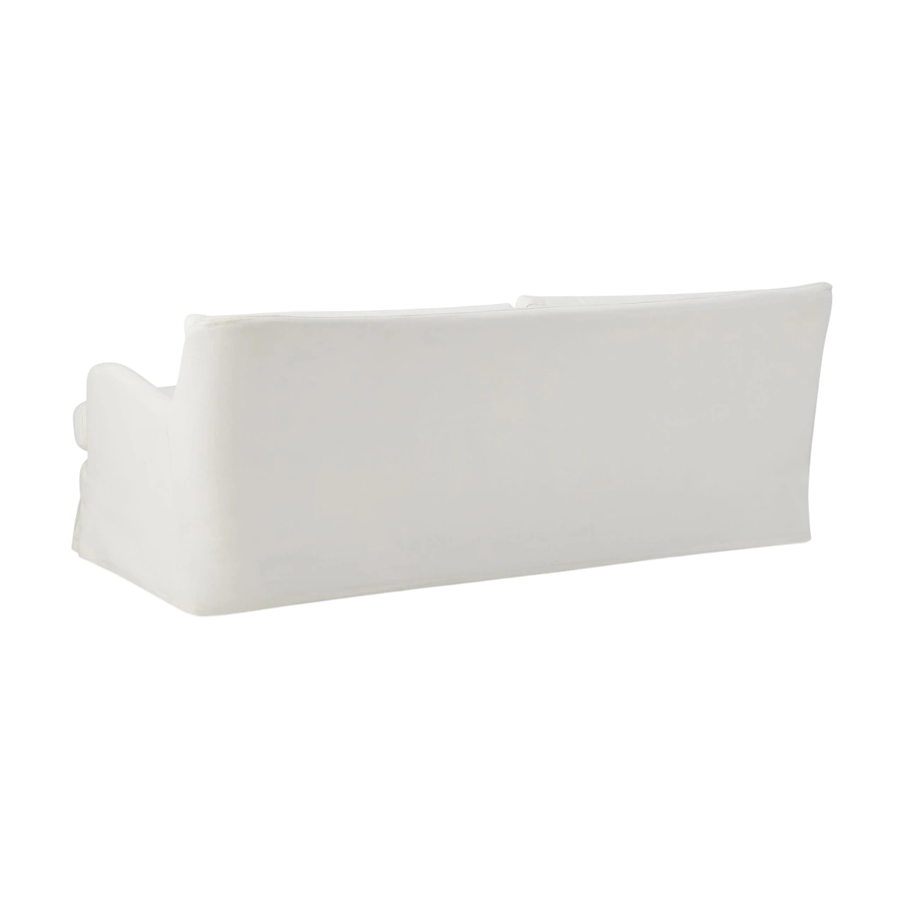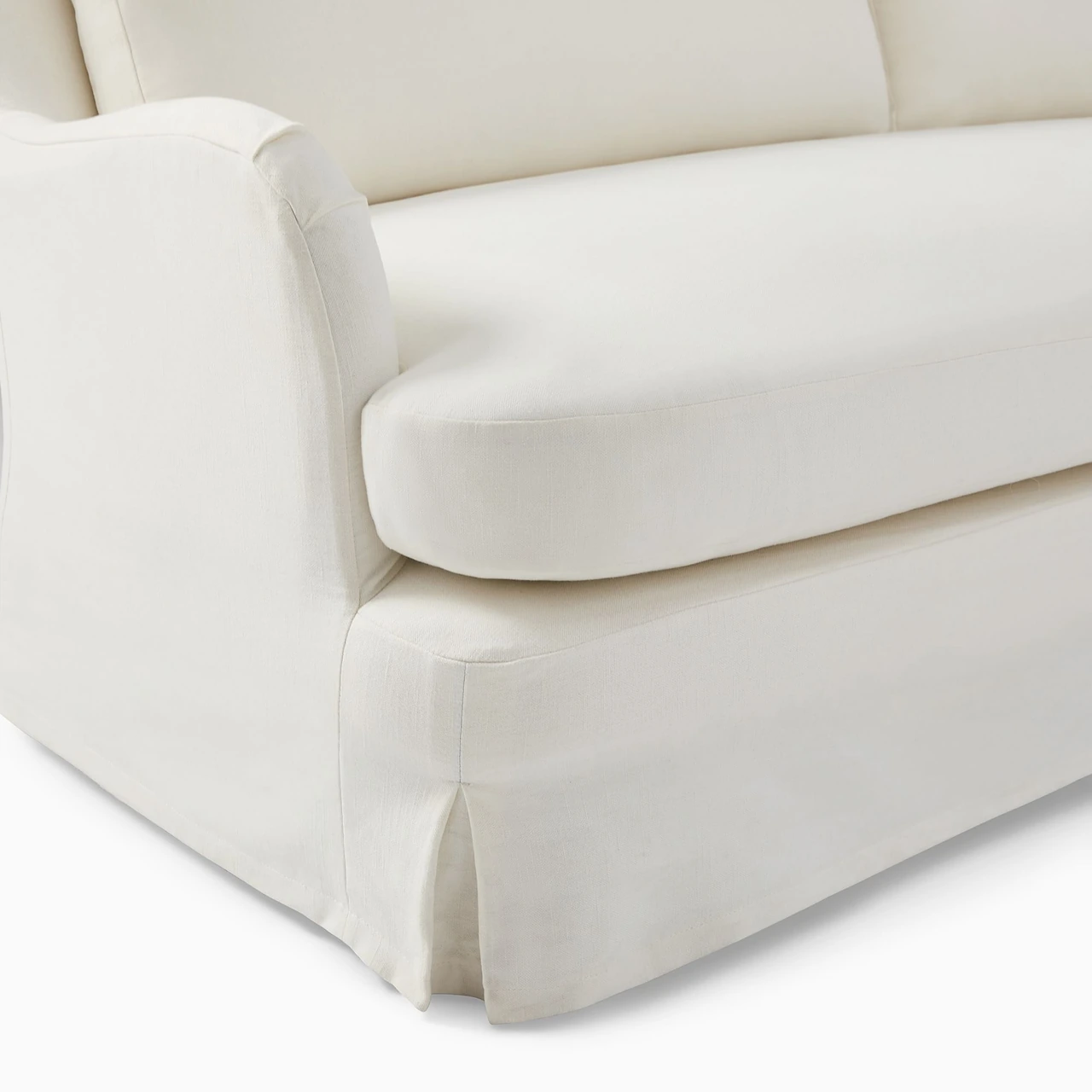 The Sophie Skirted Slipcover Sofa blends traditional comfort with a modern, tailored silhouette. Its winged arms and bench-style seat give it a refined look, while the full-length slipcover softens the overall form.