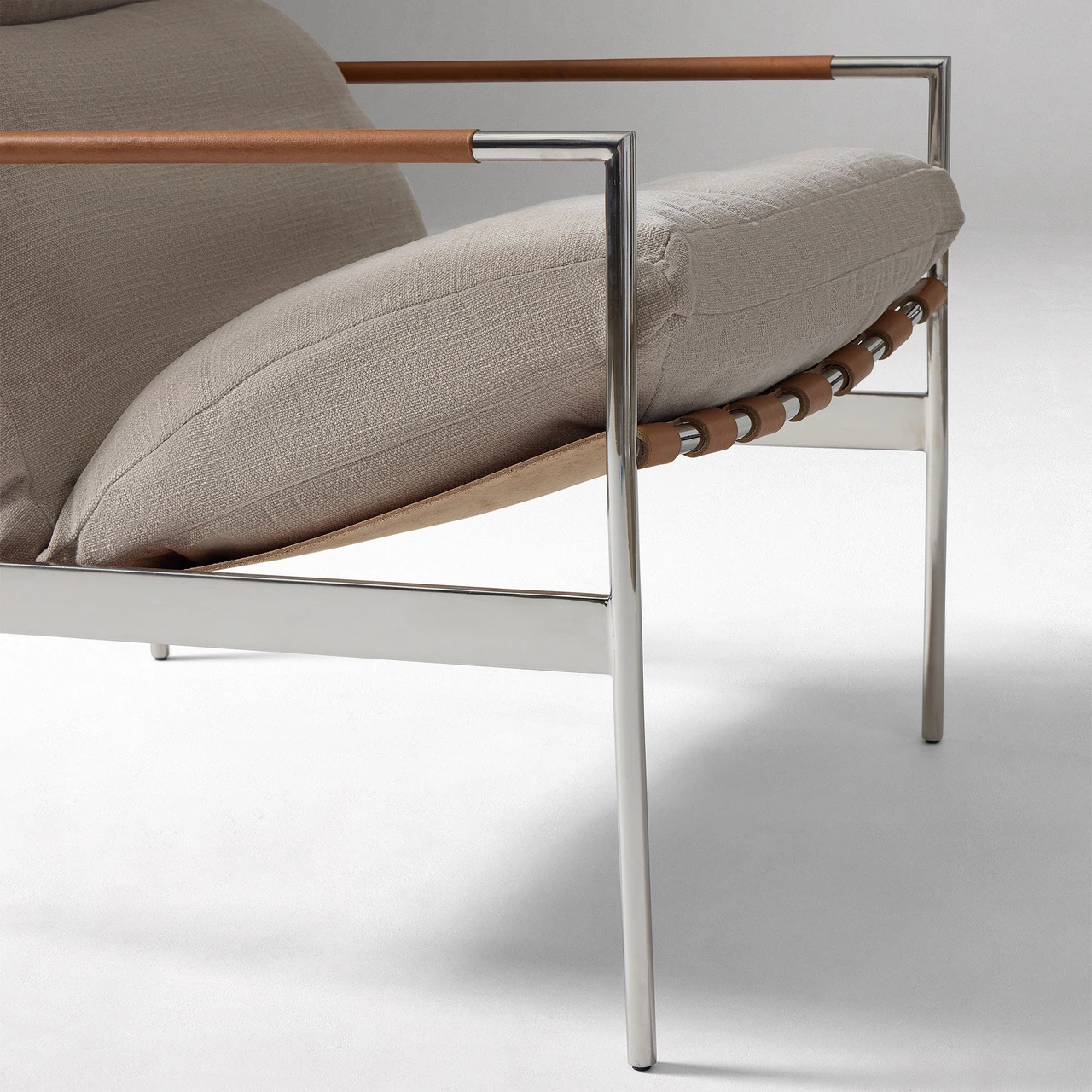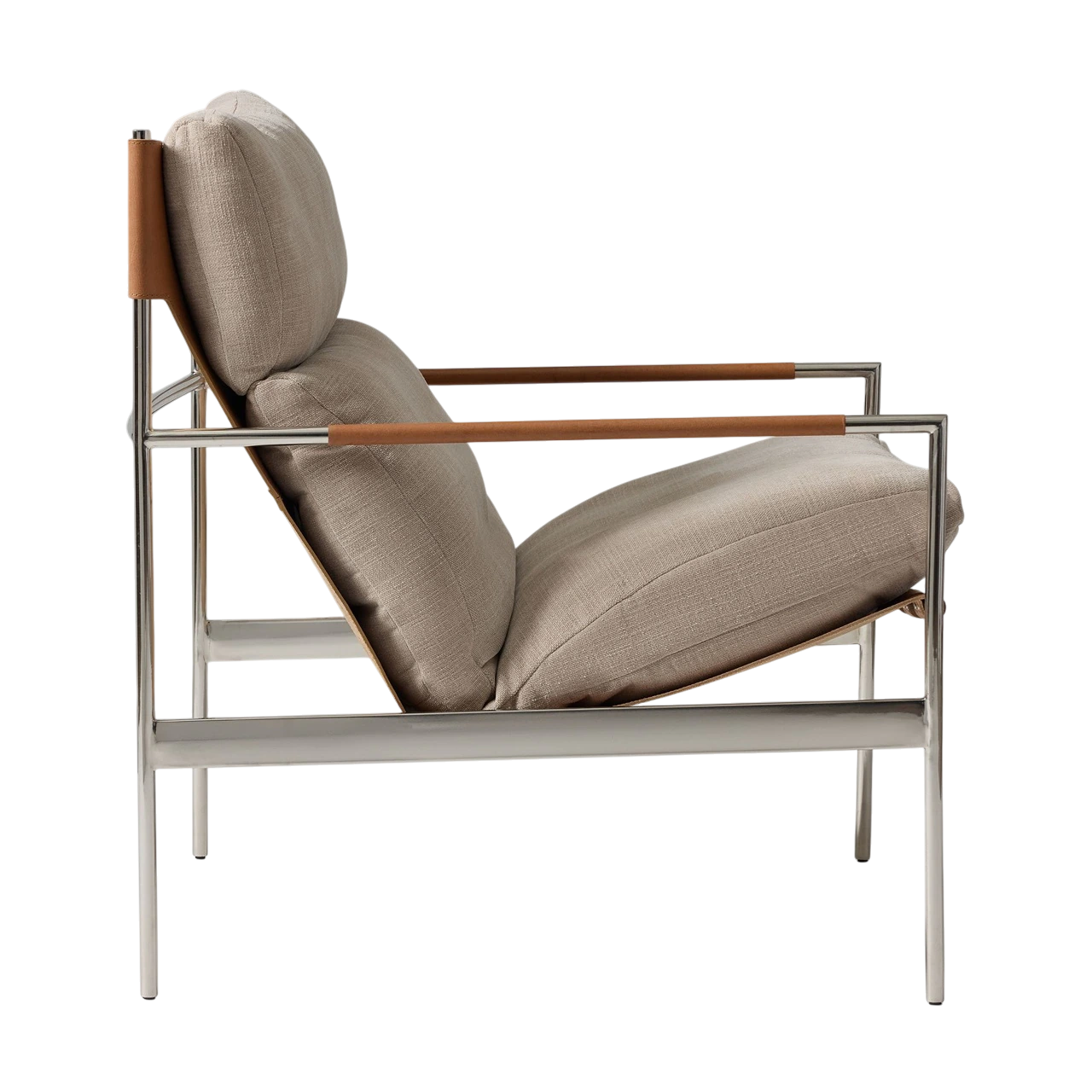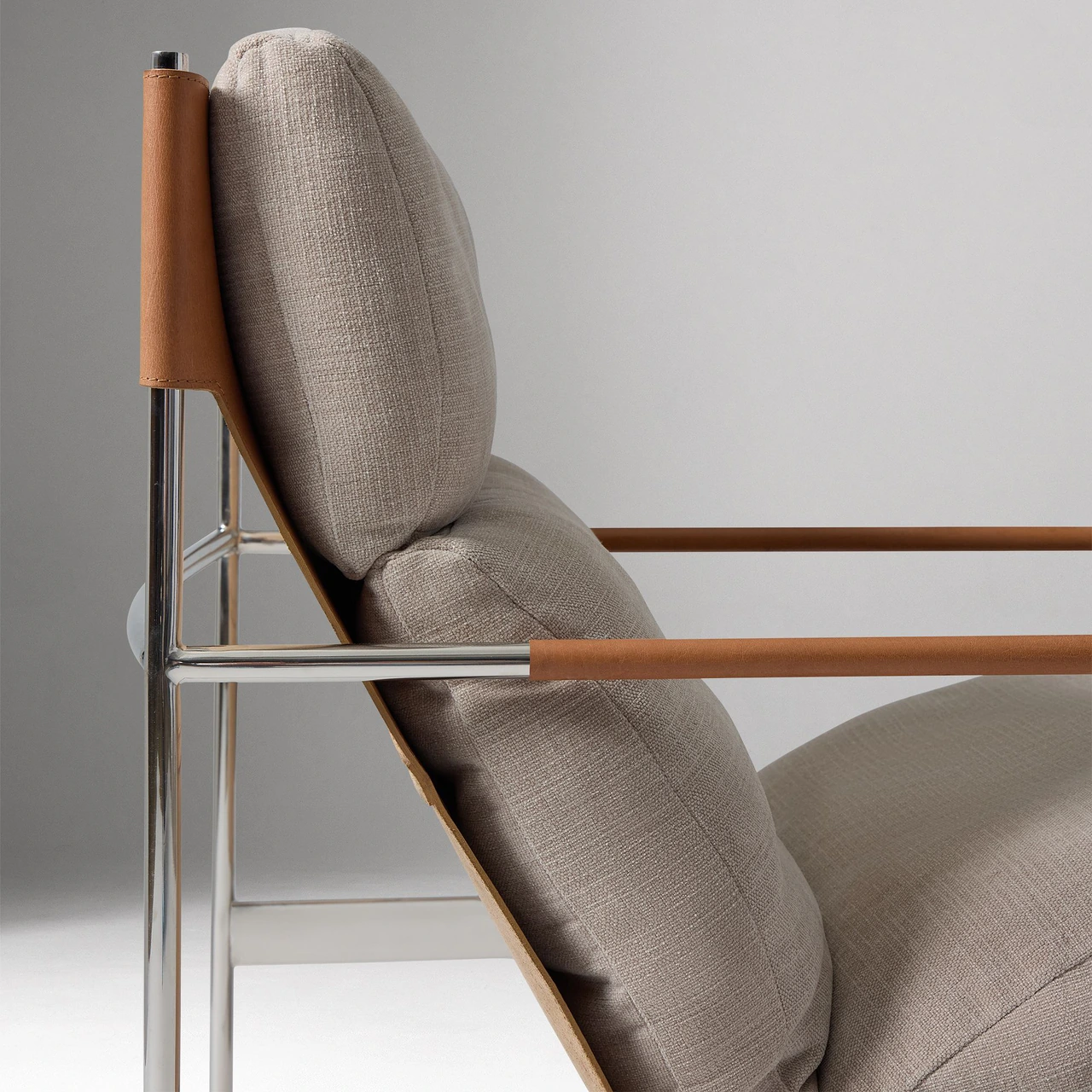 Designed for both visual impact and ease, the chair’s polished steel frame contrasts with the tactile warmth of fabric and leather detailing. With its sink-in comfort and sculptural form, the Stuart Sling Chair makes a striking addition to contemporary interiors or refined reading spaces.
