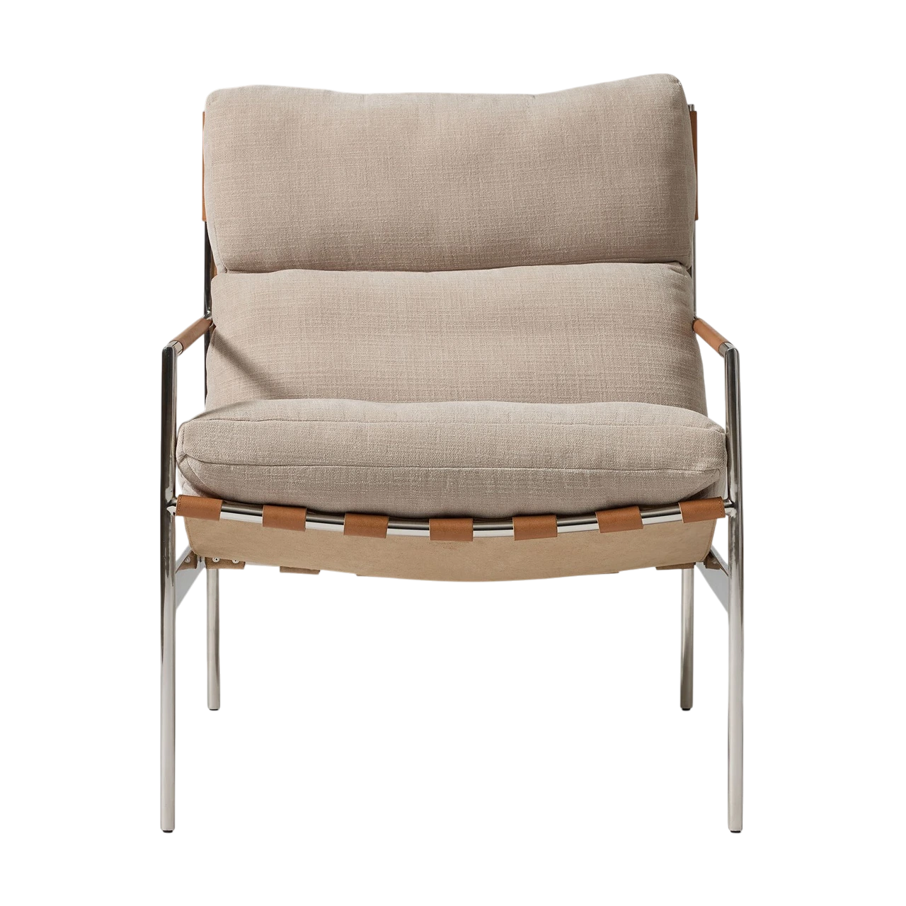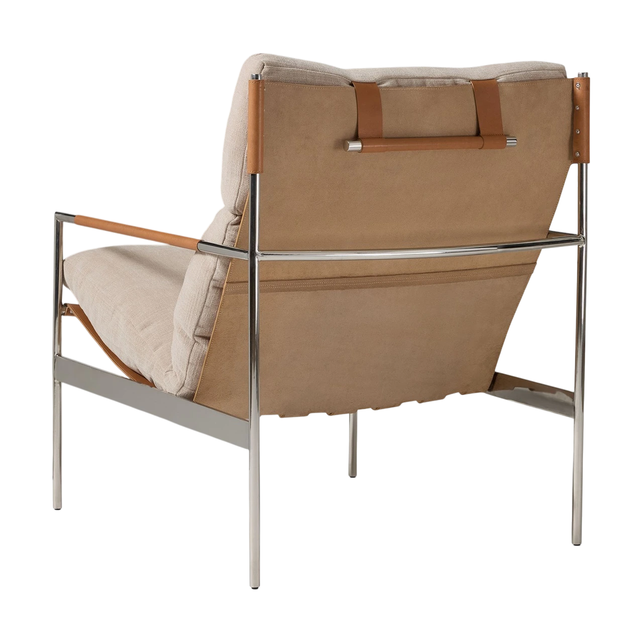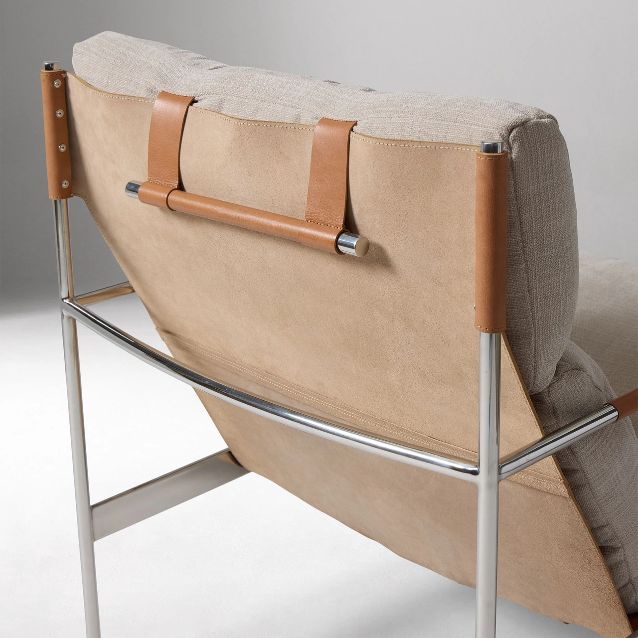 Designed for both visual impact and ease, the chair’s polished steel frame contrasts with the tactile warmth of fabric and leather detailing. With its sink-in comfort and sculptural form, the Stuart Sling Chair makes a striking addition to contemporary interiors or refined reading spaces.