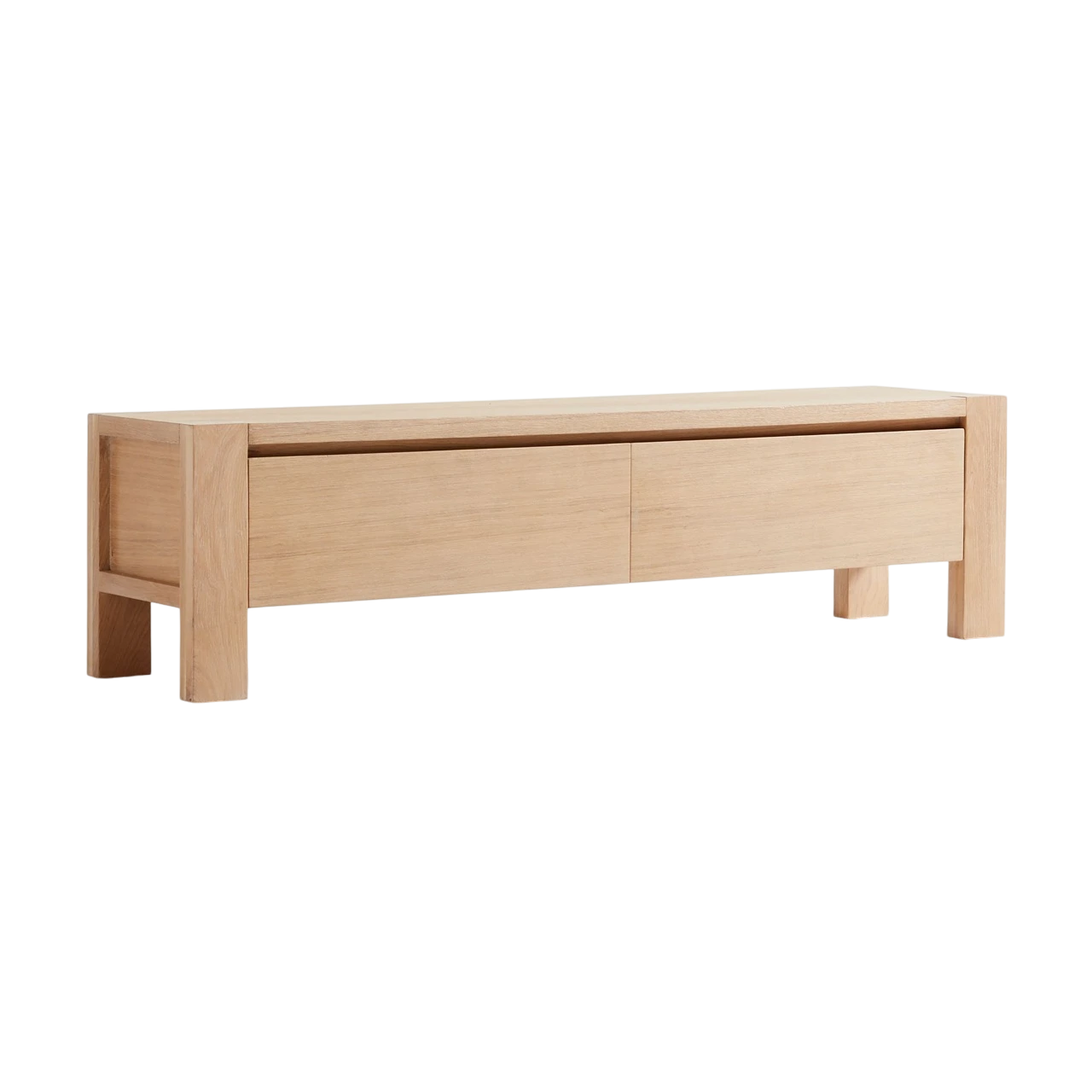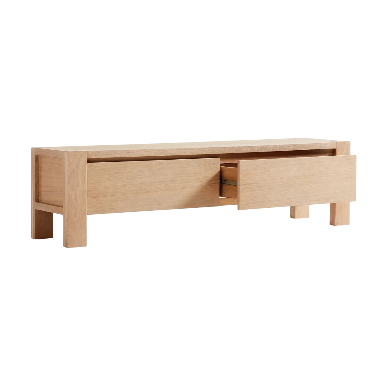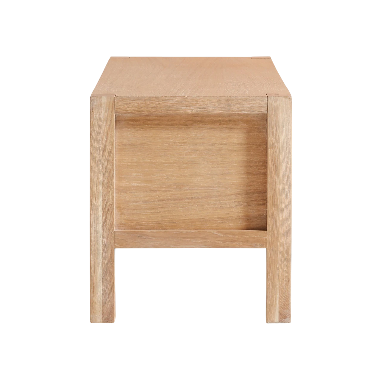 The Terra Storage Bench is made of natural white oak with a soft, hand-applied finish that highlights the unique grain and tonal variations of the wood. Its simple silhouette is detailed with recessed side panels, square legs, and two flat-front drawers for storage.